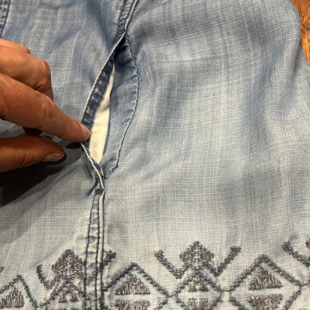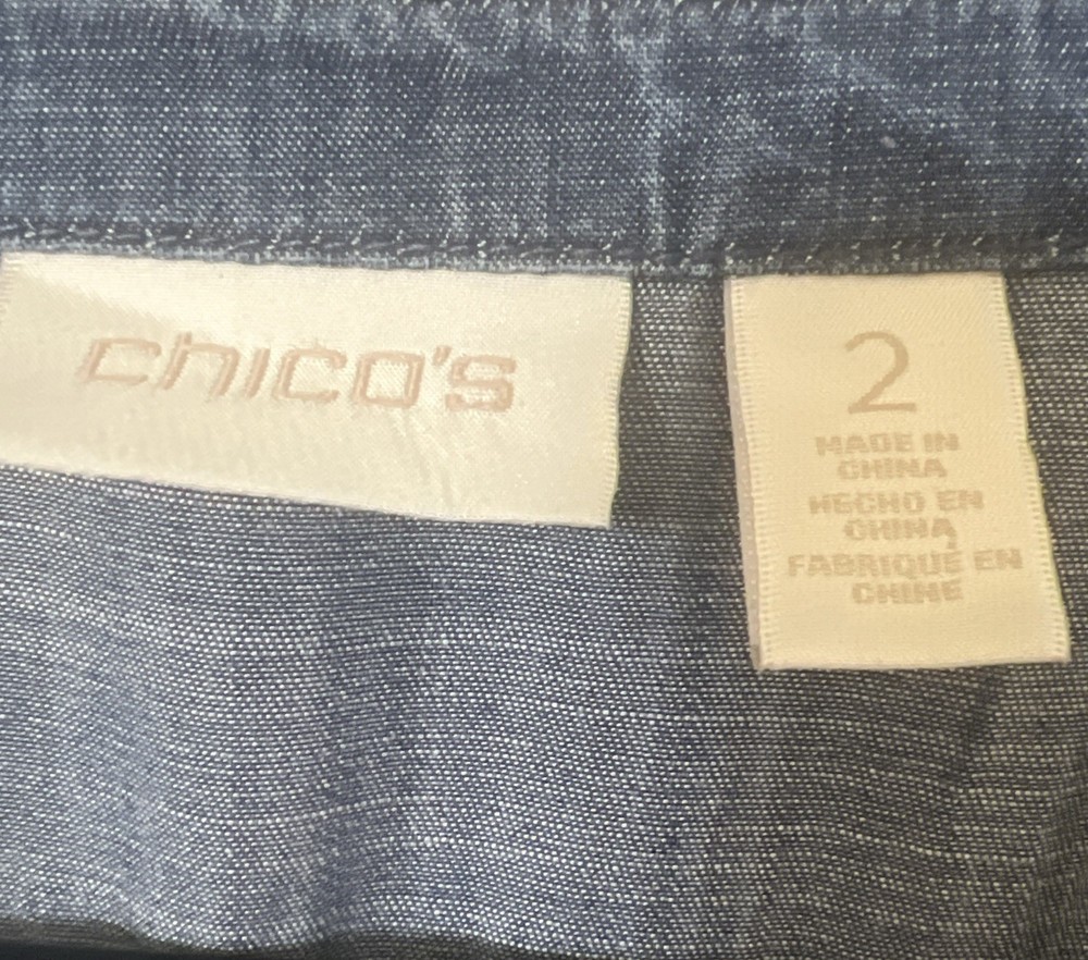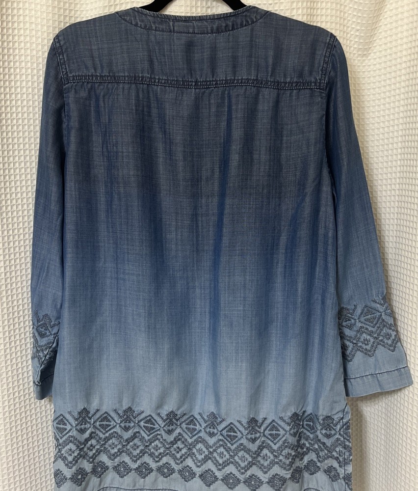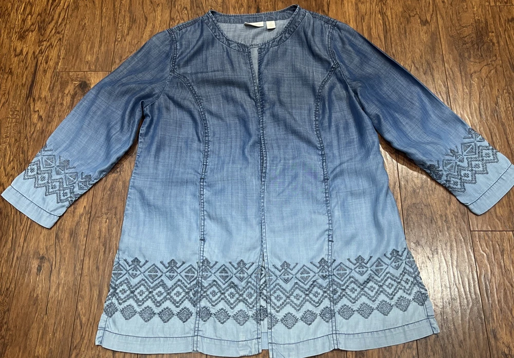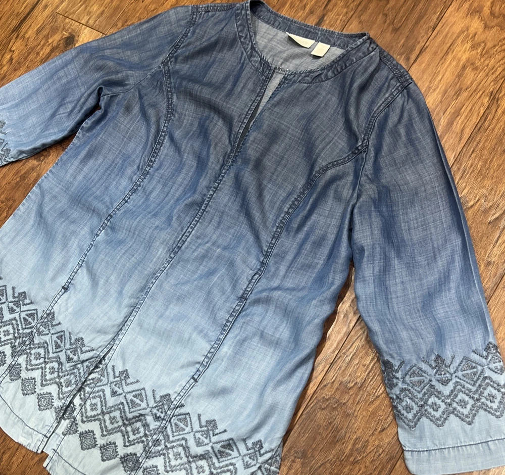 This CHICO's Jacket is a stylish and versatile option for any woman's wardrobe. The dip-dye chambray color and embroidered design give it a unique and trendy look, perfect for casual, travel, or workwear occasions. Made from lightweight lyocell fabric, this mid-length duster jacket features a relaxed fit and 3/4 sleeves, making it comfortable for all-day wear. With its open front closure and convenient pockets, this jacket is both fashionable and functional, ideal for the summer, fall, or spring seasons.