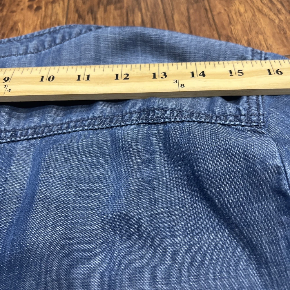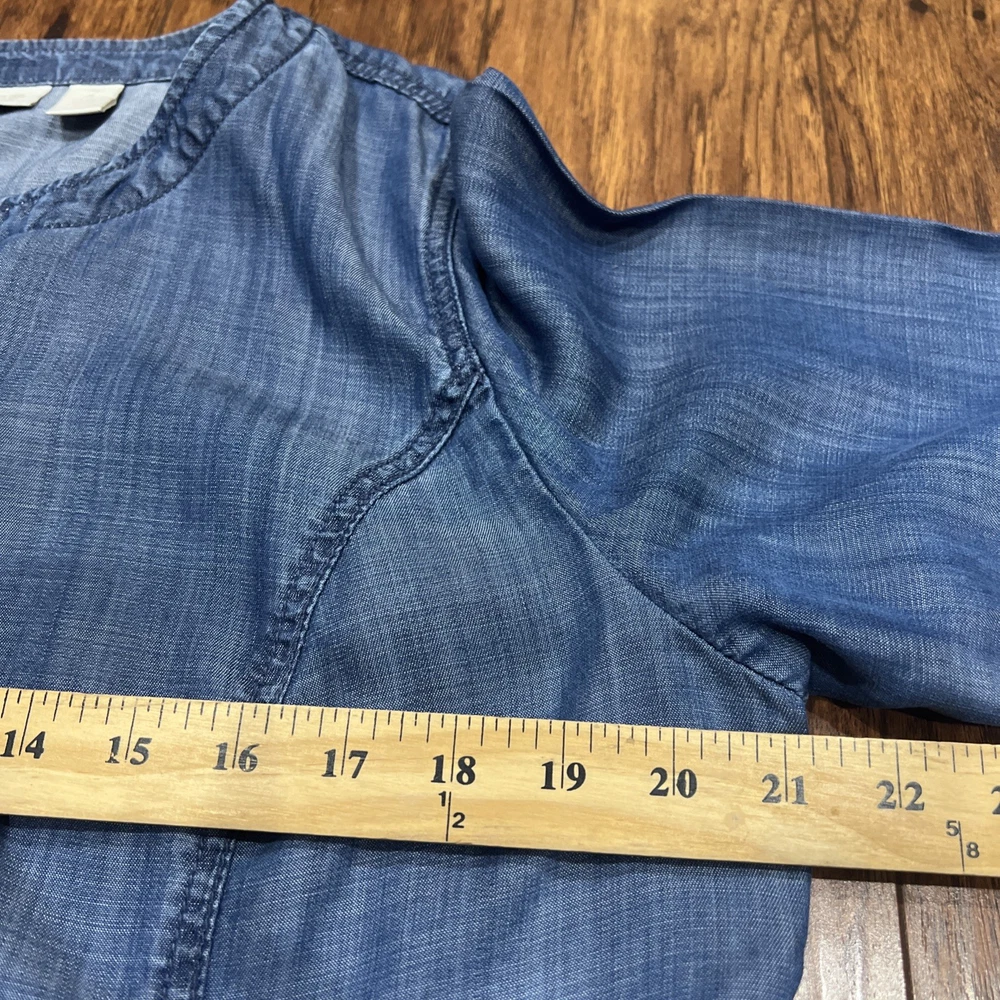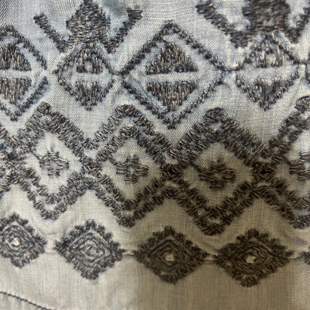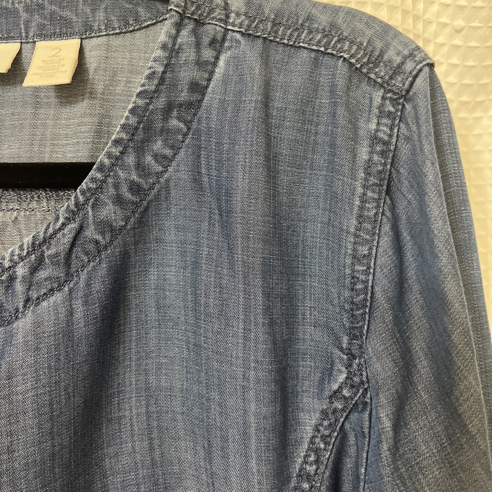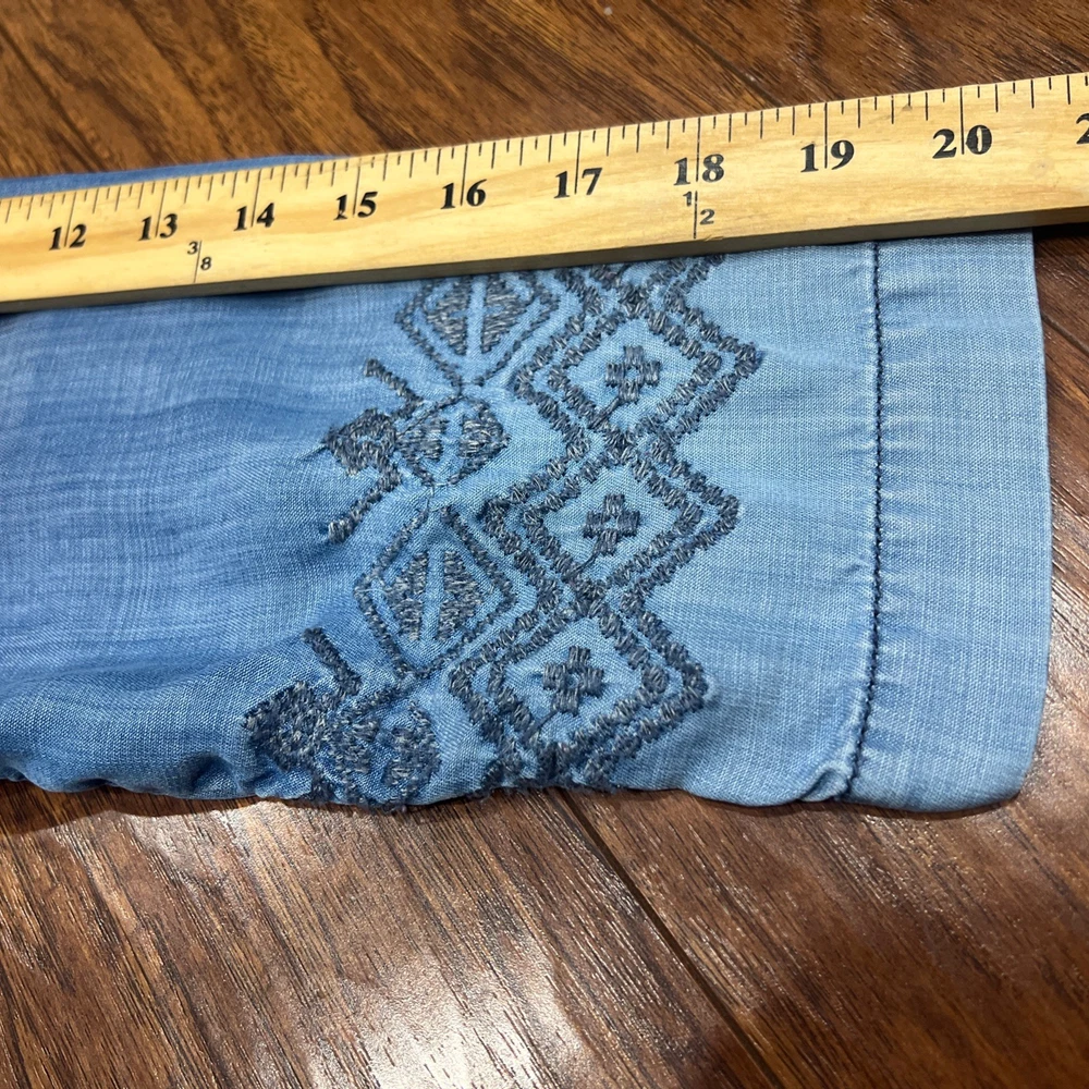 This CHICO's Jacket is a stylish and versatile option for any woman's wardrobe. The dip-dye chambray color and embroidered design give it a unique and trendy look, perfect for casual, travel, or workwear occasions. Made from lightweight lyocell fabric, this mid-length duster jacket features a relaxed fit and 3/4 sleeves, making it comfortable for all-day wear. With its open front closure and convenient pockets, this jacket is both fashionable and functional, ideal for the summer, fall, or spring seasons.