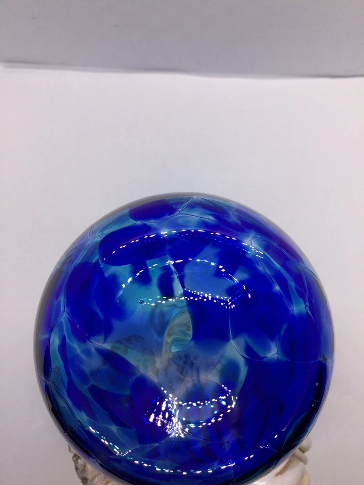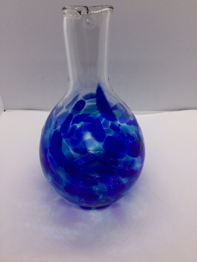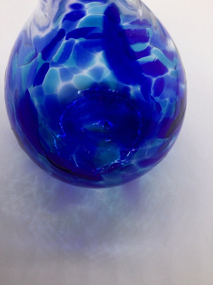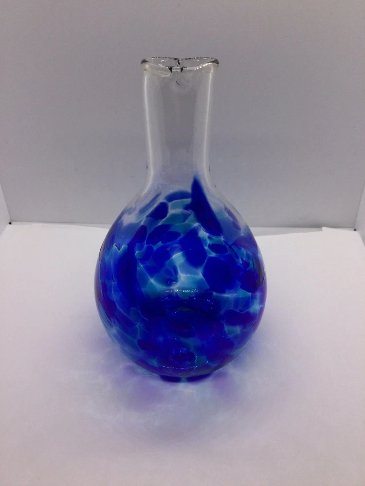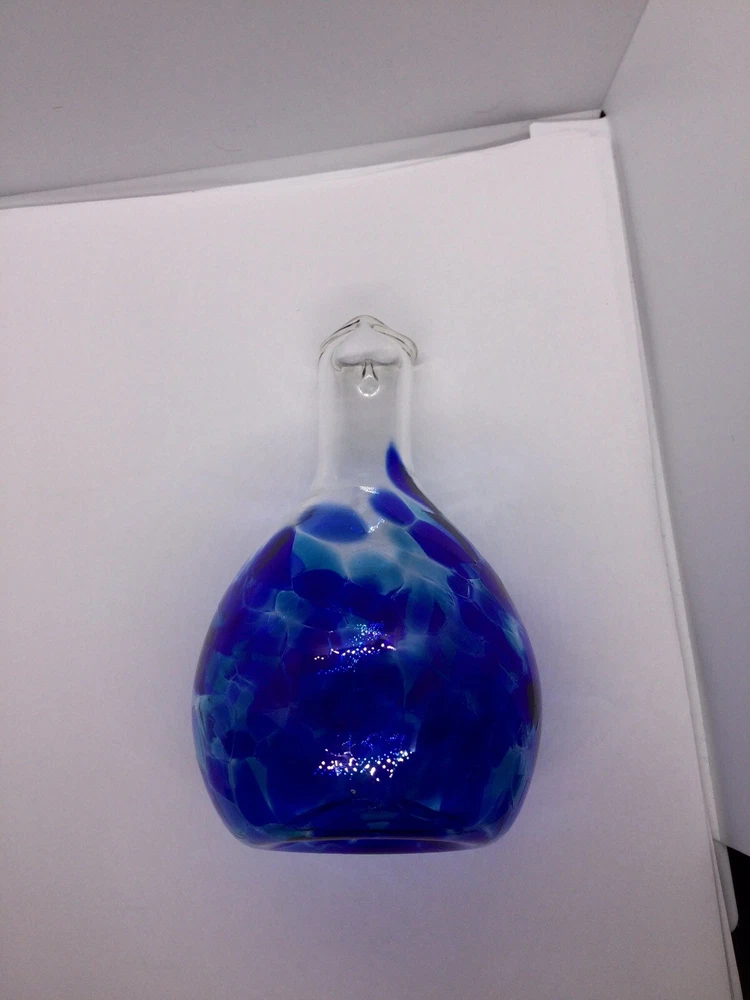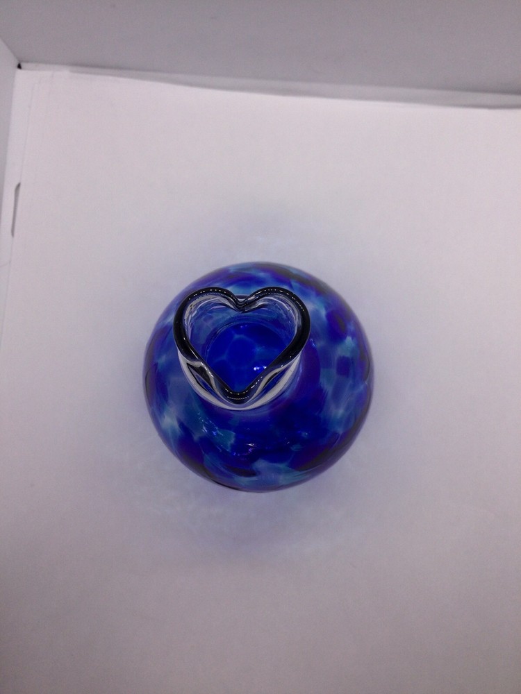 CIRCLE OF FRIENDS BLOWN GLASS BUD VASE WITH HEART SHAPED MOUTH. Beautiful condition no wear at all ..the blue is stunning..even more beautiful in person…the neck is clear with the mouth shaped like a heart…it is very delicate..perfect gift for a friend or significant other…it stands 5.5 inches and only weighs 4.1 oz the mouth opening is one inch…such a pretty piece…made in Rhode Island USA