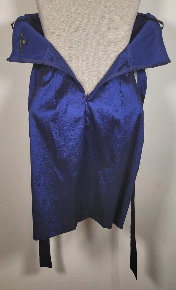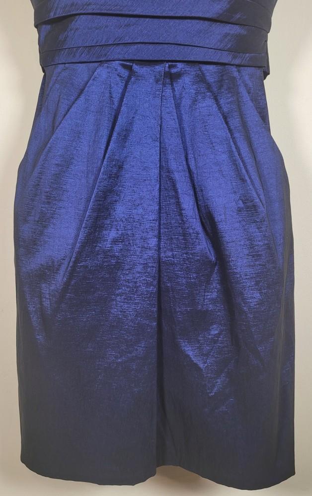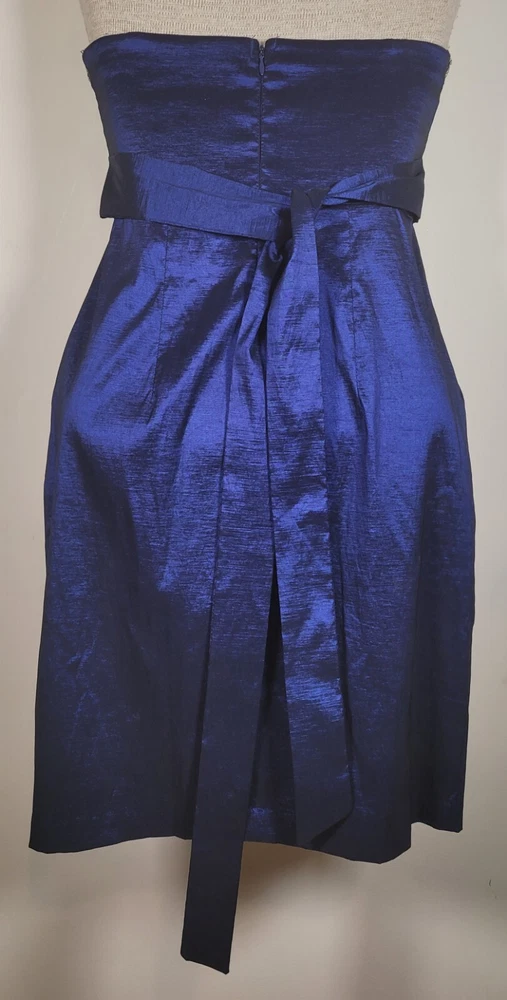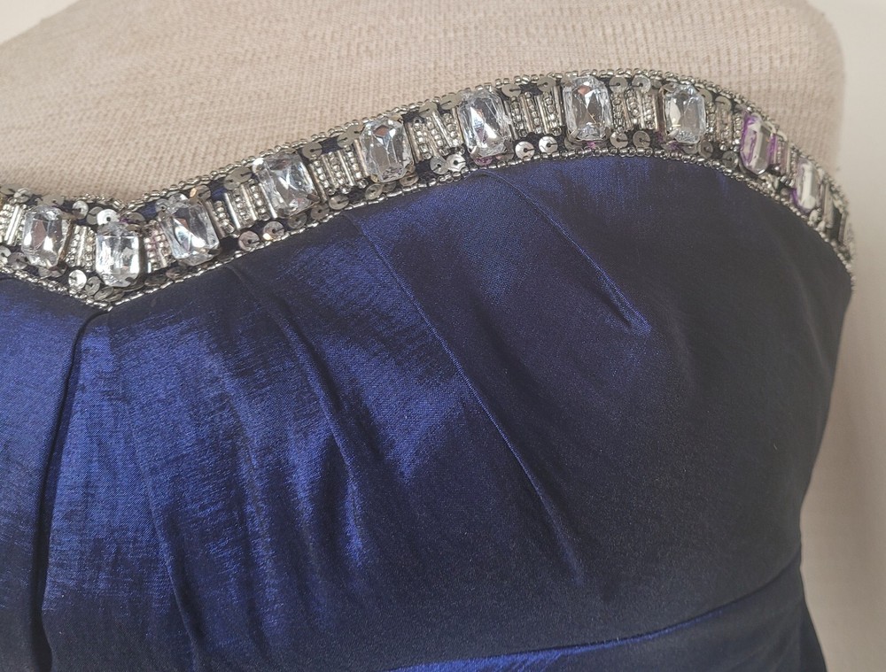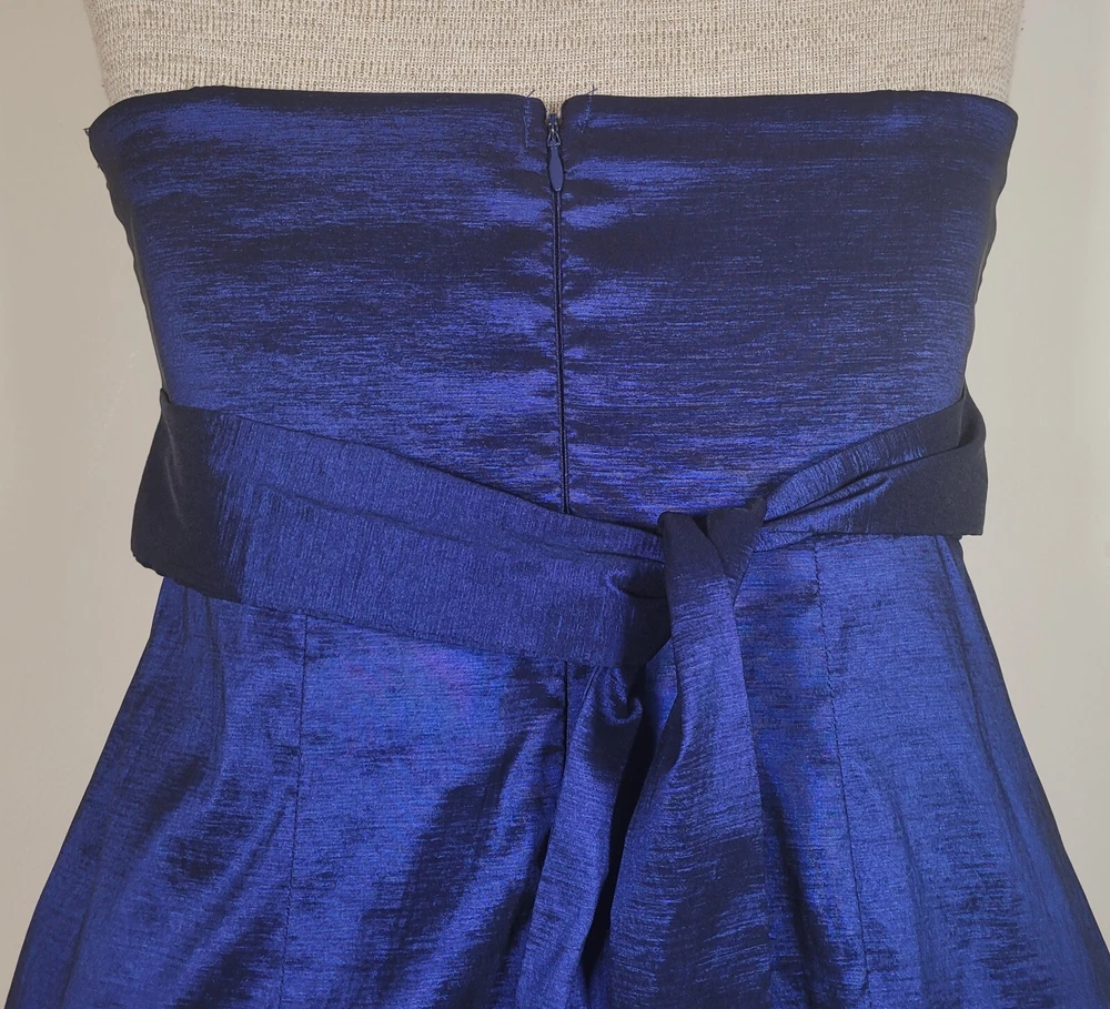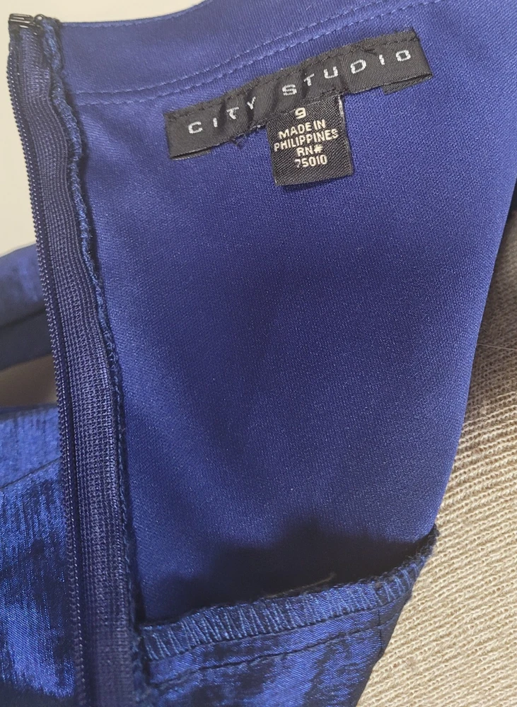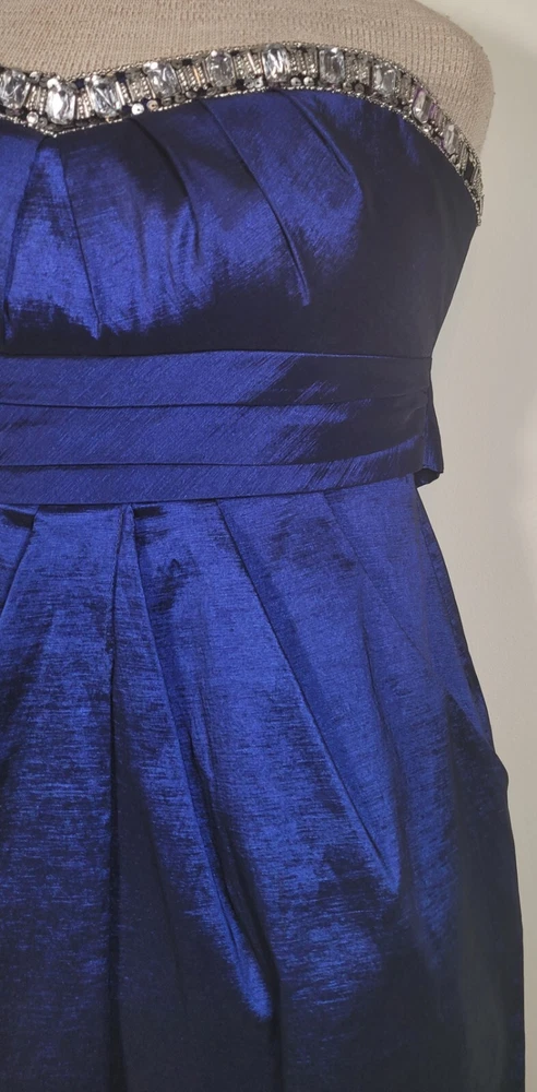 City Studios Juniors / Teen Size 9 Waist measures approximately 26 inches From bottom of the waist ribbon to bottom hem is 20 inches Colors Metallic blue The bodice is a sweetheart design with rhinestone. Their is light ruching at the top of the bodice. Light padding in bodice. Blue Ribbon with ruching on front that is loose in the back for a bow with adjustability for waist. Your dress will be shipped same day as payment or next business day. prom14