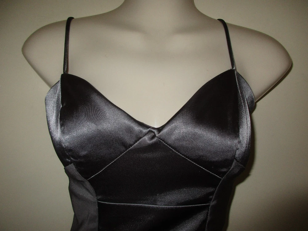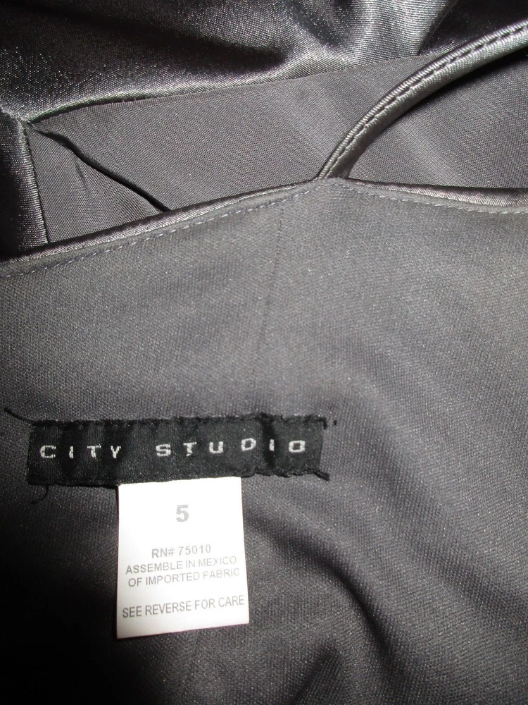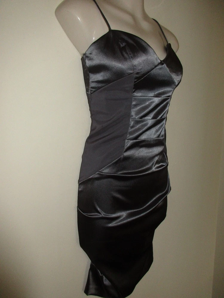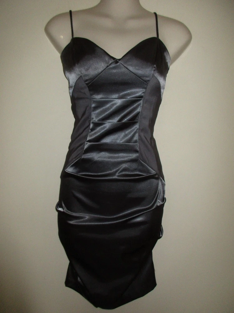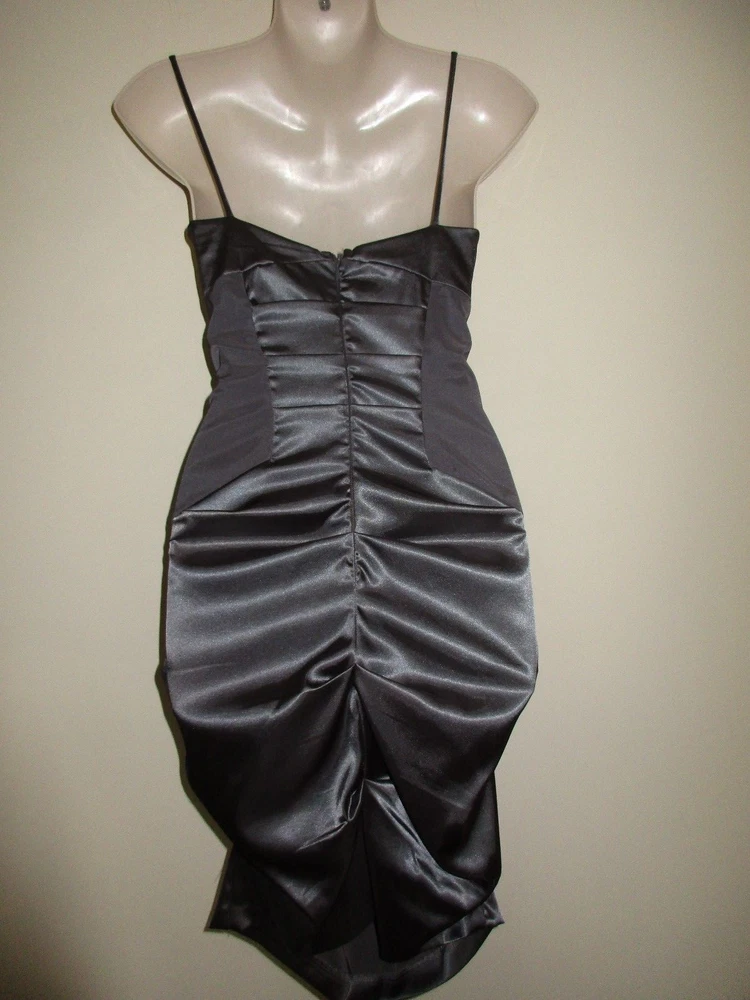 Beautiful silver-gray rushed and folded stretch satin dress with strategically placed matte inserts at the sides made by CITY STUDIO in a Junior size 5. This stunning, bodycon sexy dress has heart-shaped bust-line with light padding, spaghetti straps and is closed in the back by a long hidden zipper plus hook/nook closure. Worn just once, freshly cleaned and in great condition. Size 5. Bust: 15 1/4in (armpit to armpit) waist: 13.5in Hip: 16 3/4in Length: 28in (armpit to hem) All measurements taken with the dress flat on the ground, unstretched. Please take a look at my other beautiful items. Send me an email with any questions you might have; incl. about combined shipping (provided). Thank you!