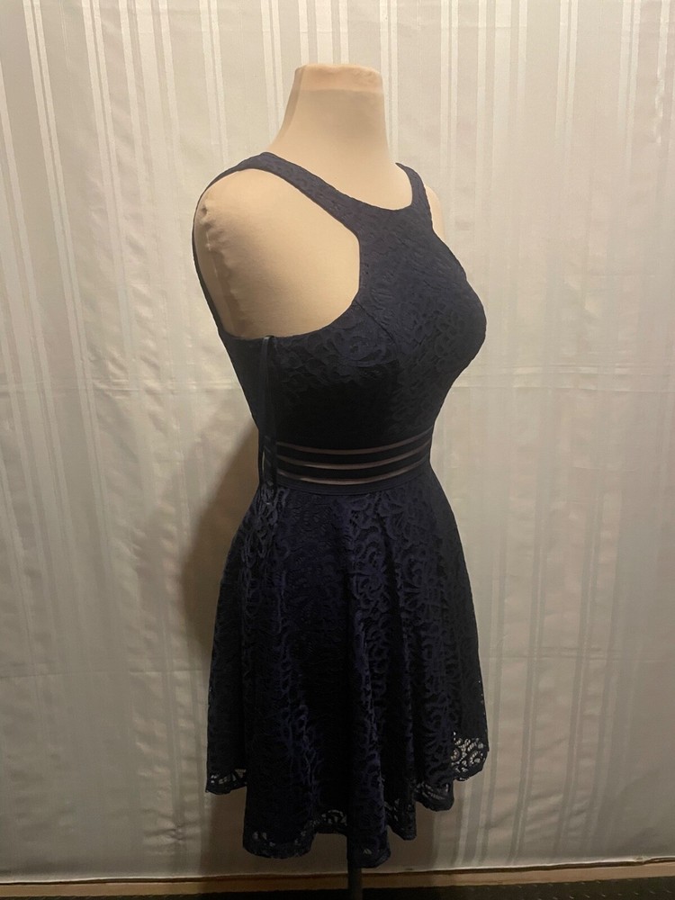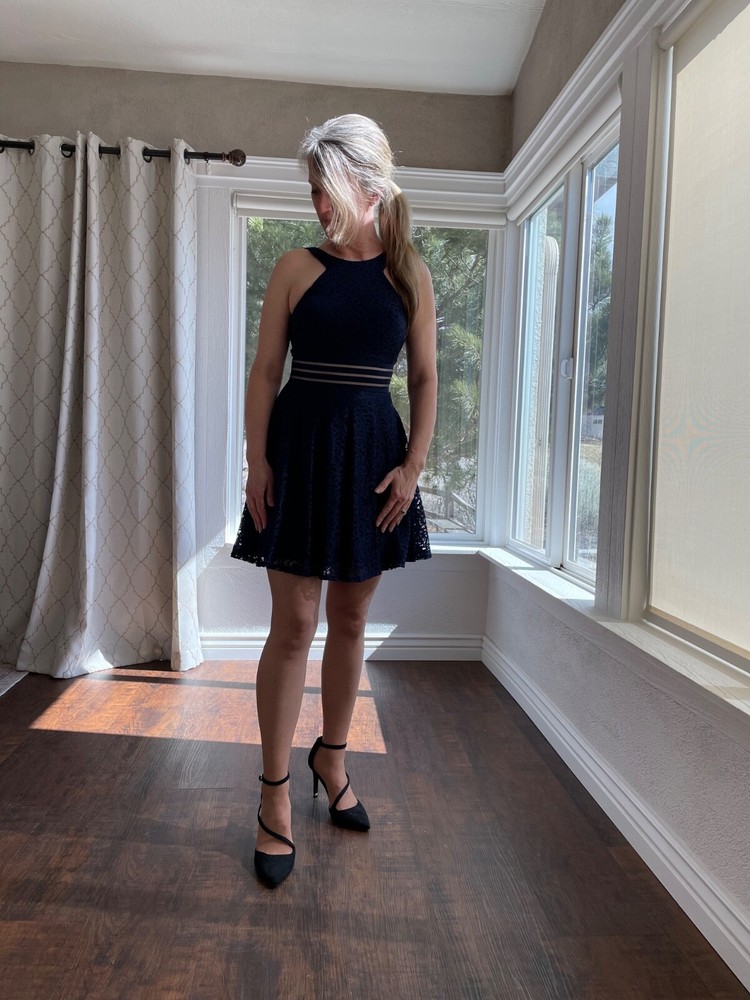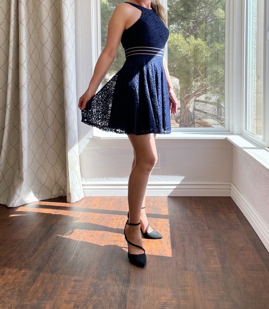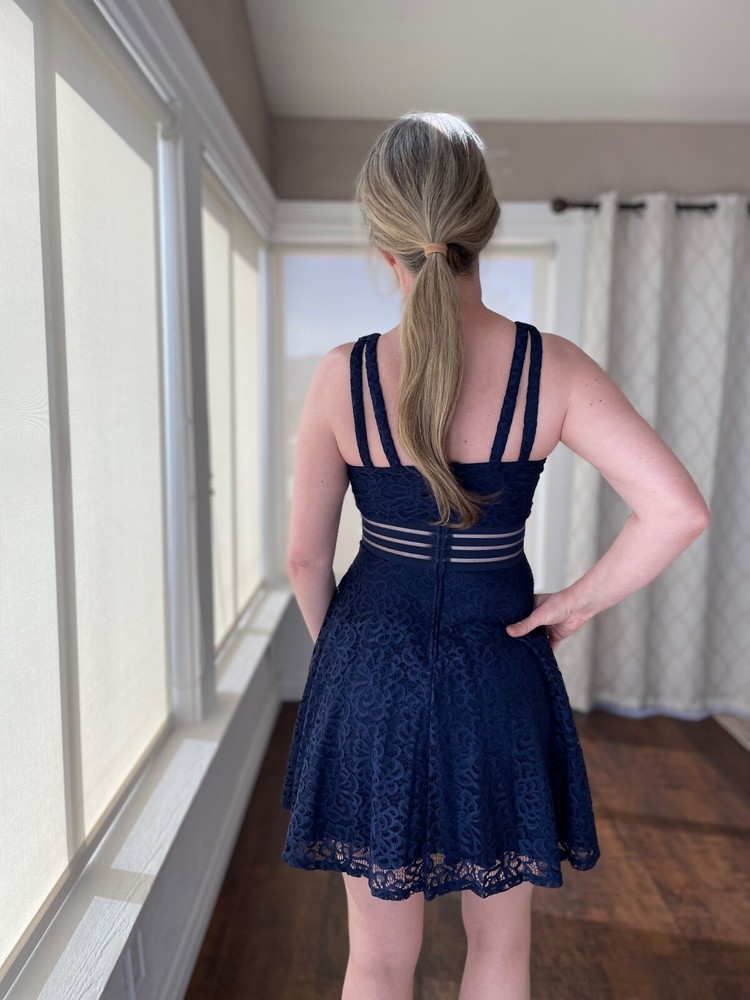 This dress is absolutely stunning—perfect for a night out! The dark blue color and lace detailing add a touch of elegance, while the sweetheart neckline and midi length flatter any figure. The fabric is comfortable yet hugs the body beautifully, and the zipper back ensures a secure fit. I felt confident and sexy wearing it to a cocktail party, and received so many compliments! Definitely a must-have for any special occasion.