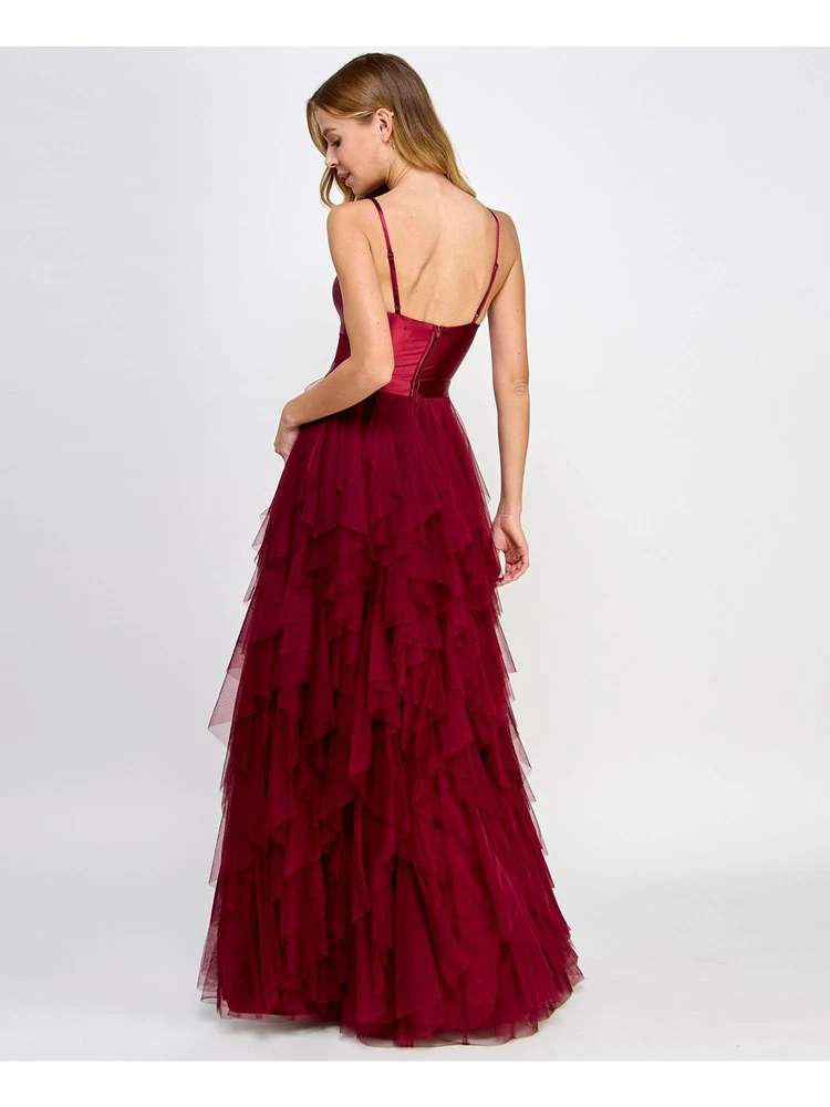 Absolutely stunning gown! The maroon color is rich and elegant, and the cascade ruffle detail adds a gorgeous, dramatic flair. The corset-style fit is super flattering, hugs curves perfectly, and the zippered back ensures a snug fit. The sweetheart neckline and spaghetti straps give it a romantic touch while keeping it classy. Perfect for formal events, it looks way more expensive than it is. Feels luxurious, fits true to size, and gets tons of compliments. Dry clean only, but totally worth it for such a showstopper! LOVE this dress!