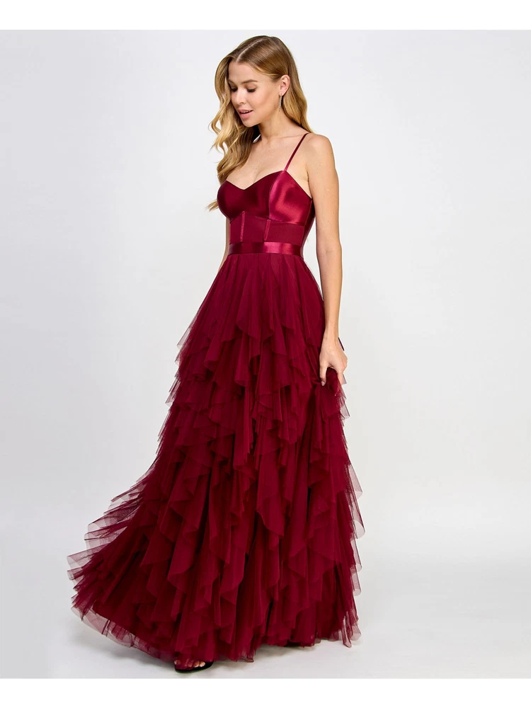 This dress is absolutely stunning! The maroon color is rich and elegant, and the cascade ruffle detail adds a gorgeous, feminine touch. The corset-style bodice fits perfectly and the sweetheart neckline is super flattering. The spaghetti straps keep it sleek, while the full-length gown makes it perfect for formal events. Even though it’s dry clean only, the high-quality polyester feels luxurious. Such a showstopper—worth every penny!