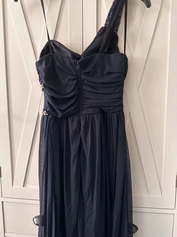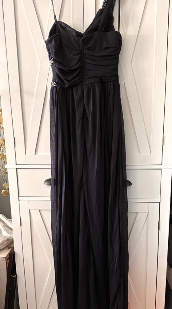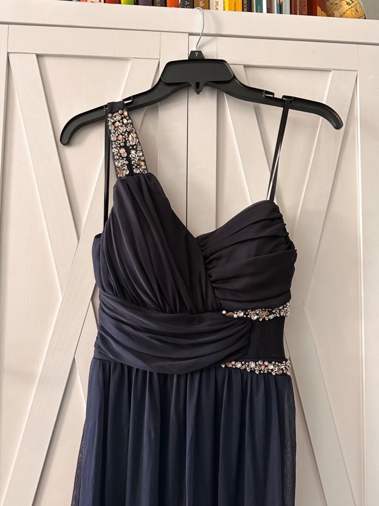 This stunning navy blue gown by City Studio is perfect for any formal occasion or party. The dress features a sweetheart neckline, sleeveless style, and full-length skirt with beautiful sequin accents. Made from 100% polyester fabric, this dress is both elegant and comfortable to wear. The dress is available in size 7 and is designed for juniors. It is a solid pattern with sheer features and a one-strap design. This dress should be dry cleaned only to maintain its beauty. Get ready to turn heads in this gorgeous sequin gown that is perfect for any season.
