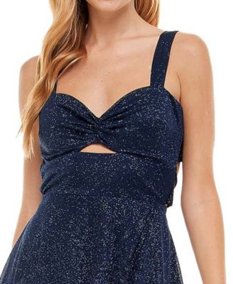 This dress is absolutely stunning! The navy glitter adds a touch of glam, and the sweetheart neckline with cutout details makes it perfect for parties. The hi-lo hem gives it a fun, flirty vibe, and the fit is so flattering. Even though it was a display item, it looks brand new—no noticeable flaws. The material feels high-quality, and the design is unique yet versatile. Definitely worth it for a night out or special occasion!