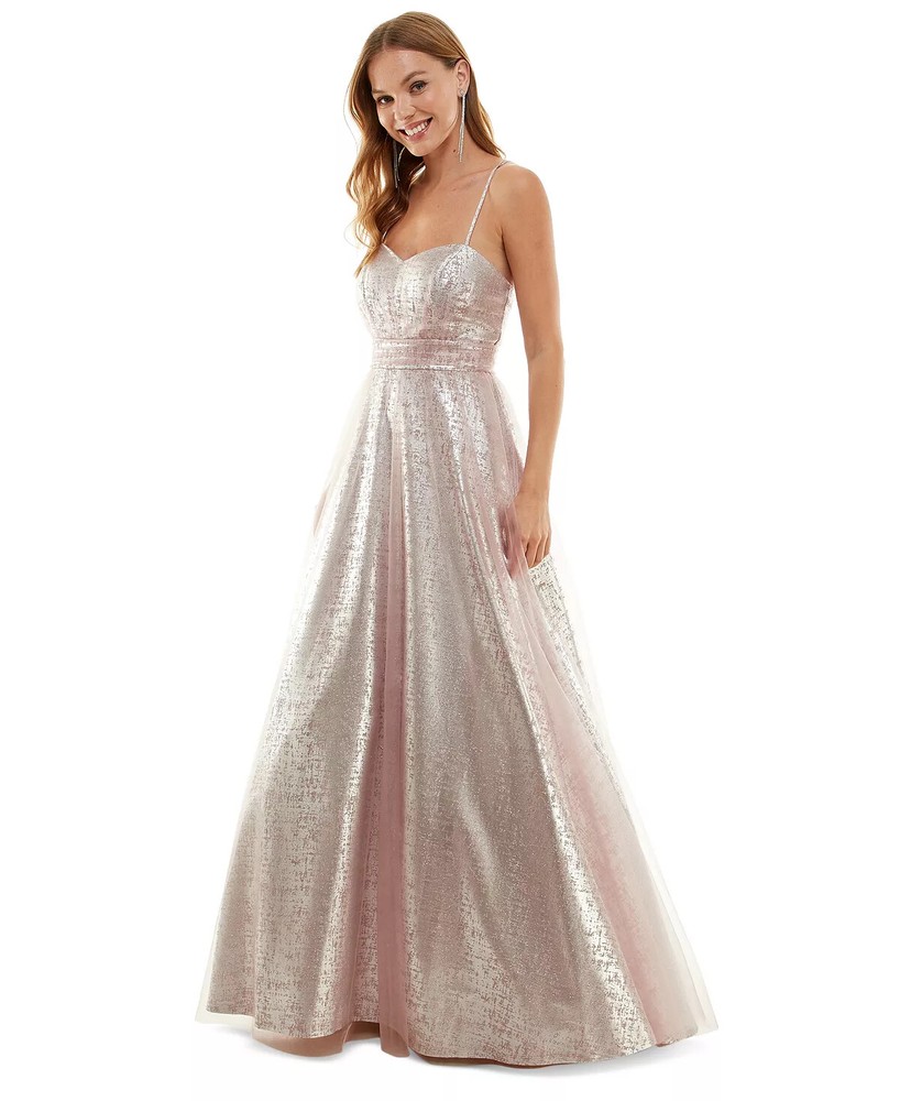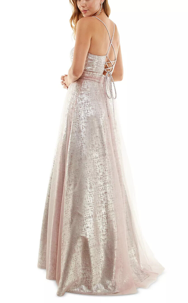 New without tags Shine like the star you are in City Studio's glamorous gown, a metallic foil-print design layered with a stunning sheer overlay for a dynamic touch. Approx. 62" long from center back neck to hem Gown: Floor-length formal dress Sweetheart neckline; Gown silhouette Back zipper closure Adjustable straps crisscross and tie at back Foiled fabric with sheer mesh overlay Lined Shell & lining: polyester Dry clean