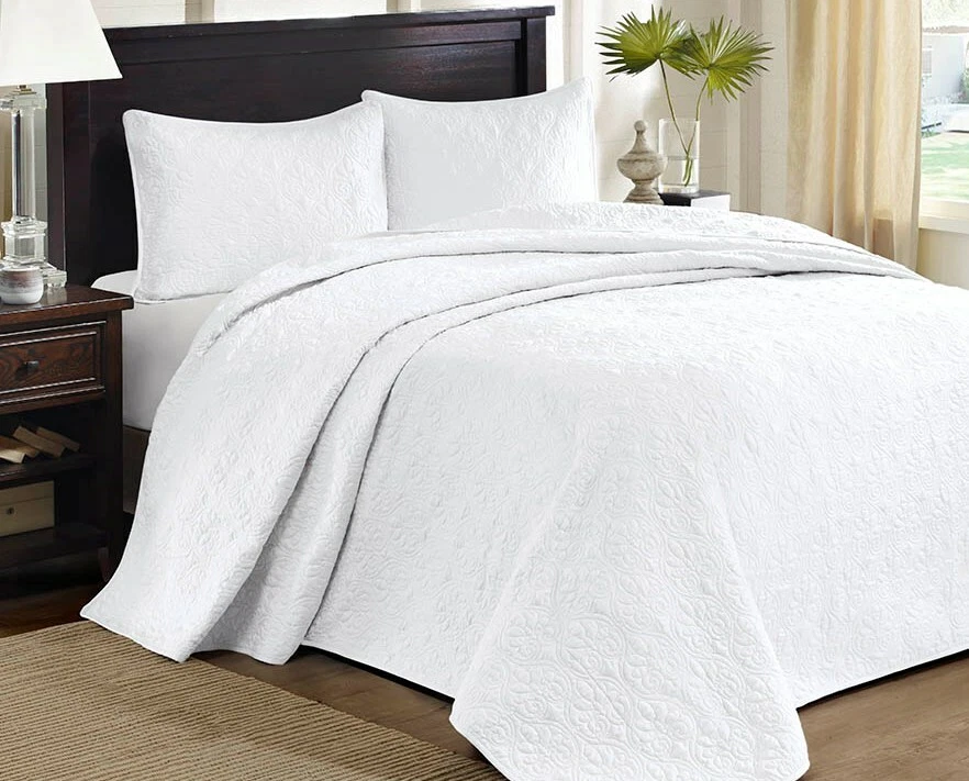White Quilted Bedspread Set - Product Description: A classic style that easily pairs with existing decor, this beautifully crafted bedspread in a classic white will be the center point of your room. Matelassé is a French term for a "quilted ornamented fabric" . Style: Vintage Chic Color: White Front: 100% Super Soft Poly Reverse: 100% Brushed Microfiber Fill material: 90% Cotton / 10% other Care instructions: Machine washable Condition: Brand New What's in the Set: Twin Dimensions: Bedspread: 81 inches wide x 110 inches long Shams (one): 20 inches wide x 26 inches long Full Dimensions: Bedspread: 96 inches wide x 110 inches long Shams (two): 20 inches wide x 26 inches long Queen Dimensions: Bedspread: 102 inches wide x 118 inches long Shams (two): 20 inches wide x 26 inches long King or Cal king Dimensions: Bedspread: 120 inches wide x 118 inches long King Shams (two): 20 inches wide x 36 inches long Also available in OTHER COLORS & SIZES. Please Click Here ~~~~~~~~~~~~~~~~~~~~~~~~~~~~ ~~~~~~~~~~~~~~~~~~~~~~~~~~~~ Returns or Exchanges Please see the Shipping Tab above Shipping Locations: Shipping cost stated is to the 48 contiguous United States. We will glady ship to Canada, Hawaii, Alaska, Puerto Rico and APO/FPO (Military) addresses, but there may be additional freight charges. Buyers living in these territories must email your zip code BEFORE bidding for a freight quote. Otherwise, we will assume your bid is an acceptance that there will be an additional shipping cost. Buyers are responsible for any and all Customs Fees and/or Duty Fees, or Taxes assessed by their Country.