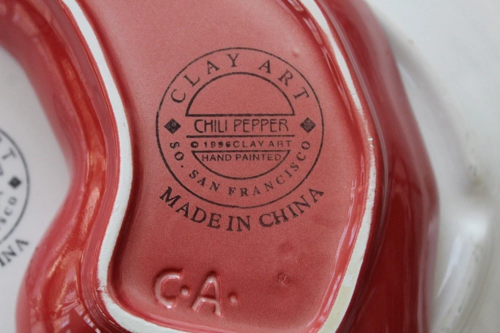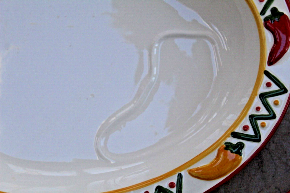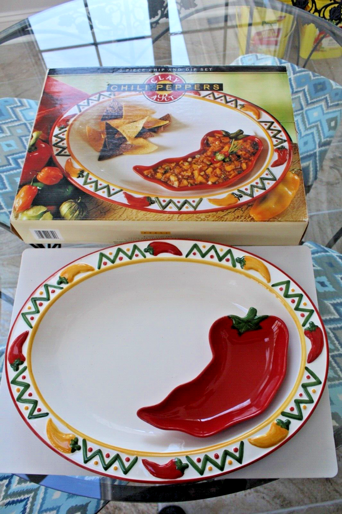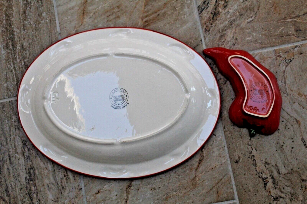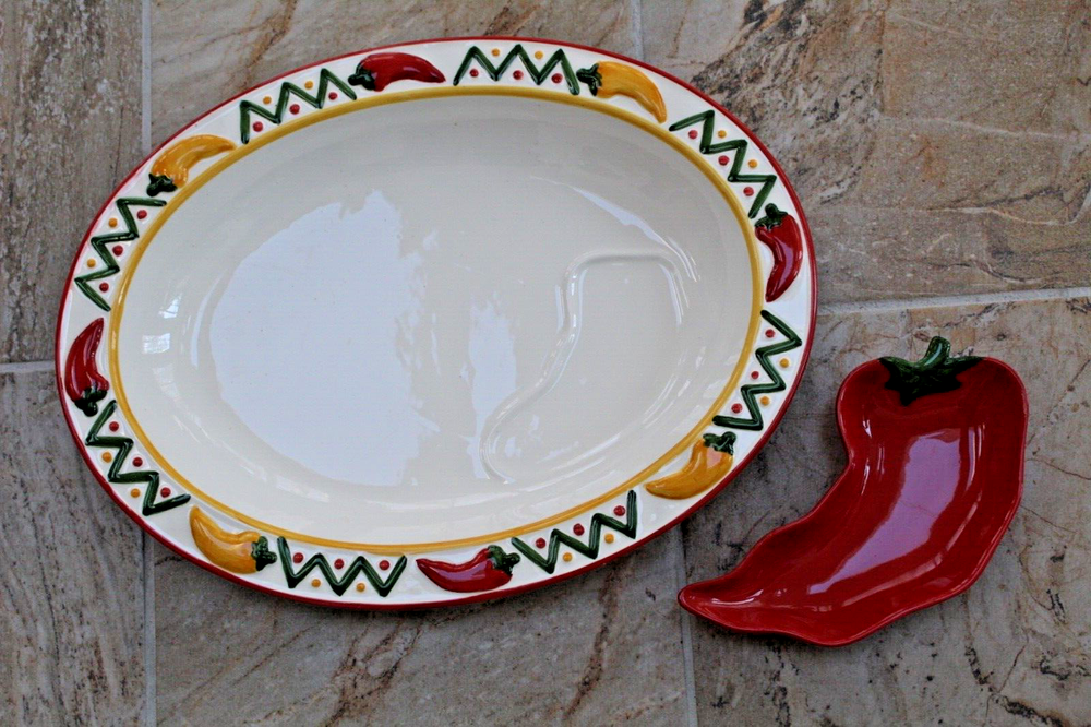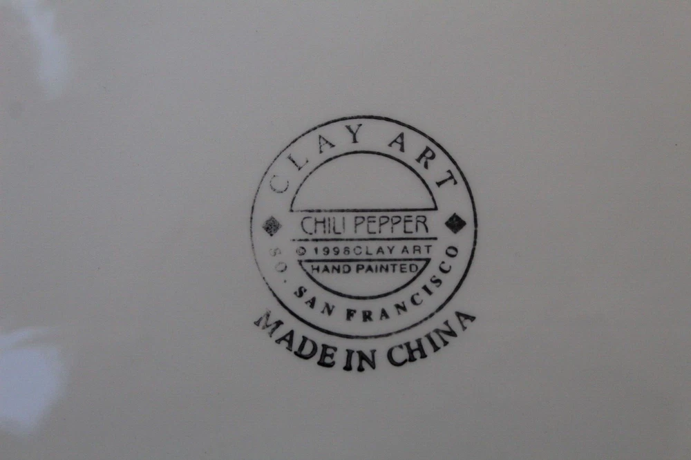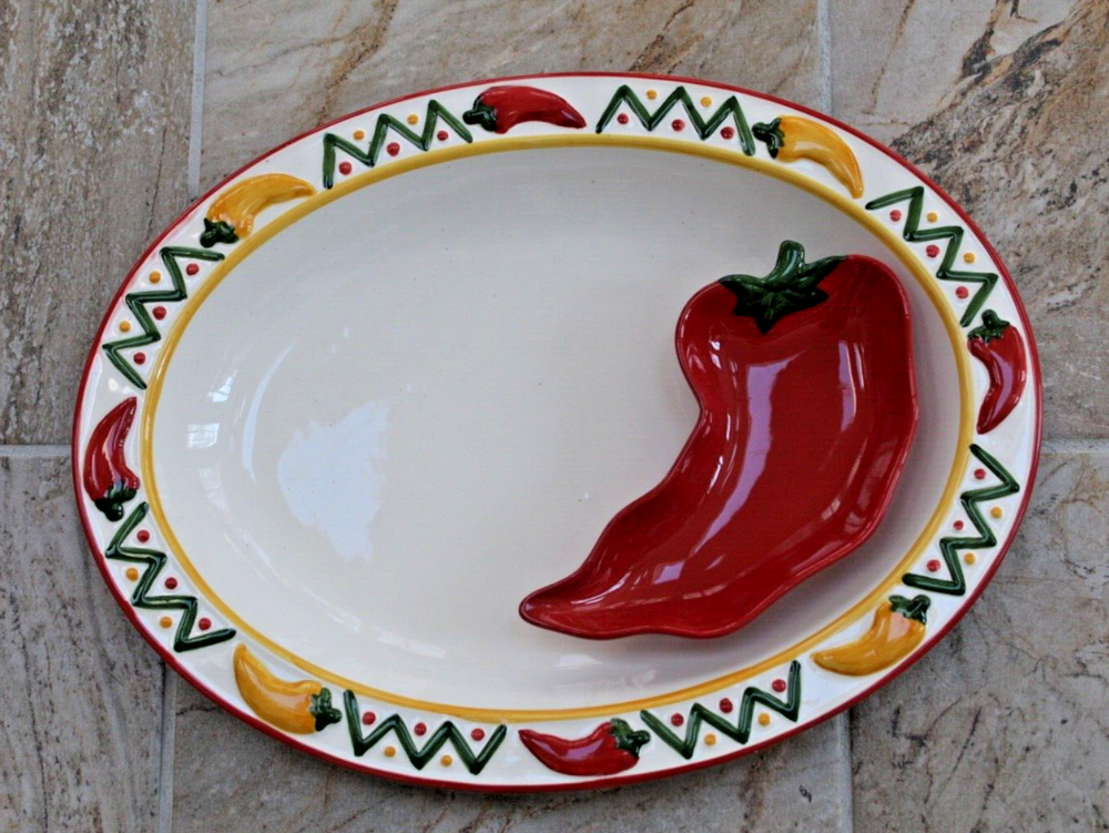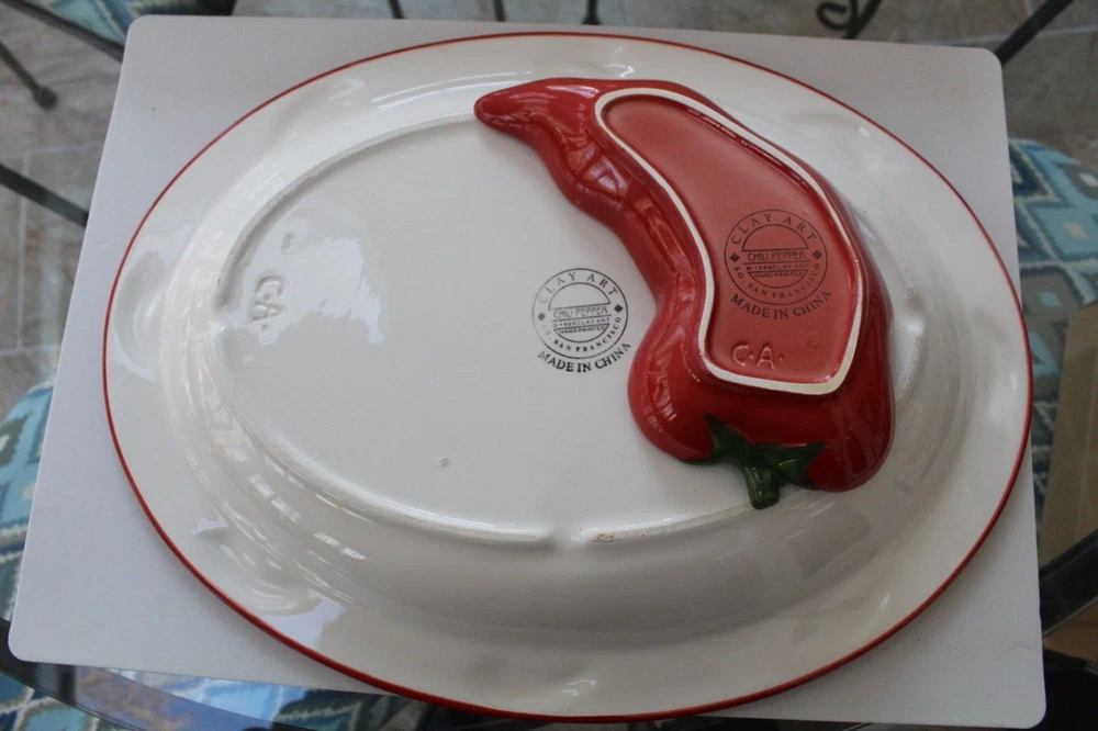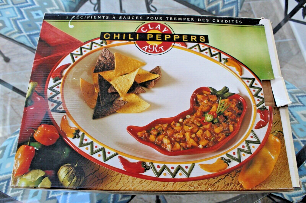 PRICE REDUCTION! This is a like new CLAY ART Chili Peppers design Chip & Dip 2 piece set with its original box. It's hand painted with colorful chili design glazed surface. The base dish has a molded insert to hold the salsa dish and measures 17" long, 13" wide and 3" high. The chili shaped salsa dish measures 9" long, 4" wide and 1.5" high. It's in very good condition as was little used as we had other sets. We are selling on a eBay a wide variety of kitchenware as we downsize, including pitchers, decorative plates and dishes- many in French Provencal design. There would be combined shipping savings if additional items were purchased and shipped together. You can buy from us with confidence as we have been an eBay member since 2001, with over 5,600 sales with a 100% positive feedback rating. We fully inspect all products prior to quick shipping from the US, without any extra service fees. Please see our large assortment of other items we are offering for sale on eBay, including new unique monoculars at very low prices. We are also selling (or will be soon listing) women's purses, sandals, shoes, boots & plus size clothing; men's ties & clothes, books, posters, original artwork & prints, plus a wide variety of antique and vintage: cameras & photo accessories (including lenses, tripods, gadget bags and filters), silver plate items, Limoges & other fine china from around the world, souvenir & collector plates, pottery, pitchers, vases, cranberry glass, tea pots, cups & saucers, bottles, advertising & country store tins and much more! Please check our listings regularly as our selection changes often. There would be a savings in combined shipping costs if more than 1 item was purchased and shipped at the same time.