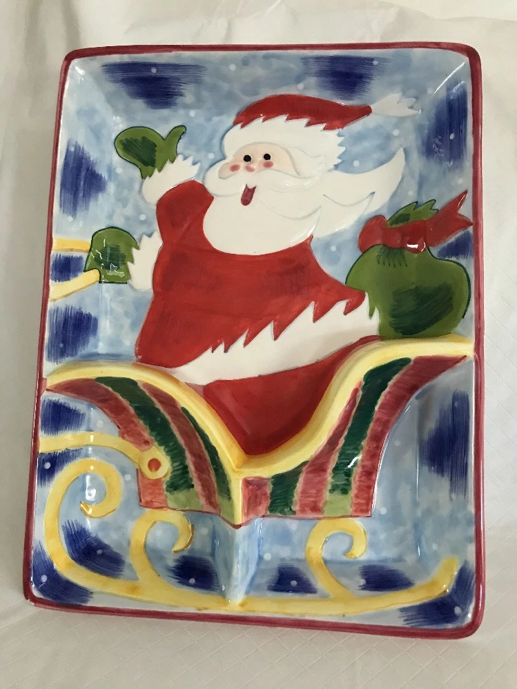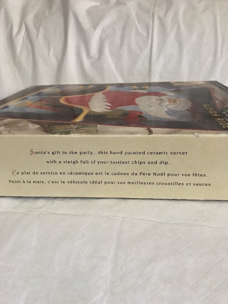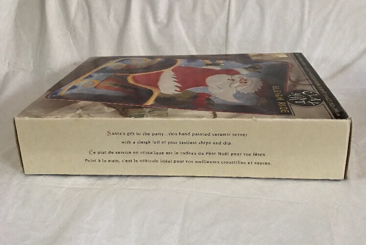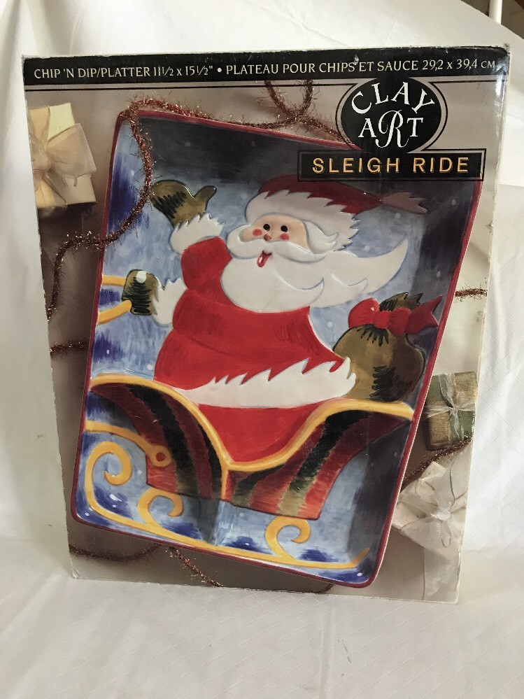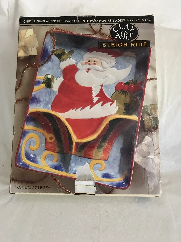 CLAY ART LARGE CERAMIC CHIP 'N DIP SERVING PLATTER perfect for the holidays. SANTA IN A SLEIGH. MEASURES 15 1/2 long X 11 1/2" wide x 2” deep ITEM# 4994. HANDPAINTED. NOT RECOMMENDED FOR OVEN USE. MICROWAVE AND DISHWASHER SAFE. IN IT'S ORIGINAL BOX, BOX HAS A SMALL HOLE AND THERE IS A CHIP ON ONE CORNER of the dish see last picture