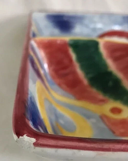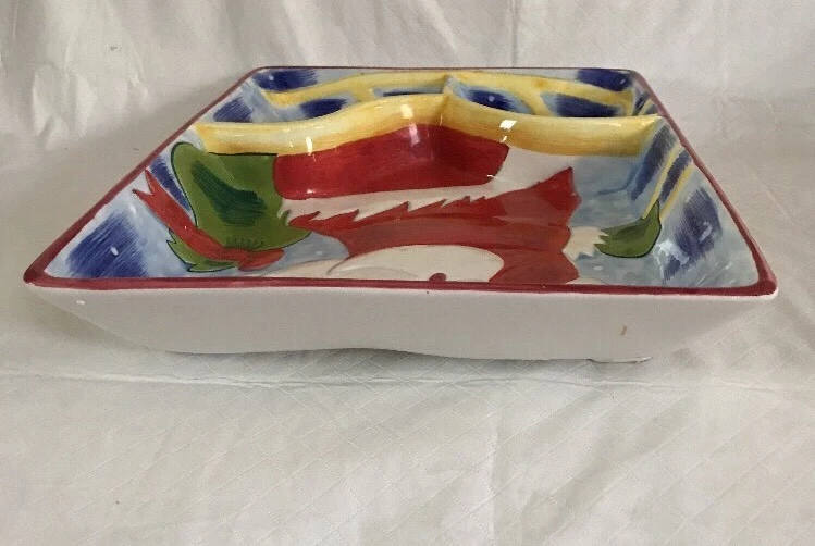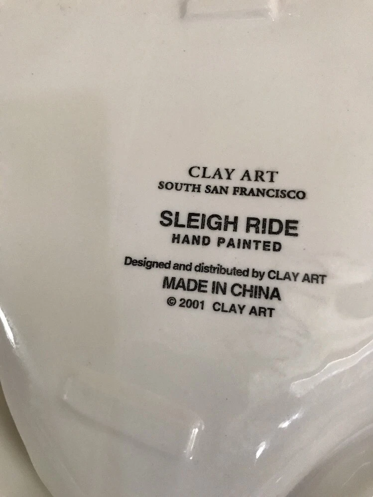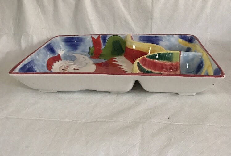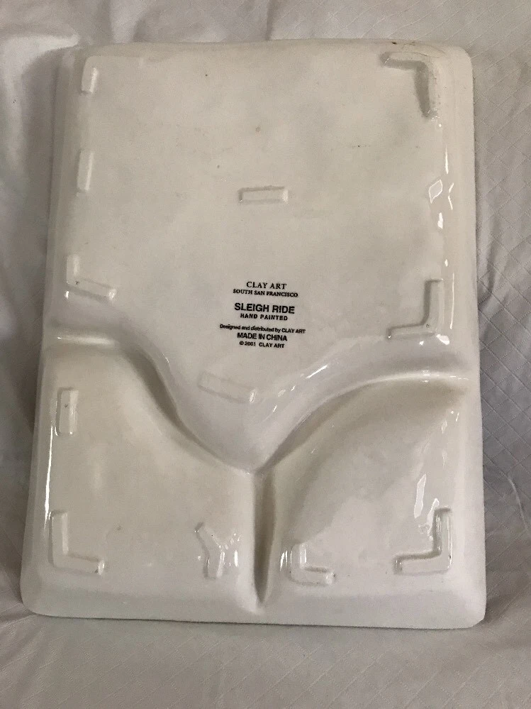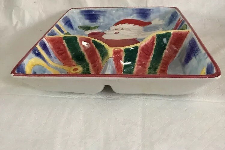 CLAY ART LARGE CERAMIC CHIP 'N DIP SERVING PLATTER perfect for the holidays. SANTA IN A SLEIGH. MEASURES 15 1/2 long X 11 1/2" wide x 2” deep ITEM# 4994. HANDPAINTED. NOT RECOMMENDED FOR OVEN USE. MICROWAVE AND DISHWASHER SAFE. IN IT'S ORIGINAL BOX, BOX HAS A SMALL HOLE AND THERE IS A CHIP ON ONE CORNER of the dish see last picture