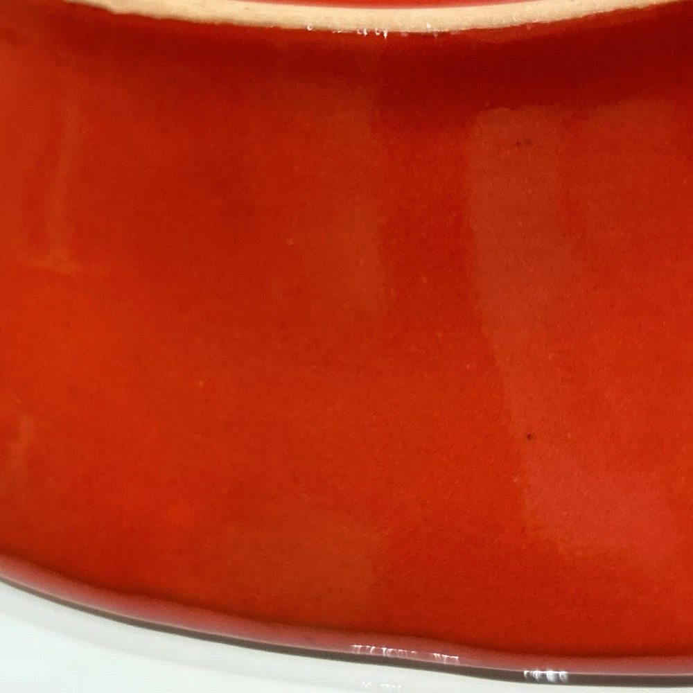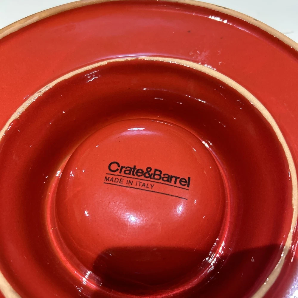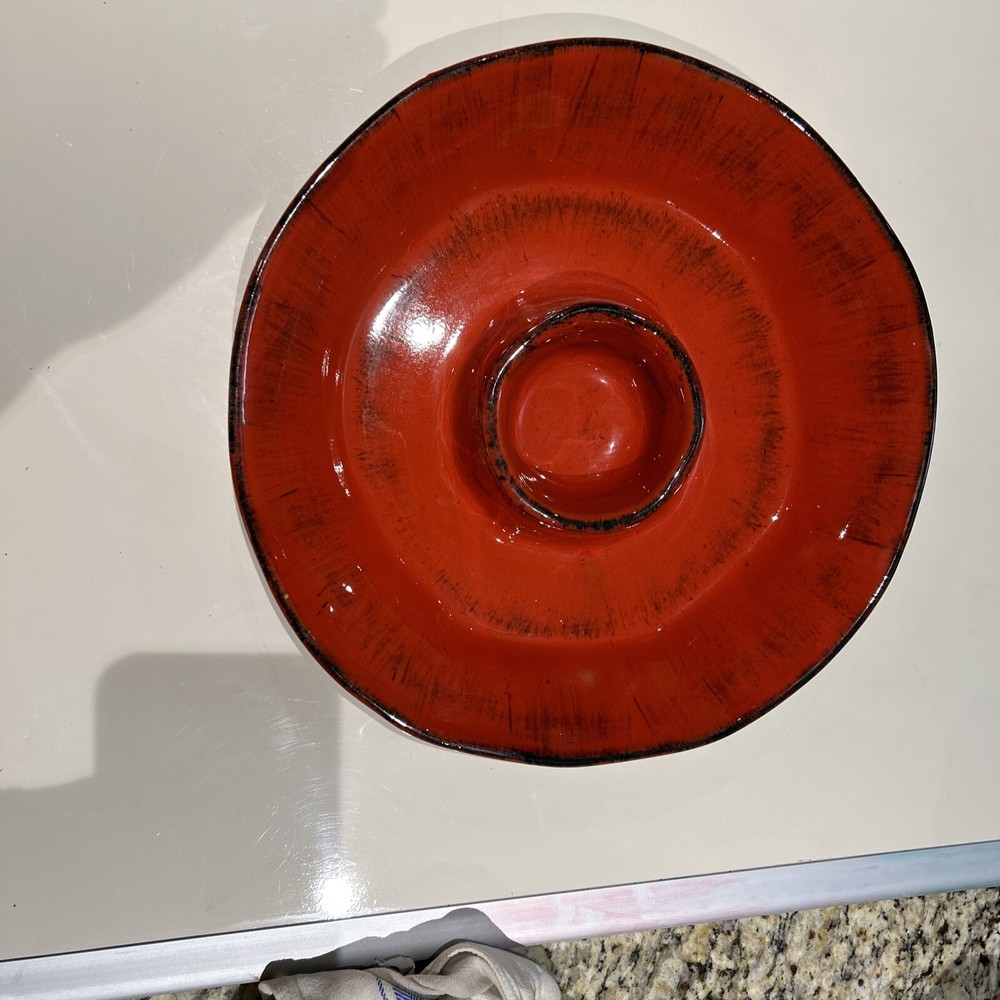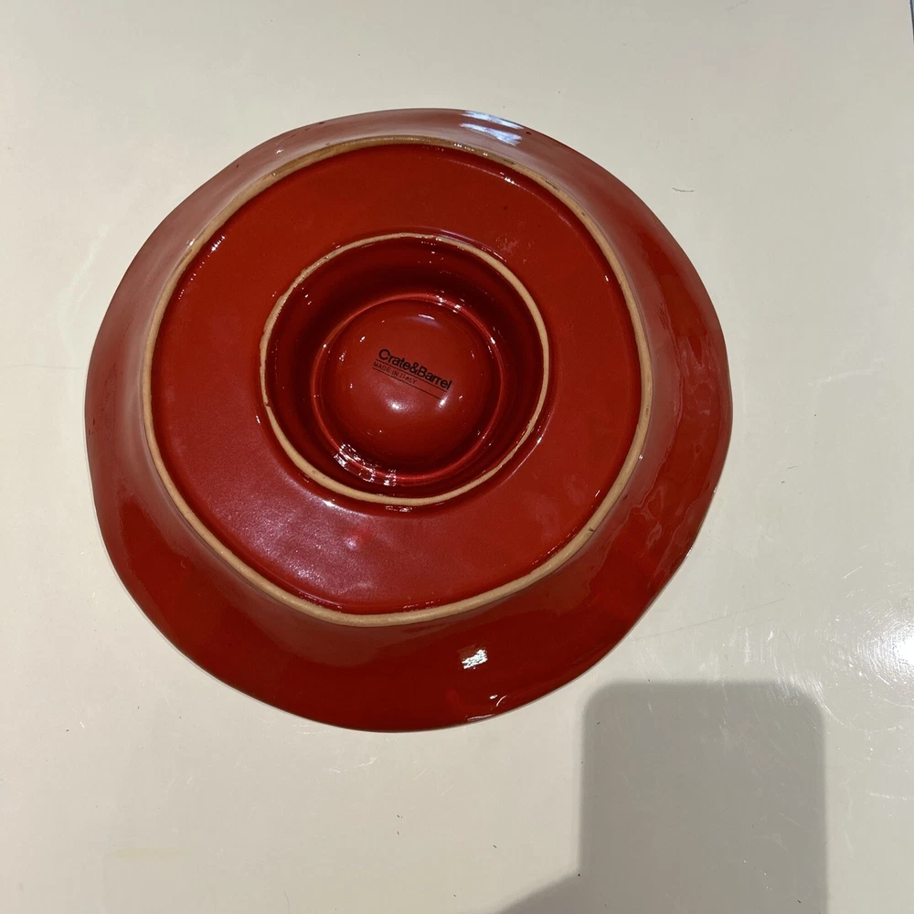There is a small light dot on the rim that is a firing spot not a chip. It weighs over four pounds and to insure safe delivery packing weight will be over 6 pounds. We will choose the most affordable shipping option. This CRATE & BARREL Carmen chip and dip bowl is a beautiful addition to any kitchen. Its rustic Italian style and glossy red finish with black brush stroke highlights make it a perfect dip dish for any occasion. With a large outer dish for chips, vegetables fruit etc and a dip compartment that holds 7 ounces. It measures 13 inches in width and 2.5 inches in height. Crafted in Italy this dip dish is both refrigerator safe and hand painted. It features a printed backstamp and weighs 4.10 pounds. Care instructions include hand wash only. This exquisite piece is perfect for serving chips and dip or any other delicious appetizer.