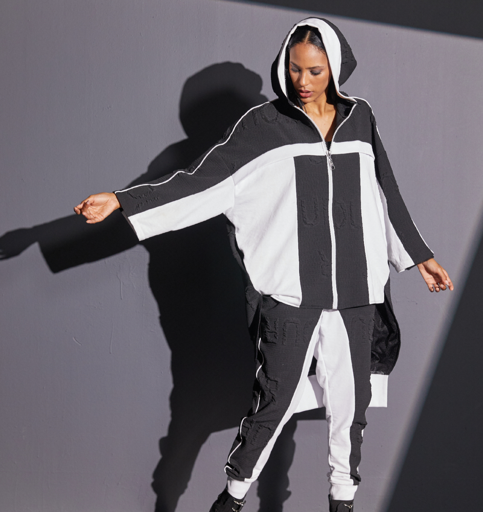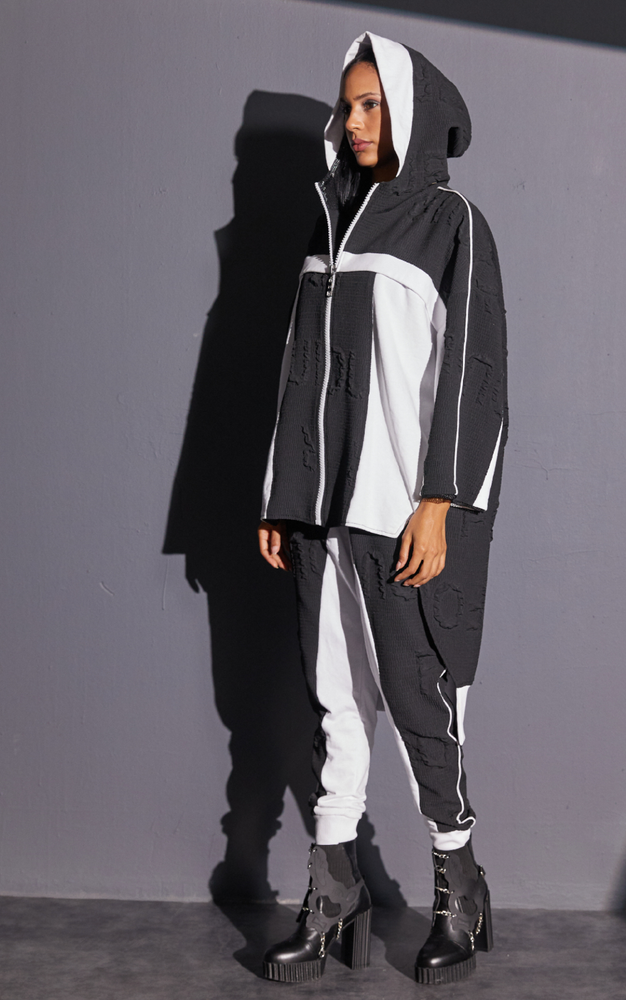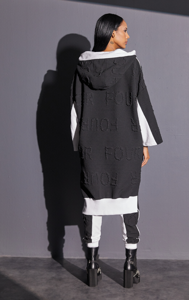 CRAZY H4 black & white textured dip jacket black structured fabric with white contrast zipper fasten to the front concealed pockets airtex in side the jacket lined will fit size L/XL stunning jacket underarm to underarm measures across the front 32ins+ to achieve the drape as on the model length 46ins listing for jacket only