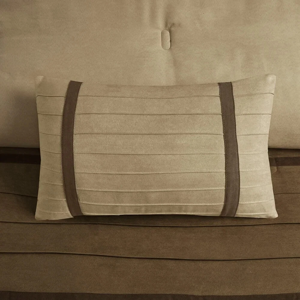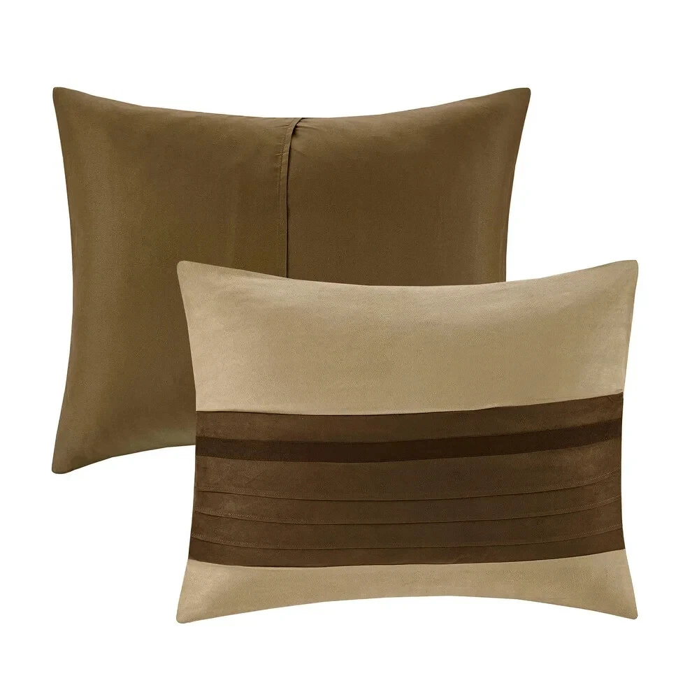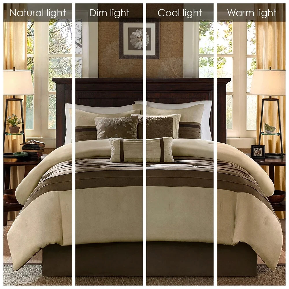 Cal King Bedding Comforter Set Modern Farm Rustic Neutral Brown Faux Suede 7Pc This Cal King Bedding Comforter Set (7pc) will add a classic touch to your master bedroom. The transitional style comforter features a piece microsuede design in rich contrasting colors to create an incredibly soft look and feel. This set includes a matching comforter, bed skirt, two shams and the three accent pillows are sure to give your bedroom a whole new look. Additional Product Features: Includes: One comforter, one bedskirt, two shams, three pillows Color: Natural/Brown Material: 100% Polyester microsuede Bedskirt drop length: 15 inches Care instructions: Machine washable California King Comforter Set: 104” wide x 92 inches long Bedskirt: 72 inches wide x 84” long Sham: 20 inches wide x 36 inches long Cal King Bedding Pillow Dimensions: • One: 16 inches wide x 16 inches long • Two: 18 inches wide x 18 inches long • Three: 12 inches wide x 20 inches long The digital images we display have the most accurate color possible. However, due to differences in computer monitors, we cannot be responsible for variations in color between the actual product and your screen. Add style and comfort to your bedroom with the addition of this Cal King Bedding