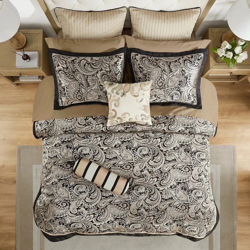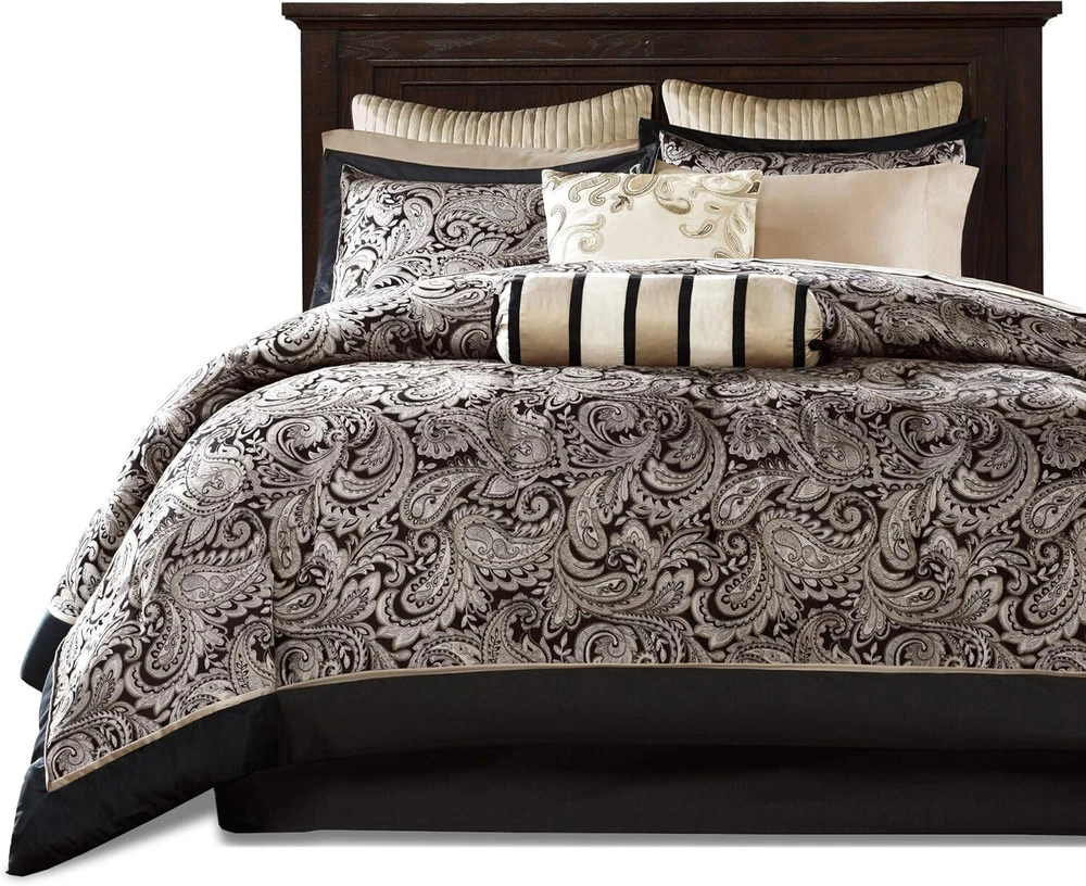 Cal King Size Comforter Set Victorian Elegant Paisley Black Gold Silver Chic 12Pc This Cal King Size Comforter Set features 12 pcs for a classic update for your bedroom. The jacquard weave is inspired from an updated paisley motif and is woven in a beautiful combination of black, gold and silver for a touch of sheen to your bedding. The set also includes a 100% cotton sheet set. Additional Product Features: 100-percent polyester jacquard, polyester filling Professionally coordinated solids and prints 100-percent cotton sheet set, 200 thread count Bed skirt drop length: 15 inches Comforter and shams have 2" flange and 1/2" flat piping in soft gold Machine washable and iron out any wrinkles Some items are packed tightly for shipping: give them a shake and a fluff to restore their shape Cal King Size Comforter Set Includes: 1) Comforter: 106 inches wide x 92 inches long 1) Bed skirt: 72 inches wide x 84 inches long with 15 inches drop length 2) Shams: 20 inches wide x 36 inches long 1) Fitted sheet: 72 inches wide x 84 inches long with 14-inch pocket depth 1) Flat sheet: 110 inches wide x 102 inches long 2) Queen Pillowcase: 20 inches wide x 40 inches long 2) Decorate Pillows: 18 x 18 /6.5 x18 inches 2) Euro Shams: 26 x 26 Inches Give your bedroom a complete makeover with our 12 Piece Cal King Size Comforter Set