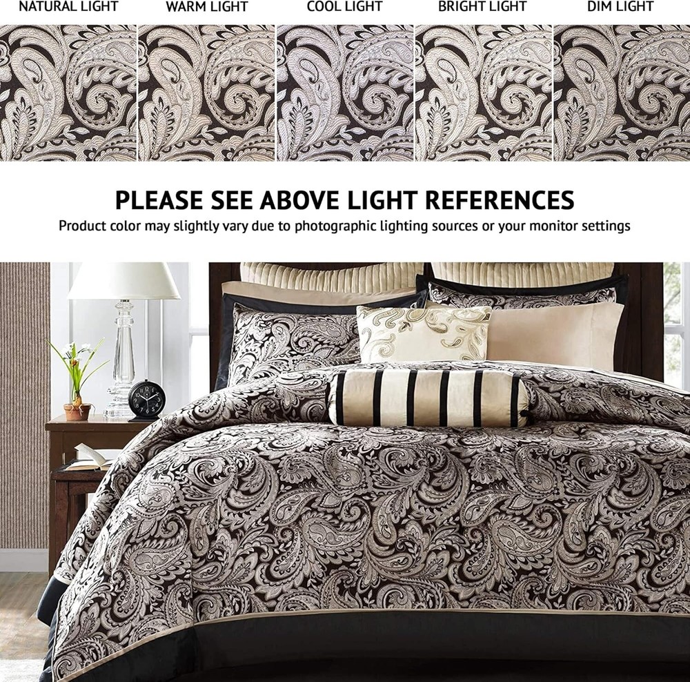 This comforter set completely transformed my bedroom! The rich paisley pattern with gold and silver accents looks so luxurious, and the included cotton sheets feel amazing against my skin. Every piece coordinates perfectly for that high-end hotel vibe right at home.