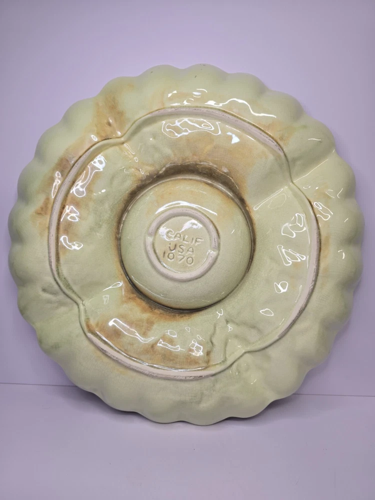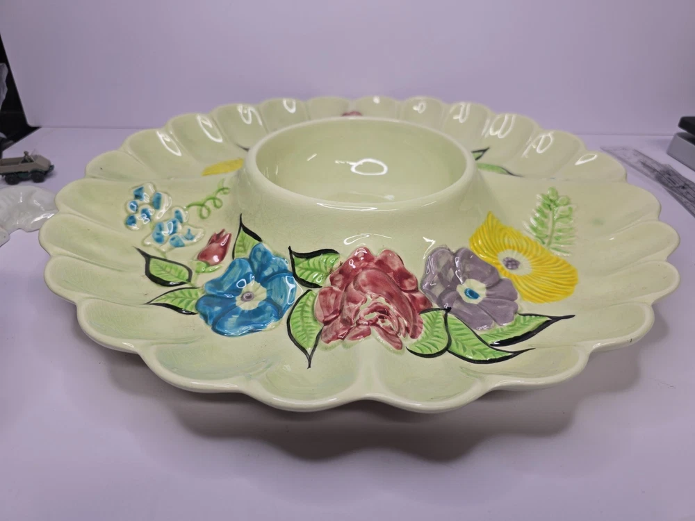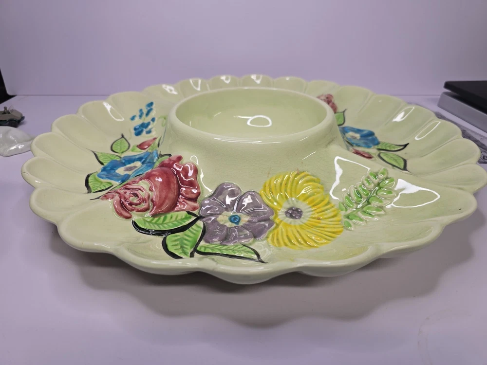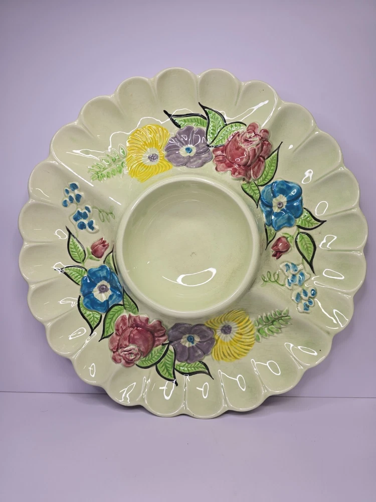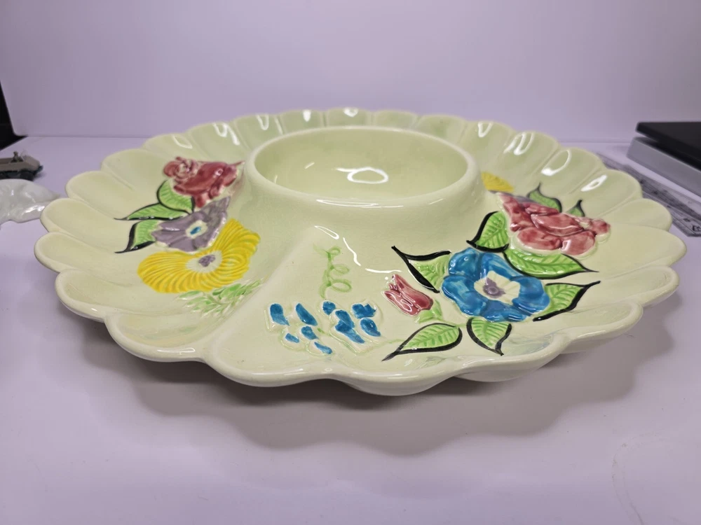 This Cali USA large 15" divided serving/dip/relish platter is a must-have for any California kitchen. The colorful floral pattern adds a touch of elegance to any dining table. Made of high-quality ceramic material, this round platter is perfect for serving your favorite dishes to your loved ones. The platter is designed with a unique divider that makes it perfect for serving multiple dishes at once. Its origin is from California, USA, making it a perfect addition to your collection of decorative cookware. This platter is ideal for those looking to add a touch of sophistication to their dining experience.