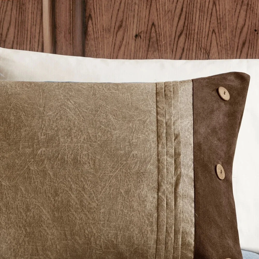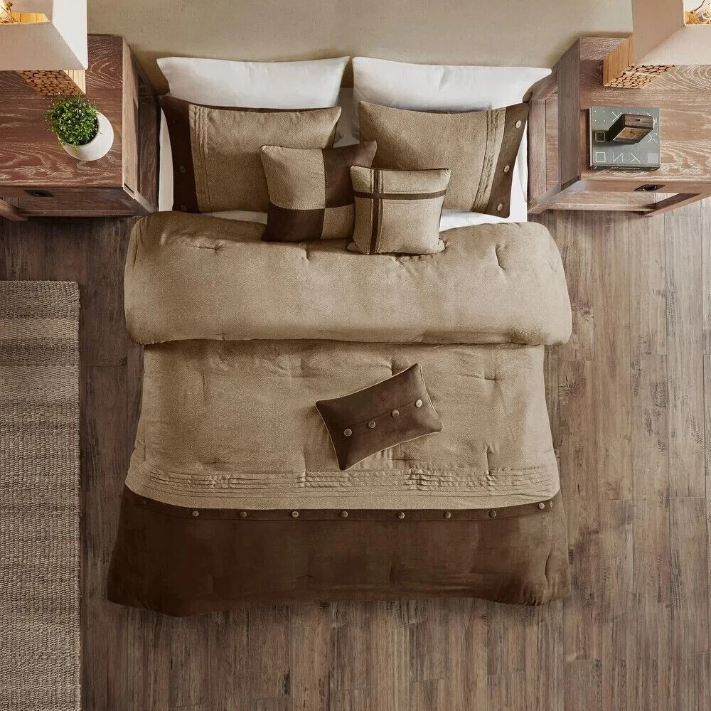 California King Size Bedding Comforter Set Brown Rustic Cabin All Season 7Pc New This California King Size Bedding 7pc comforter set has a rustic appeal to complete your bedroom It offers a warm plush polyester filled comforter with button and pintuck trim making it ideal for cold winter nights This traditional set gives you everything you need to start your bedroom makeover California King Size Bedding: Set includes: One comforter, two shams, one bedskirt, three decorative pillows Fabric detail: Woven Materials: 100-percent polyester Features microsuede at the bottom Bedskirt drop length: 15 inches Hypoallergenic: Yes Care instructions: Machine washable Pattern: Pieced Color: Brown Comforter dimensions: 104 inches wide x 92 inches long Sham dimensions: 20 inches wide x 36 inches long Pillow dimensions: 18 inches wide x 18 inches long, 16 inches wide x 16 inches long, 12 inches wide x 18 inches long Bedskirt dimensions: 72 inches wide x 84 inches long The digital images we display have the most accurate color possible. However, due to differences in computer monitors, we cannot be responsible for variations in color between the actual product your screen. California King Size Bedding Reviews: "This is a great comforter set. I never wanted to get out of bed in the morning :) " " This set was more than I expected.... great quality, design, and just beautiful!! " " We Love this set! Warm and snugly! Couldn’t ask for more. " Add style and comfort to your bedroom with this California King Size Bedding