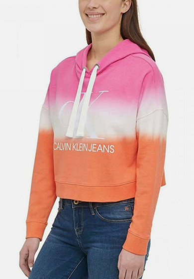 Elevate your activewear wardrobe with this Calvin Klein Jeans Women's Pink/Orange Logo Dip Dye Long Sleeve Hoodie in size XL. The pullover hoodie features a crew neckline and is made with a lightweight blended fabric of 60% cotton and 40% polyester, making it suitable for all seasons. The colorful multicolor colorblock pattern with the iconic Calvin Klein logo accents adds a touch of classic style to your outfit. Perfect for various activities such as rugby, driving, bodybuilding, and more, this hoodie is machine washable and easy to maintain. Whether you're going for a walk, running errands, or hitting the gym, this hoodie is a versatile addition to your wardrobe.