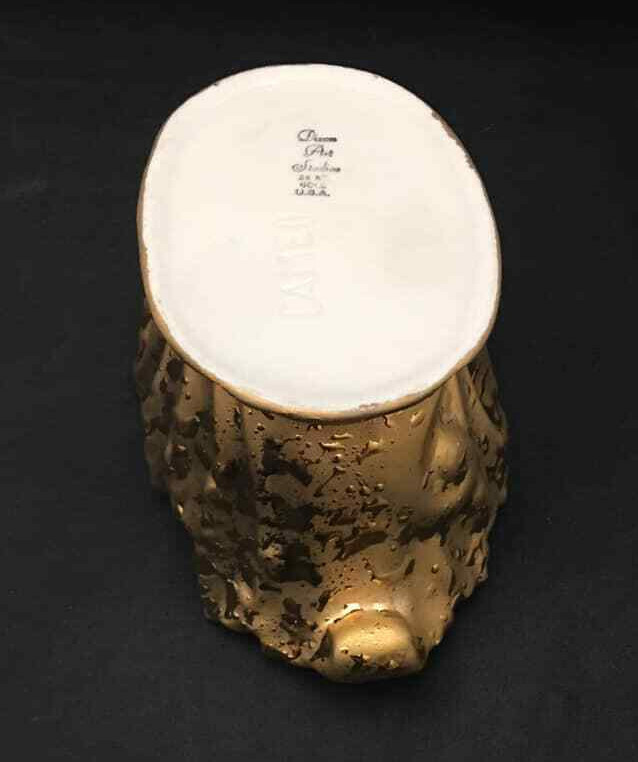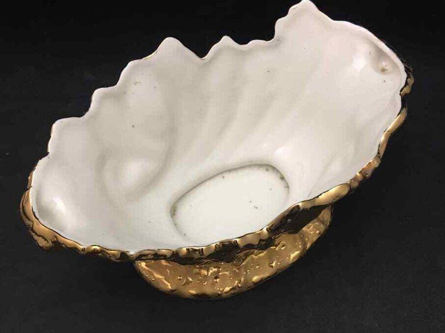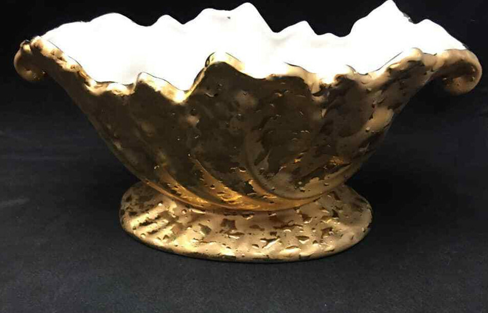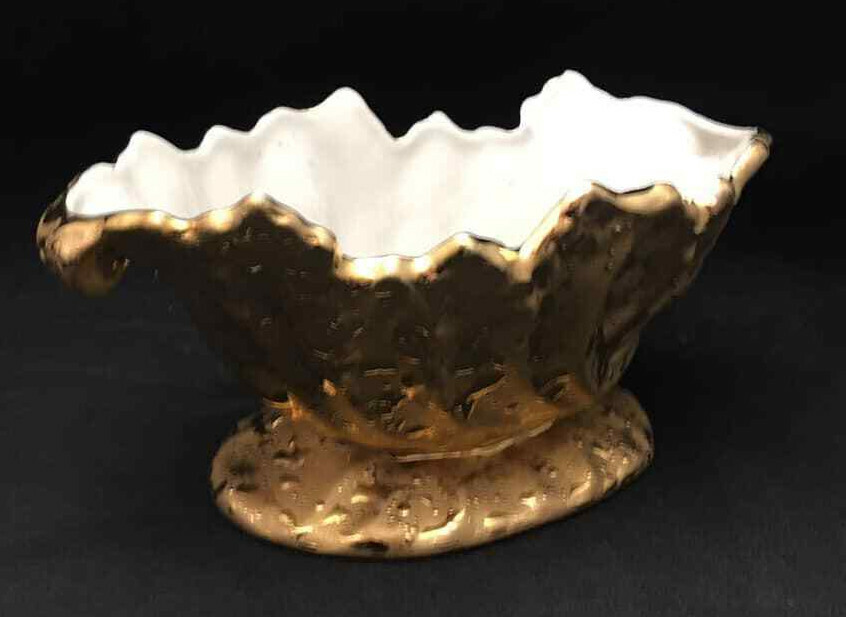 Cameo white porcelain bowl with shaped edge Heavy coat of 22kt Gold on the exterior added by Dixon Art Studio The bowl is 7.5 inches by 4.5 inches oval with a height of 3.5 inches. We use e-Bay's Global Shipping Program for international shipments. We welcome combining orders to reduce shipping costs.