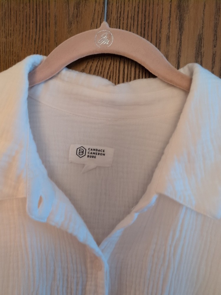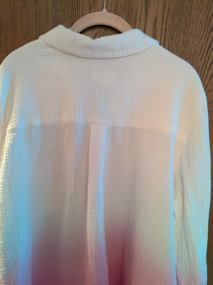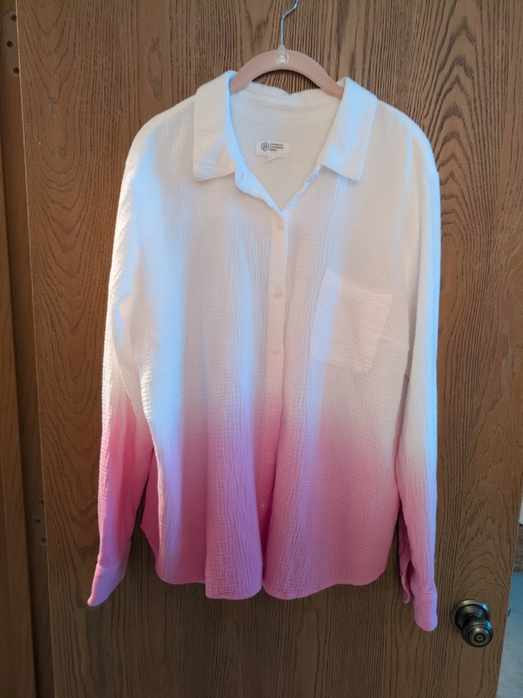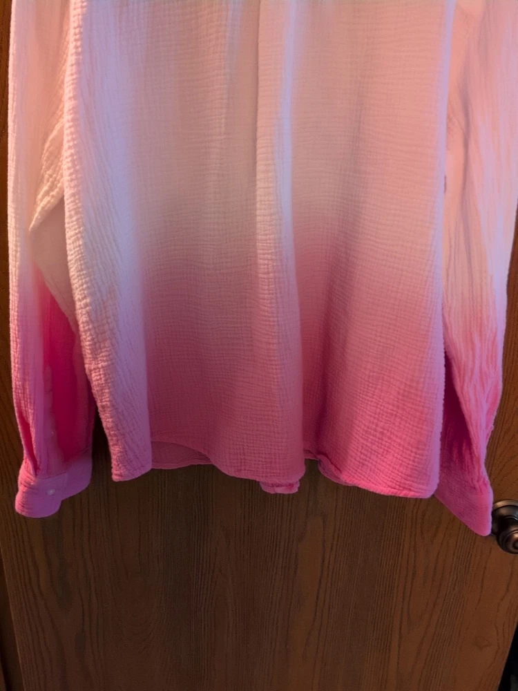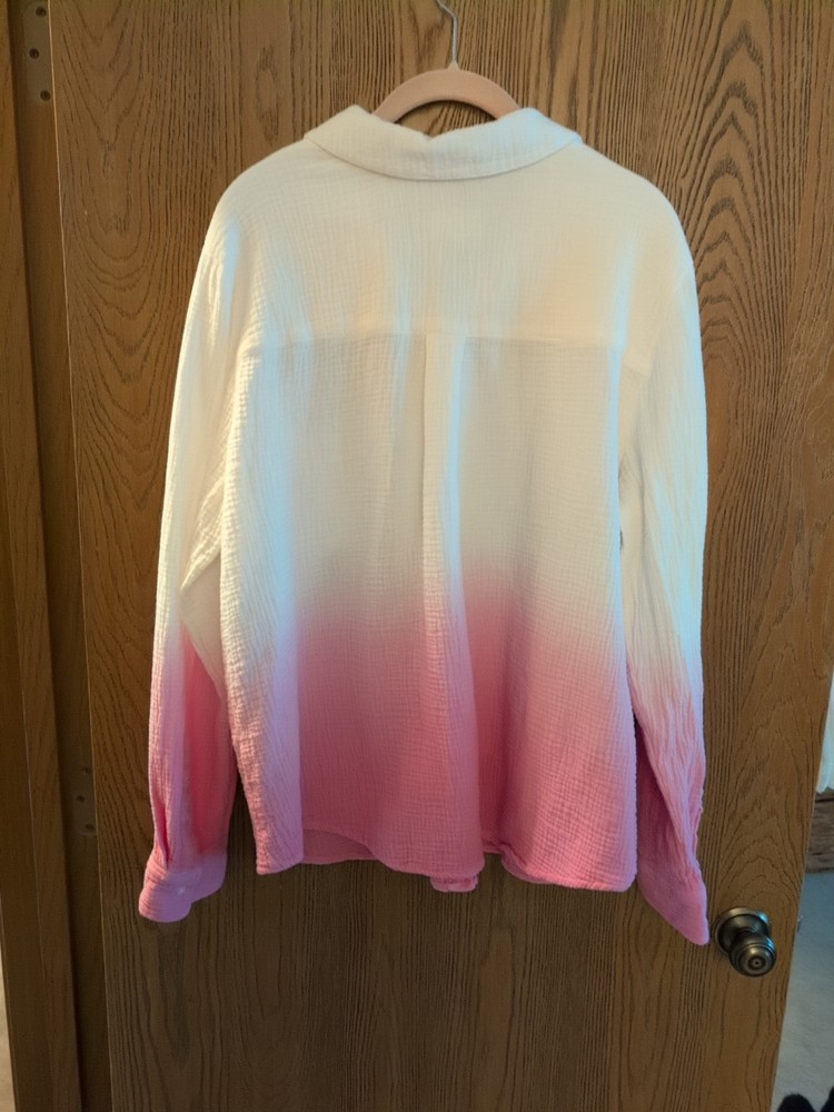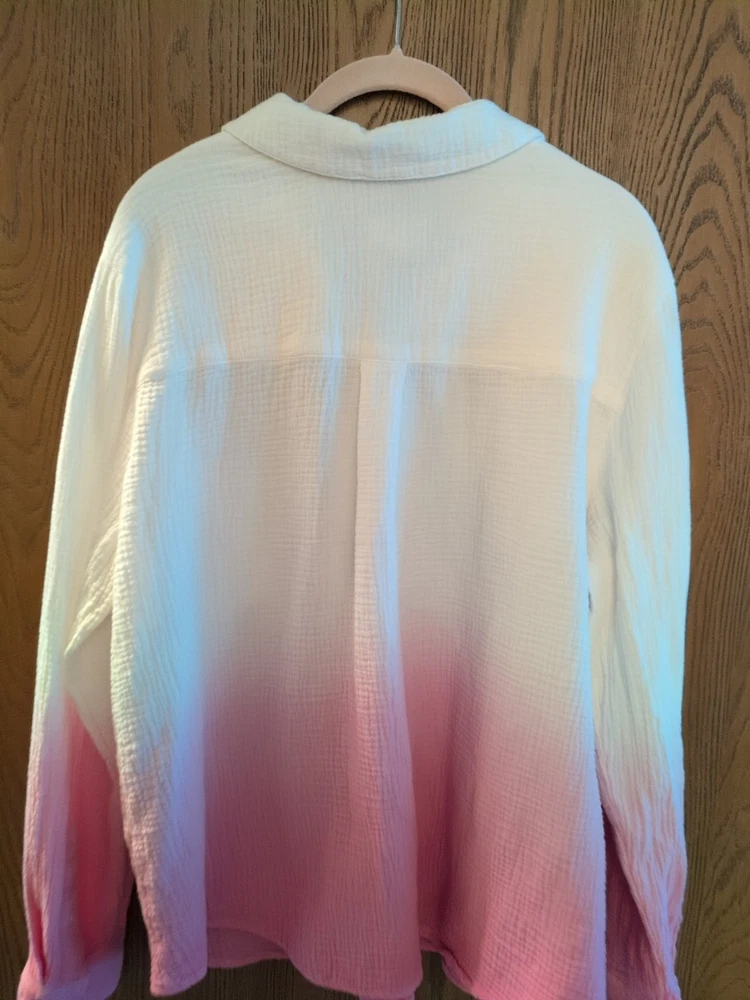 This is a Candace Cameron Bure Dip-Dye Button Front Shirt in size L. The shirt features a collared neckline, long sleeves with a casual style, button closure, pockets, and an ombre white and pink color design. Made of 100% cotton woven fabric, this shirt is machine washable. Armpit to armpit is 25 inches across Excellent condition worn once