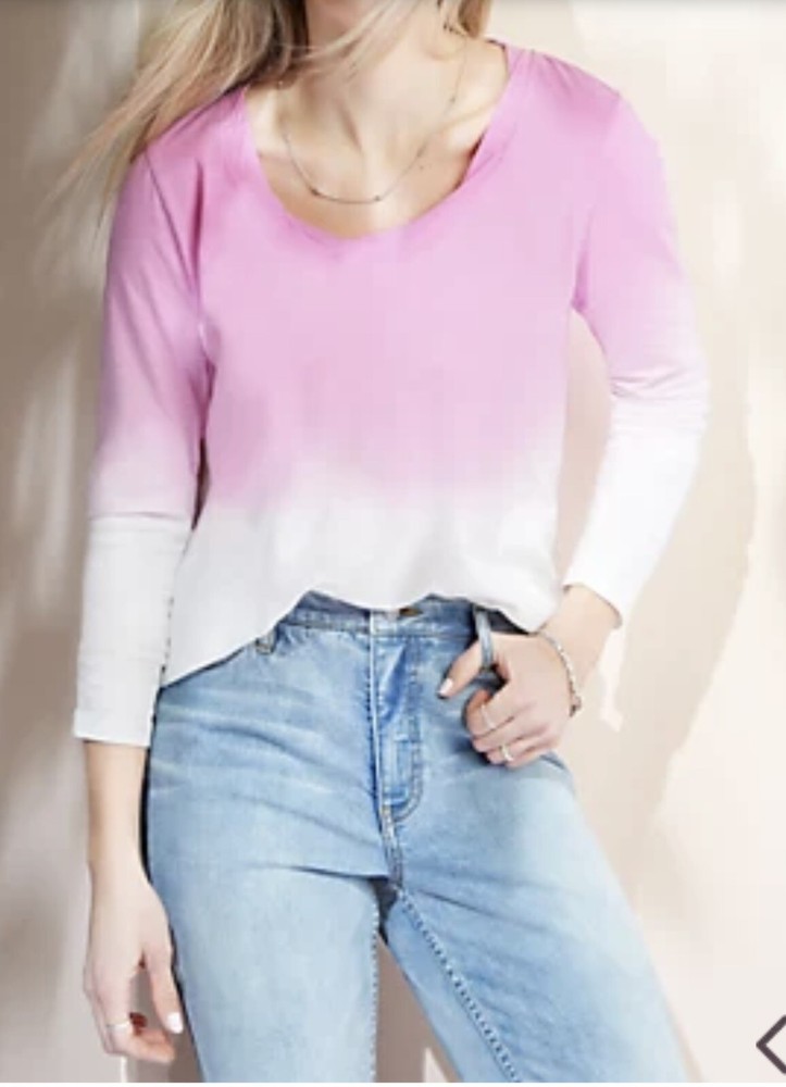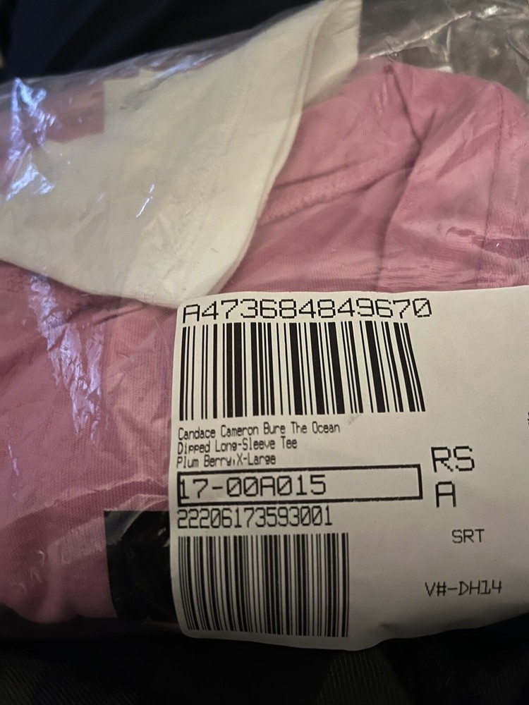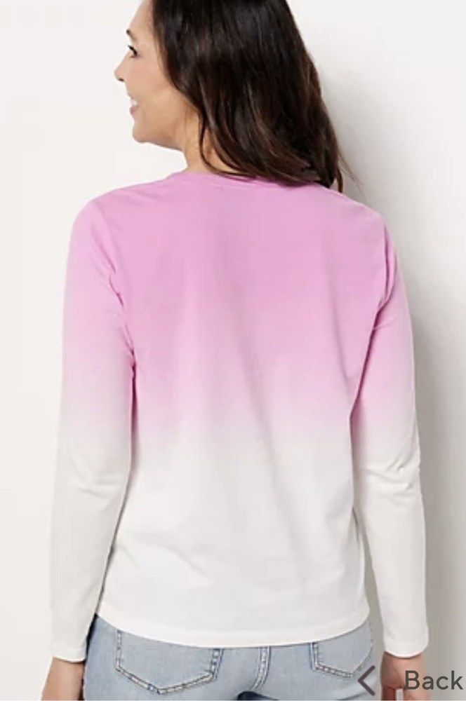 Candace Cameron Bure The Ocean Dipped Long-Sleeve Tee Plum Berry XL A473684 Fabrication: knit Features: scoop neckline with twist detail dip-dye straight hem long sleeves Fit: semi-fitted; follows the lines of the body with added wearing ease Length: missy length 24-1/2" to 26-5/8"; plus length 27" to 30-1/2" Content: 100% cotton Care: machine wash tumble dry Imported