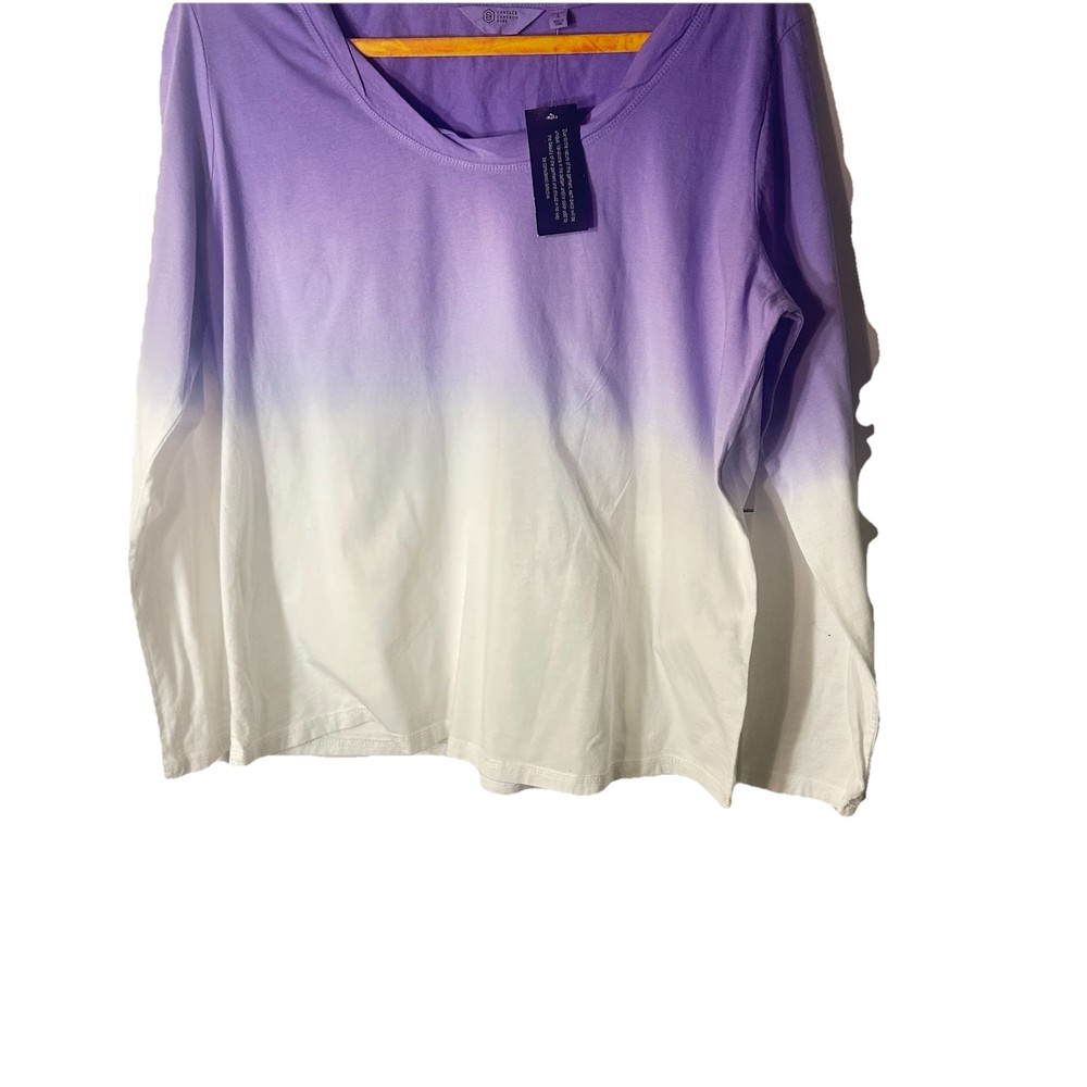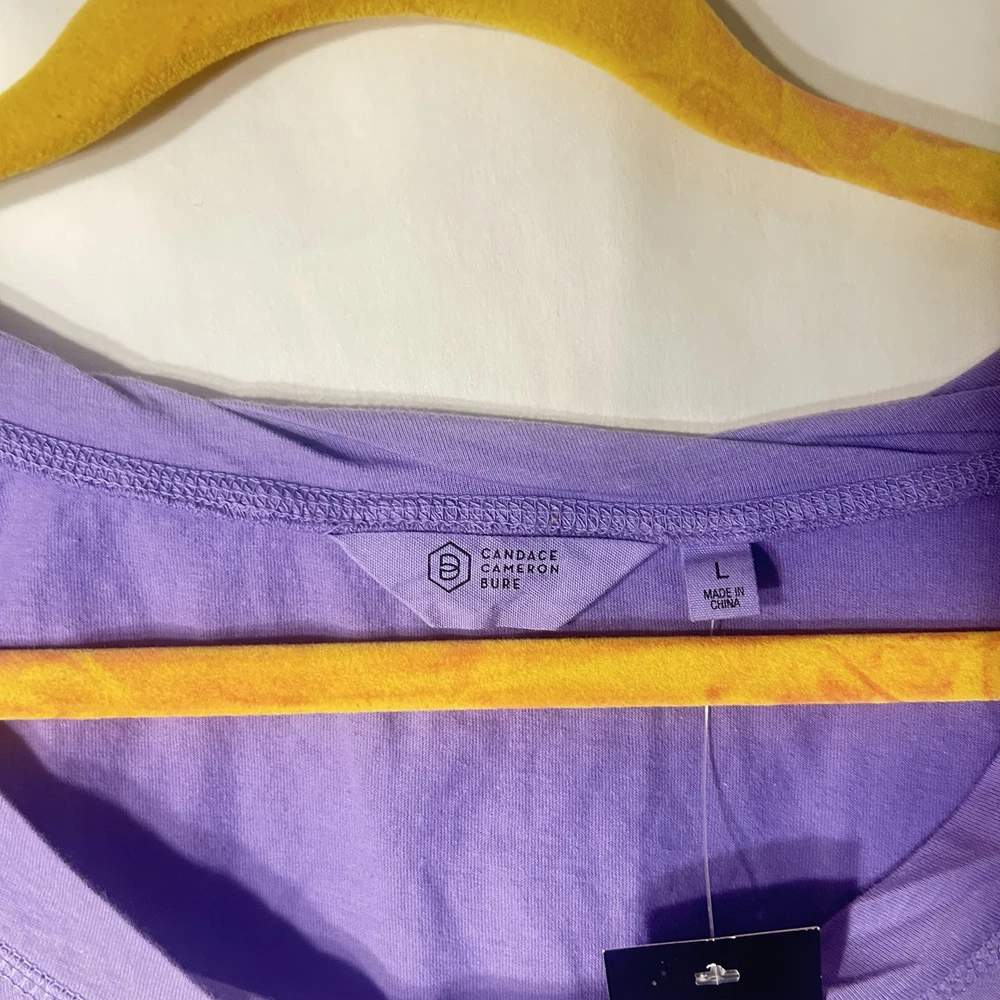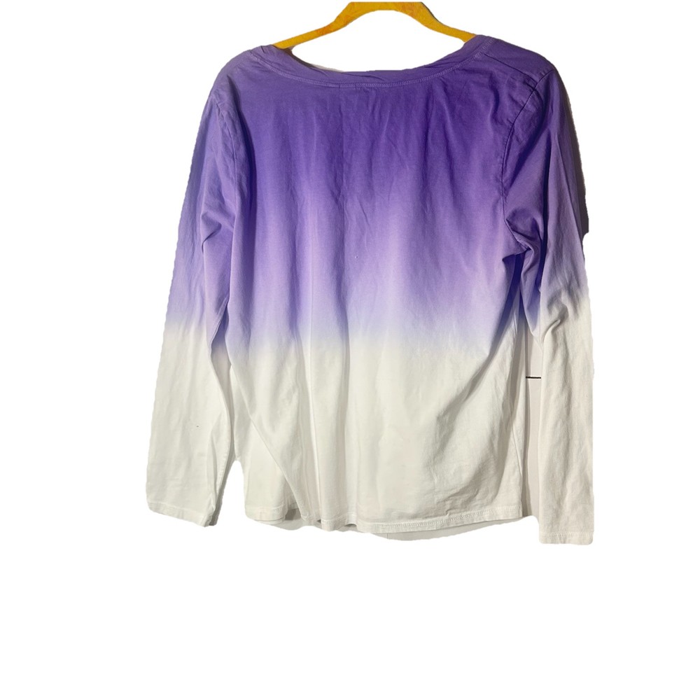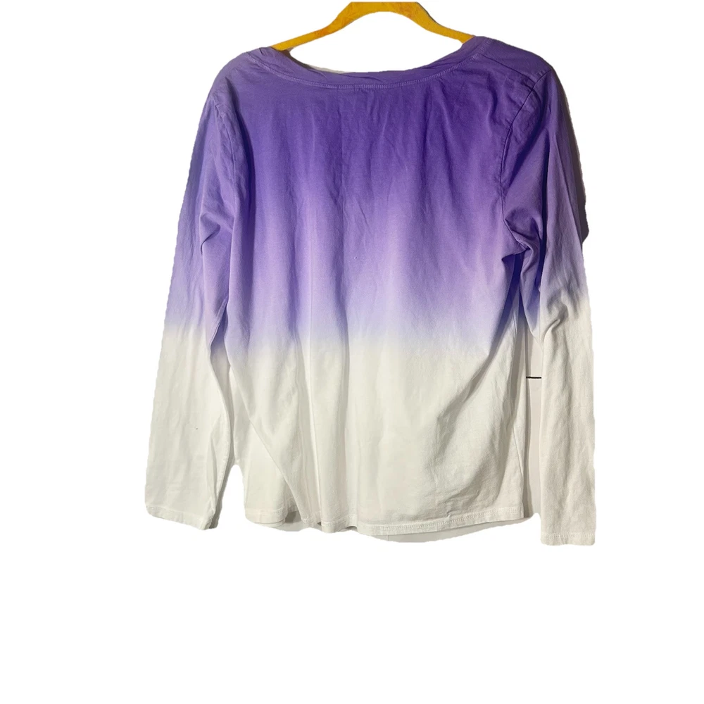 Brand new Hello, Thank you for looking Please be sure to follow my store as I will continue to have couture rodeo drive like pieces for men and women . Please send an offer if your interested we respond immediately:) Length 25.5 Pit 22 Arm 22.5 Please be sure to ask me about shipping discounts if you purchase more than one item! The Ocean Dipped Purple Long Sleeve Tee is a casual top made by Candace Cameron Bure. It features a scoop neckline and pullover closure, with long casual sleeves and a knit fabric type. The top is made of 100% cotton and is machine washable. It is a basic style in a size large, with a dip dye pattern in purple.
