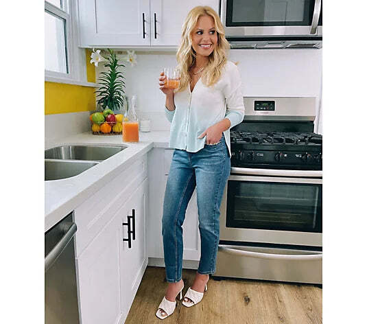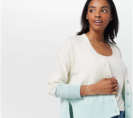 New Without Tags Features: button-front closure, V-neckline, dropped shoulders, long sleeves, dip-dyed ombre print, side slits, ribbed cuff and hemline Fit: relaxed fit; generously cut with maximum wearing ease Length: missy length 21-1/2" to 23-5/8"; plus length 25" to 28-1/2" Content: 100% cotton Care: machine wash, dry flat Imported E12Z