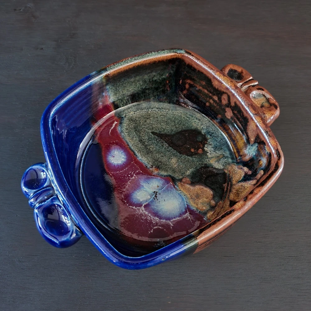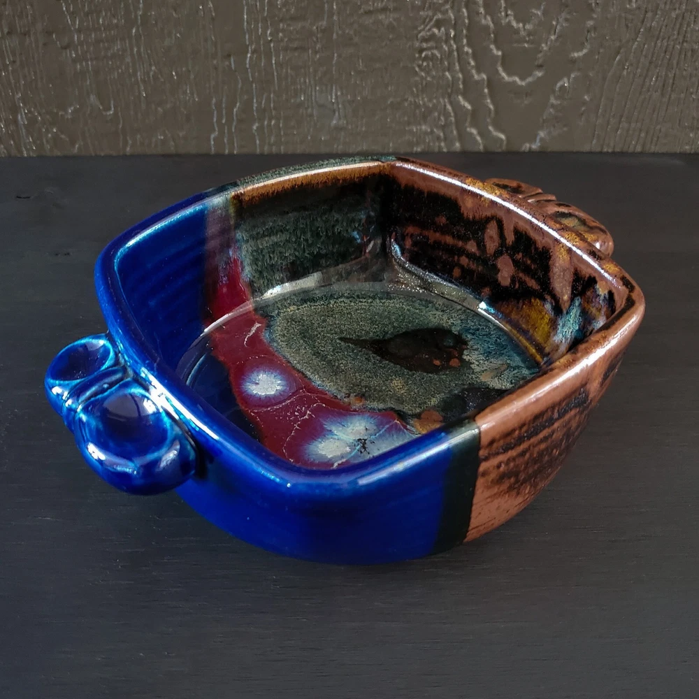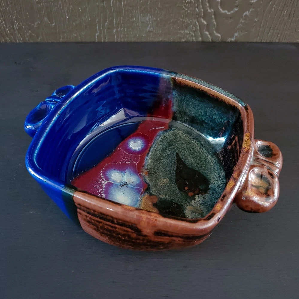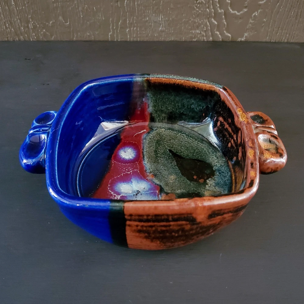 Canyon Creek Pottery Kenneth Merrill handmade dish. - Canyon Creek Pottery is a working pottery studio and adjoining gallery that features the functional pottery made by Kenneth Merrill located in beautiful Sisters, Oregon a small town nestled in the foothills of the Three Sisters Wilderness. Kenneth says, "I work with the finest clays available and fire my work to cone 10 (2400 degrees) in a reduction atmosphere, this makes my pottery very durable and beautiful. The high firing hardens the clay, and the reduction reacts with the chemicals in the clay and the glaze to produce beautiful colors and effects." - High gloss drip glaze in mixture of blue, brown, red, white tones - Stamped on base - Excellent condition with no cracks or chips Measurements: 8 3/8" x 6 1/5" x 2 5/8"