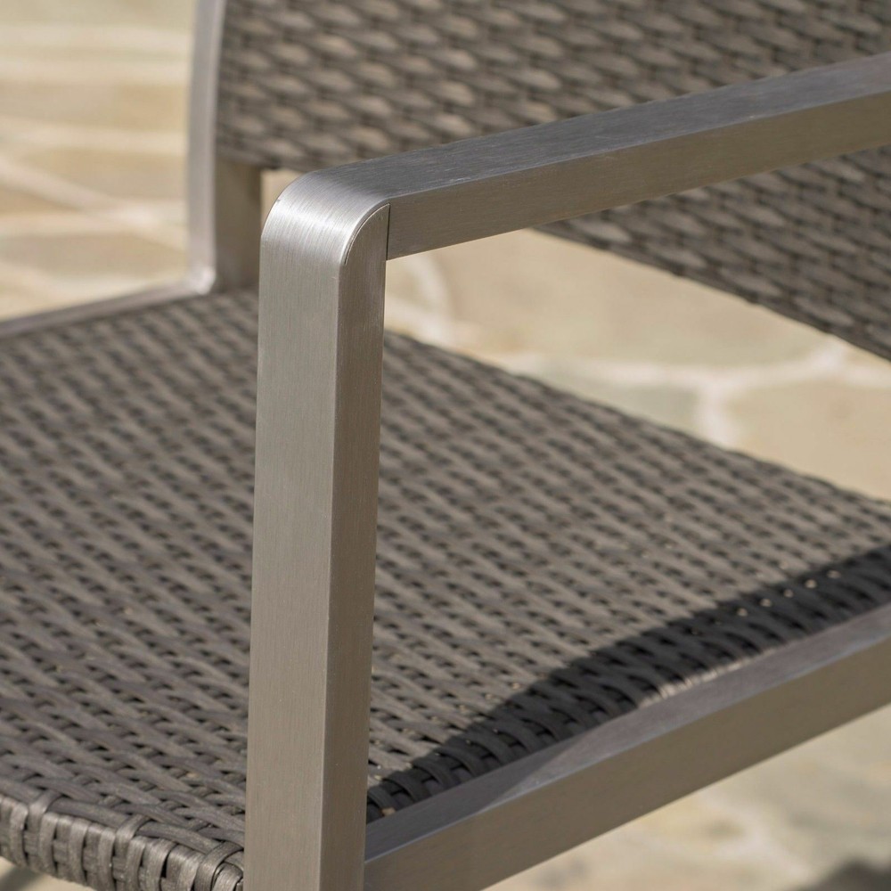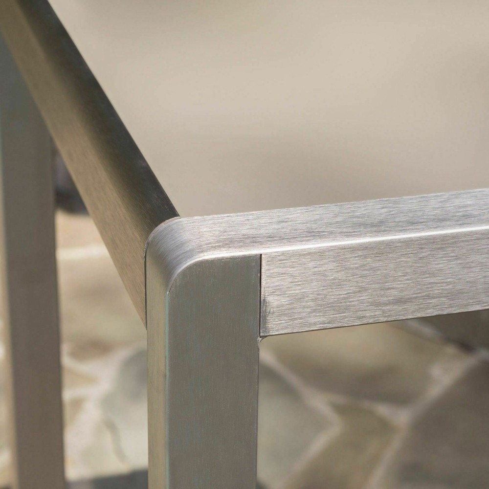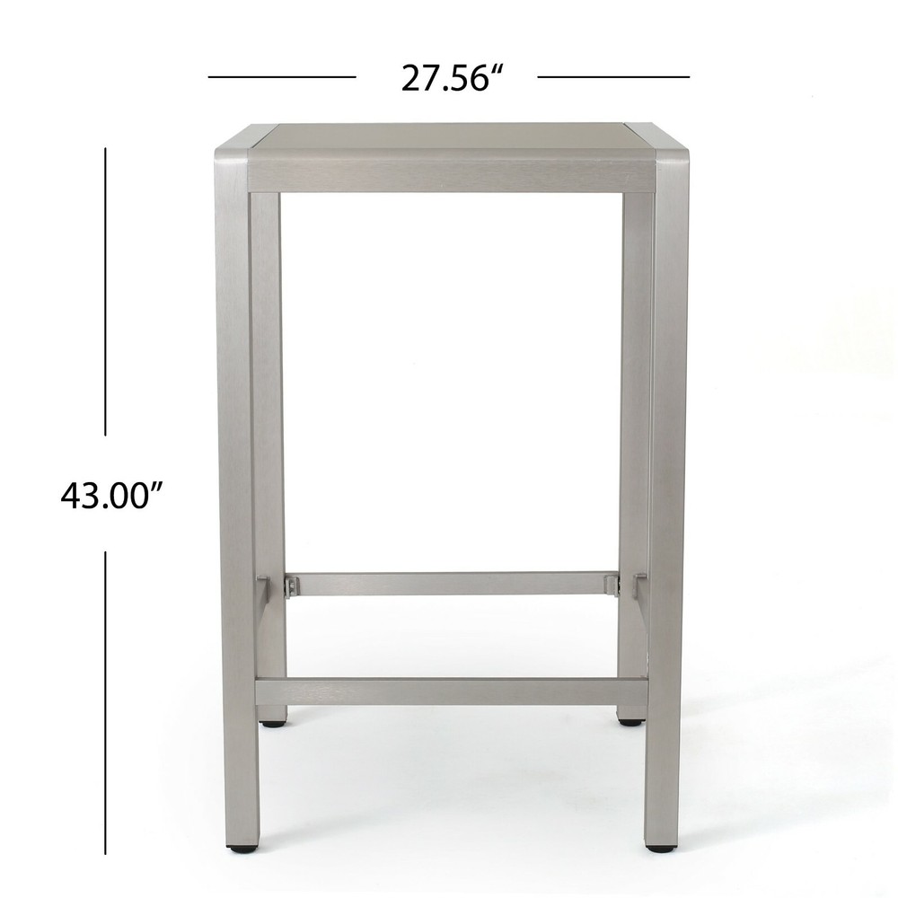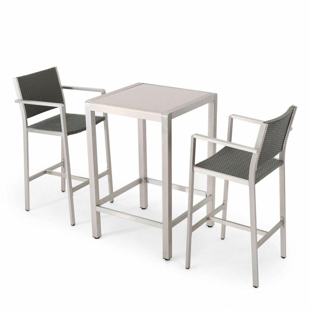 This outdoor bar set features two bar stools and a bar table and is a perfect accent to any patio or barbeque area. The stools feature a durable wicker body and a light-weight aluminum frame. The table features the same light-weight aluminum frame and a glass top. This space saving set is built for having a good time in your yard. Features: Includes Two (2) Barstools and One (1) Bar Table Barstool Material: Polyethylene Wicker Table Material: Tempered Glass Frame Material: Aluminum Wicker Finish: Grey Frame Finish: Grey Assembly Required Dimensions: Table Dimensions: 27.56"D x 27.56"W x 43"H Chair Dimensions: 21.75"D x 22.25"W x 45.00"H Seat Dimensions: 17.50"D x 19.25"W x 29.50"H