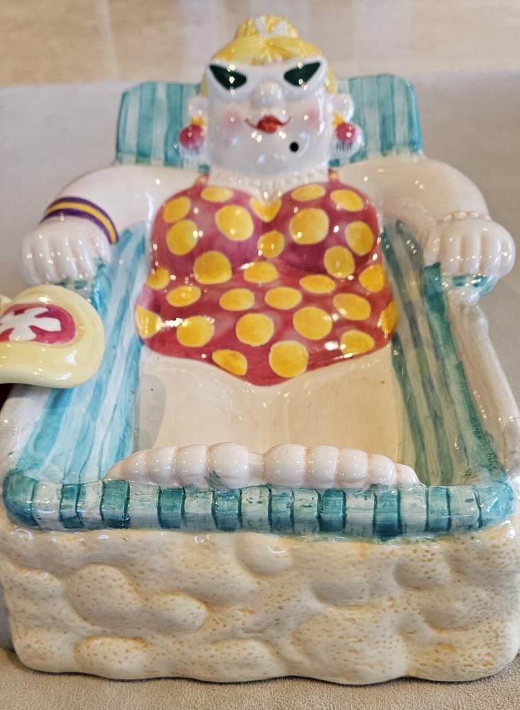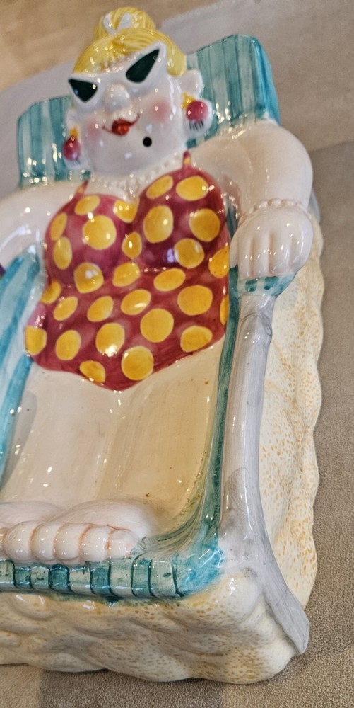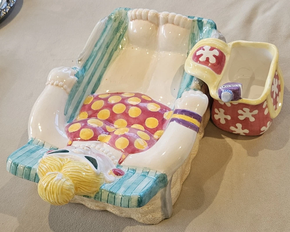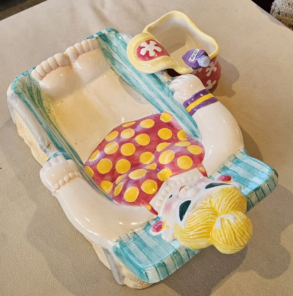 Cardinal Inc. Bathing Beauties Chip and Dip Set Rare Vintage Excellent Condition The most adorable Chip and Dip set! This lovely lady sunbathing in her beach chair holds the chips, and her little beach bag holds the dip. This piece is from the 90s and pretty rare to find both pieces in such great condition. No chips or cracks. Dimensions Beach Chair 15" L 9 1/2" W Dip dish 5 1/2" D 5" W 3" D Smoke-free, pet friendly home.