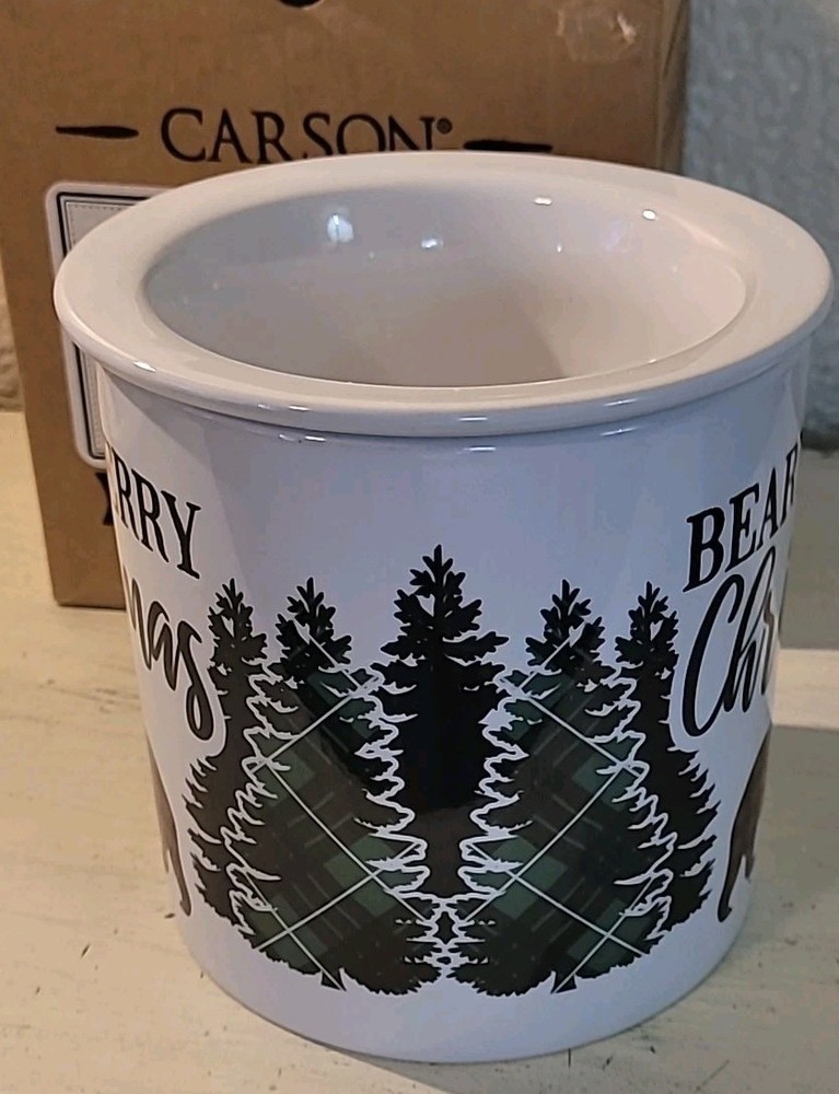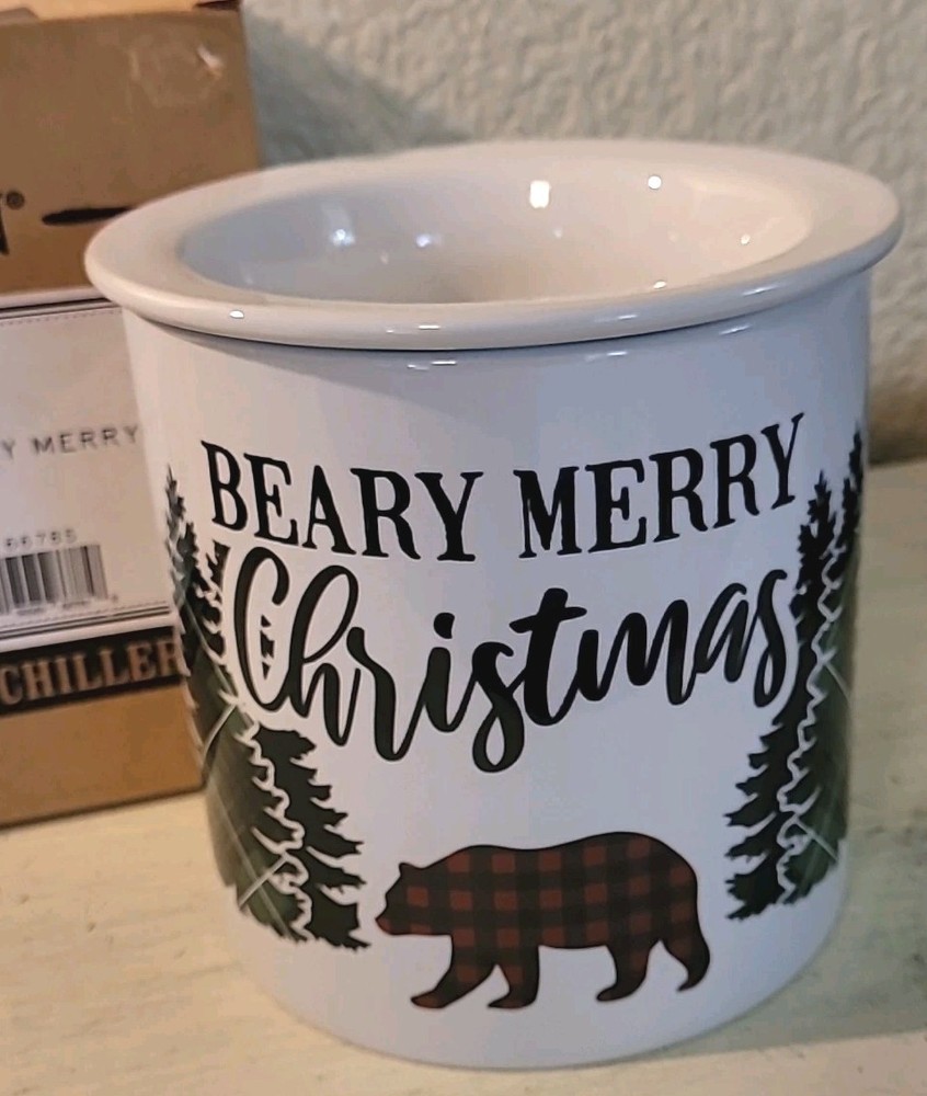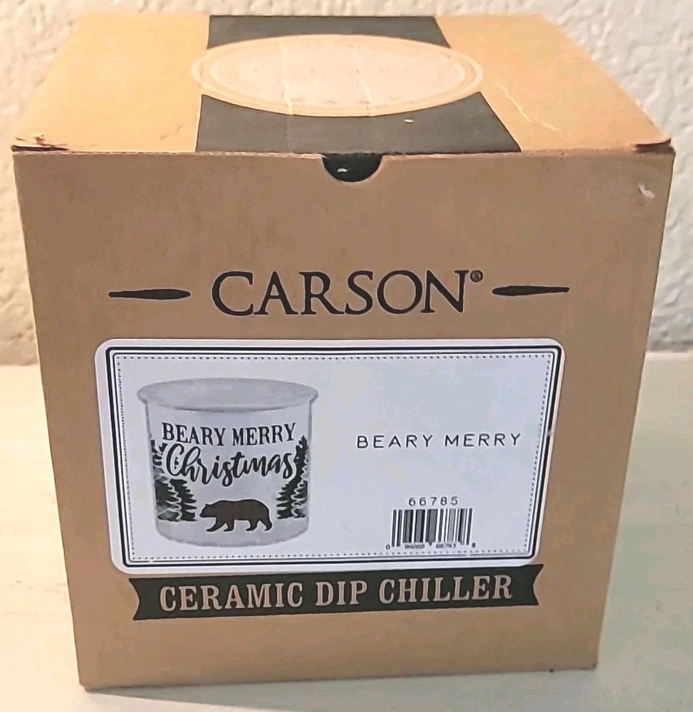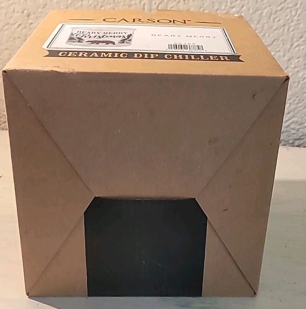 The Carson Ceramic Dip Chilier Beary Merry Christmas is a charming two-piece set featuring a round bowl with a festive bear and winter Christmas theme. The dip chilier is made from ceramic with a matte finish, showcasing a white base with red, black, and green accents showcasing trees with black writing. Manufactured in 2020 by Carson, this traditional-style dip chilier is perfect for serving holiday treats during Christmas. Ideal for adults, this unique and original piece adds a touch of Christmas cheer to your dining experience. New Inbox. Please refer to the photos the top Styrofoam has broken. I will add bubble wrap when shipping. This is a new chiller and holds over 2 cups of your favorite dip or snack. Thank you for your time looking.