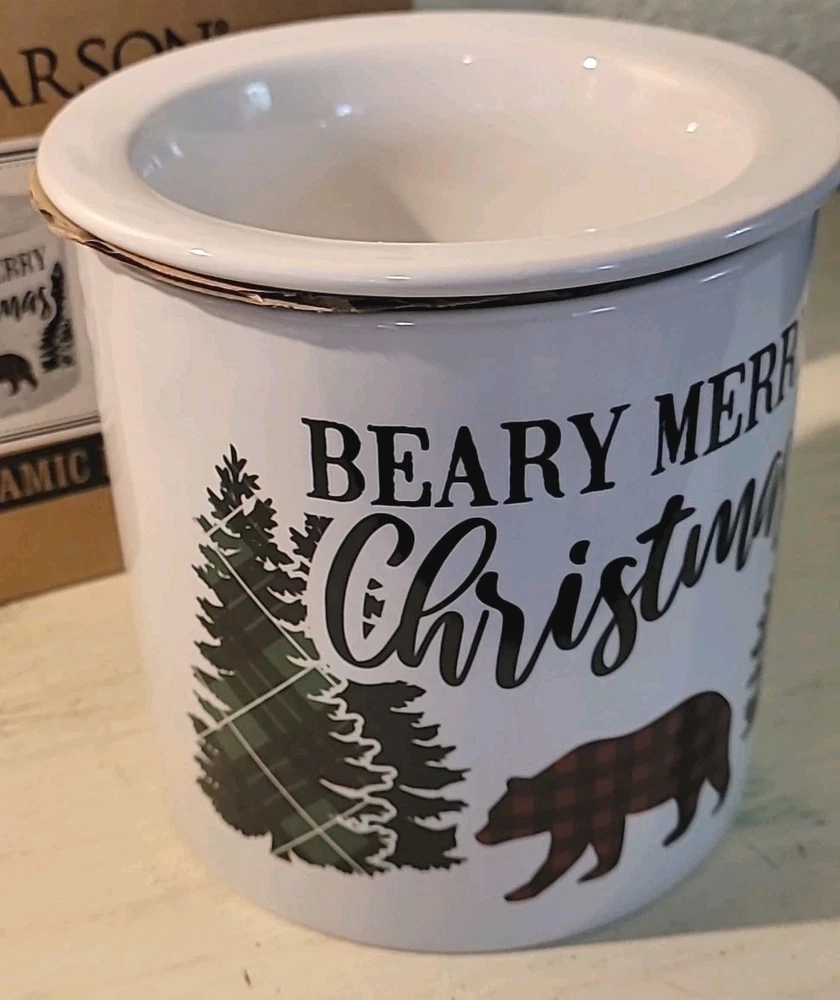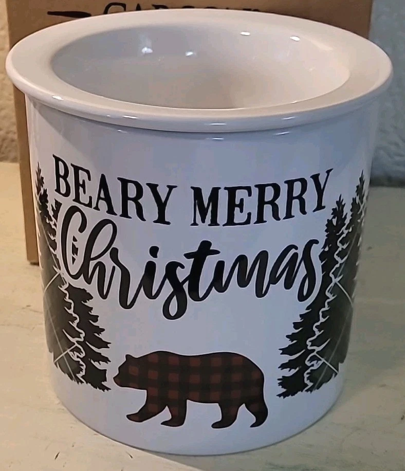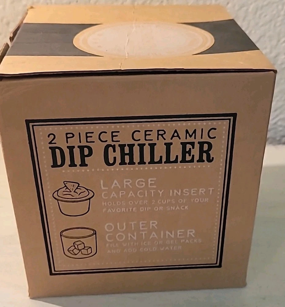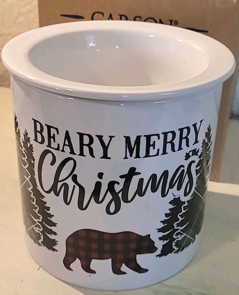 The Carson Ceramic Dip Chilier Beary Merry Christmas is a charming two-piece set featuring a round bowl with a festive bear and winter Christmas theme. The dip chilier is made from ceramic with a matte finish, showcasing a white base with red, black, and green accents showcasing trees with black writing. Manufactured in 2020 by Carson, this traditional-style dip chilier is perfect for serving holiday treats during Christmas. Ideal for adults, this unique and original piece adds a touch of Christmas cheer to your dining experience. New Inbox. Please refer to the photos the top Styrofoam has broken. I will add bubble wrap when shipping. This is a new chiller and holds over 2 cups of your favorite dip or snack. Thank you for your time looking.