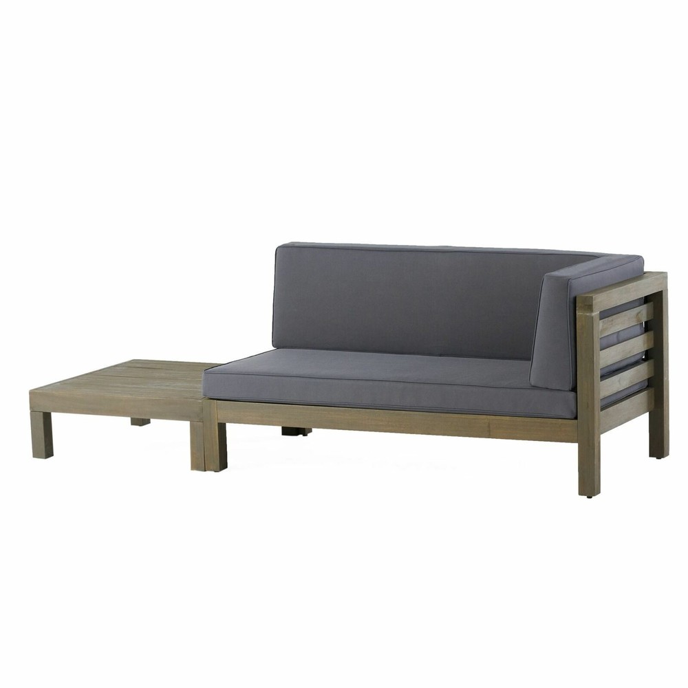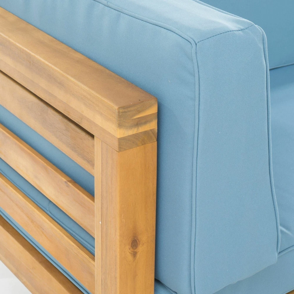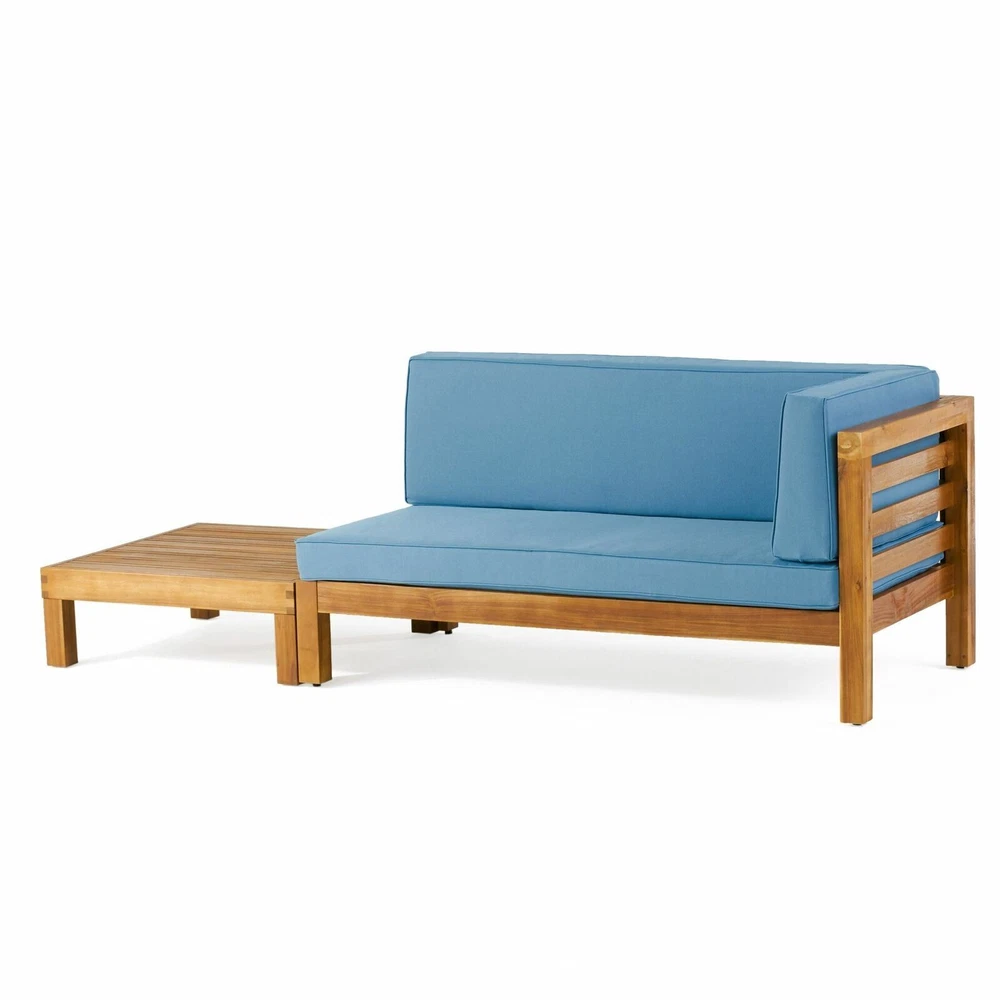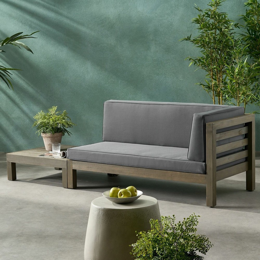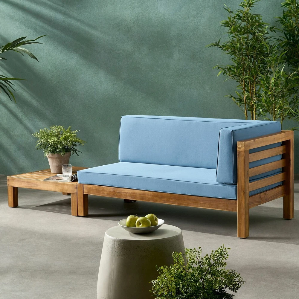 Comfortable home seating is essential for your outdoor space, so why not choose something that is brimming with rustic yet modern style? Our exquisite right-armed loveseat and coffee table set brings together rich acacia wood and slat paneling to create a breezy and comfortable space for your patio or backyard space. Finished with plush outdoor cushions and a slat panel coffee table, this set will have no problem blending into your outdoor decor with its modern style and incredible durability. ACACIA WOOD FRAMES: Made with acacia wood that brings a sleek and exotic look to your space, this durable hardwood naturally withstands outdoor elements and will not darken over time. Acacia wood is perfect as a solid, heavy frame that resists wear and tear. WATER-RESISTANT CUSHIONS: Our cushions are covered with a non-porous material that makes cleaning any spill a breeze. Please note that these cushions are water-resistant and not waterproof. Please cover when not in use and do not submerge in water. SLAT DESIGN: The backrest and seating feature beautiful open slat paneling that matches its straight, clean structure, giving this set a sophisticated, classic look. The matching coffee follows this motif, offering this set a wonderfully homey feel to your decor. DIMENSIONS: Choose an accessory that is the perfect size for you and your furniture. This right-armed loveseat has overall dimensions of 58.25" W x 30.25" D x 26.50" H and the coffee table is 29.50" W x 29.50" D x 10.25" H. You will love how much your space can transform with the simple addition of this chat set. ASSEMBLY REQUIRED: Some assembly is required for this set. All of the instructions and tools needed for assembly are included. This set includes one loveseat and one coffee table. Includes: One (1) Right-Arm Loveseat, One (1) Coffee Table Frame Material: Acacia Wood Cushion Material: Water-Resistant Fabric Multiple Color Options Loveseat Dimensions: 30.25 inches deep x 58.25 inches wide x 26.50 inches high Loveseat Seat Dimensions without Cushion: 28.00 inches deep x 56.00 inches wide x 10.25 inches high Seat Cushion Height: 4.00 inches Arm Height: 26.50 inches Weight Capacity: 600 lbs Coffee Table Dimensions: 29.50 inches deep x 29.50 inches wide x 10.25 inches high Weight Capacity: 240 lbs