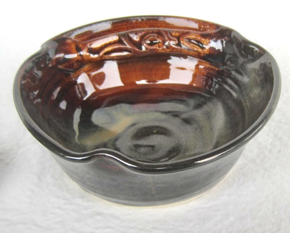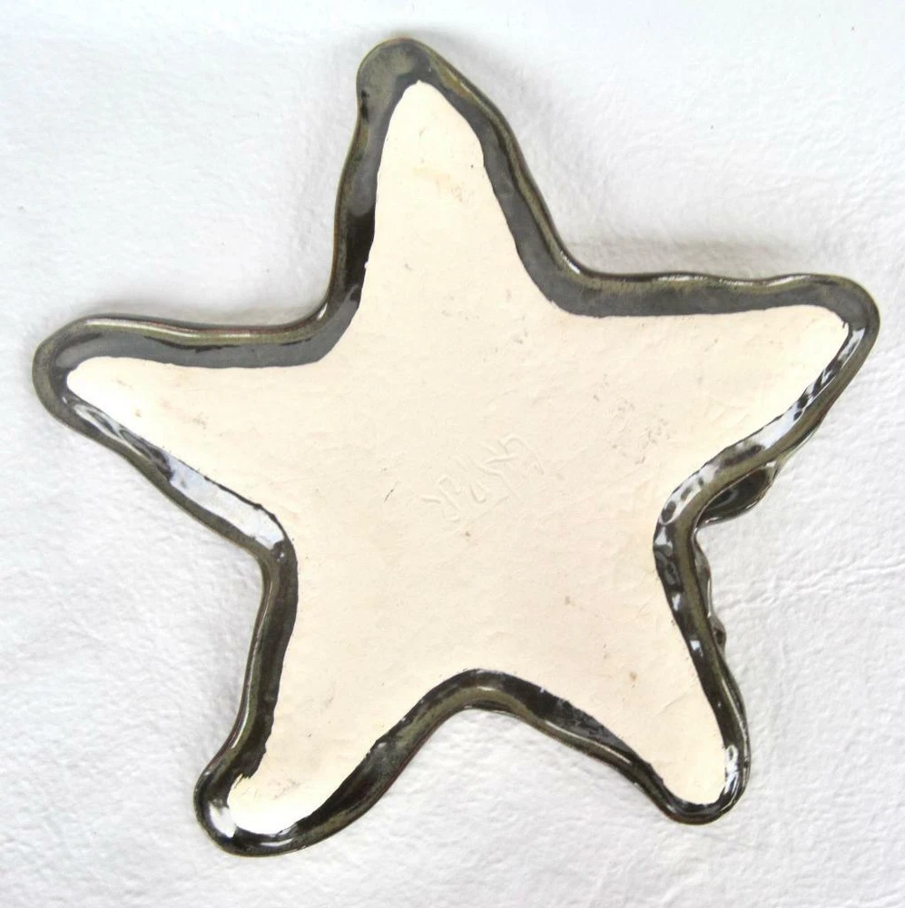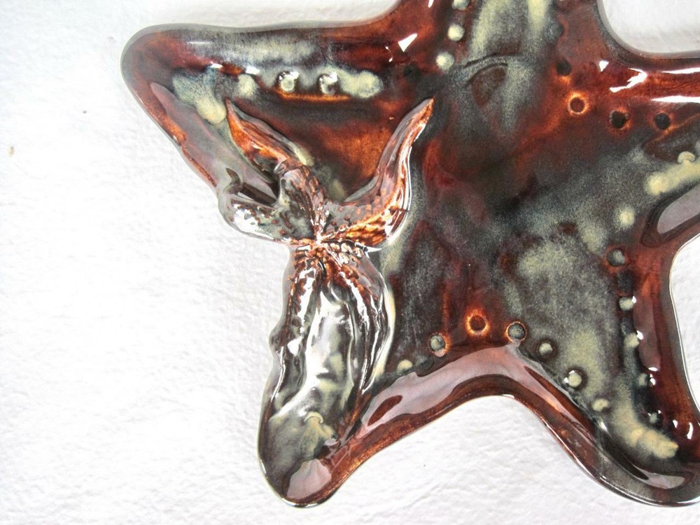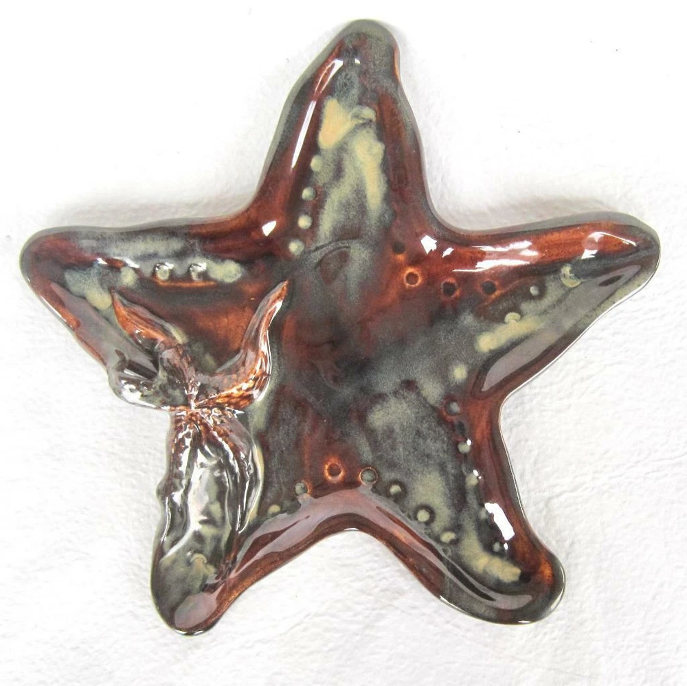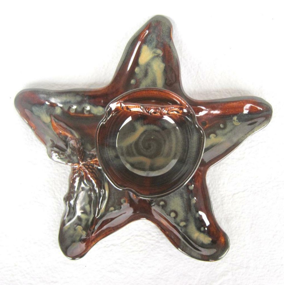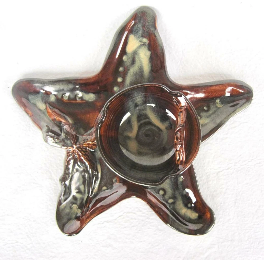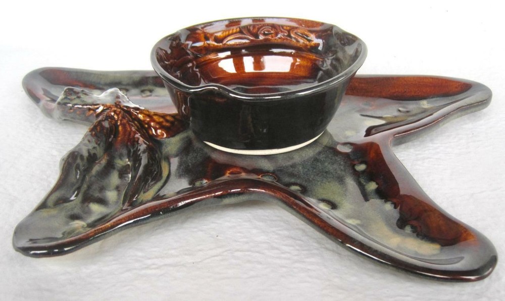 Vintage Studio Art Pottery Starfish Shaped Chip & Dip Bowl Signed Casper 12" Vintage Studio Art Pottery Starfish Shaped Chip & Dip Bowl Signed Casper 12" Click images to enlarge Description Featured in this listing is a 2 piece, studio art, star fish shaped pottery chip and dip set with bowl, signed by the artist. This high gloss, beach themed, piece is textured in high gloss finish with mottled browns with streaks of blue is signed by the artist Casper on the bottom of each piece. A small raised starfish rests on the side of the bottom plate. The the bottom plate is large, 12" by 12". The bowl is 5" wide in diameter across the top and is 1.75". Set weighs almost 3 lbs. This item may have been used and or displayed. Item is in very good condition I do not see any chips, cracks or other condition issues. Please view my pictures for features, details, contents and condition of this unique item. Returns are accepted and refunds gladly given upon original item receipt and inspection. Please contact me if you have any questions about an item you have received. I welcome questions. Get images that make Supersized seem small. Showcase your items with Auctiva's Listing Templates! THE simple solution for eBay sellers. Track Page Views With Auctiva's FREE Counter