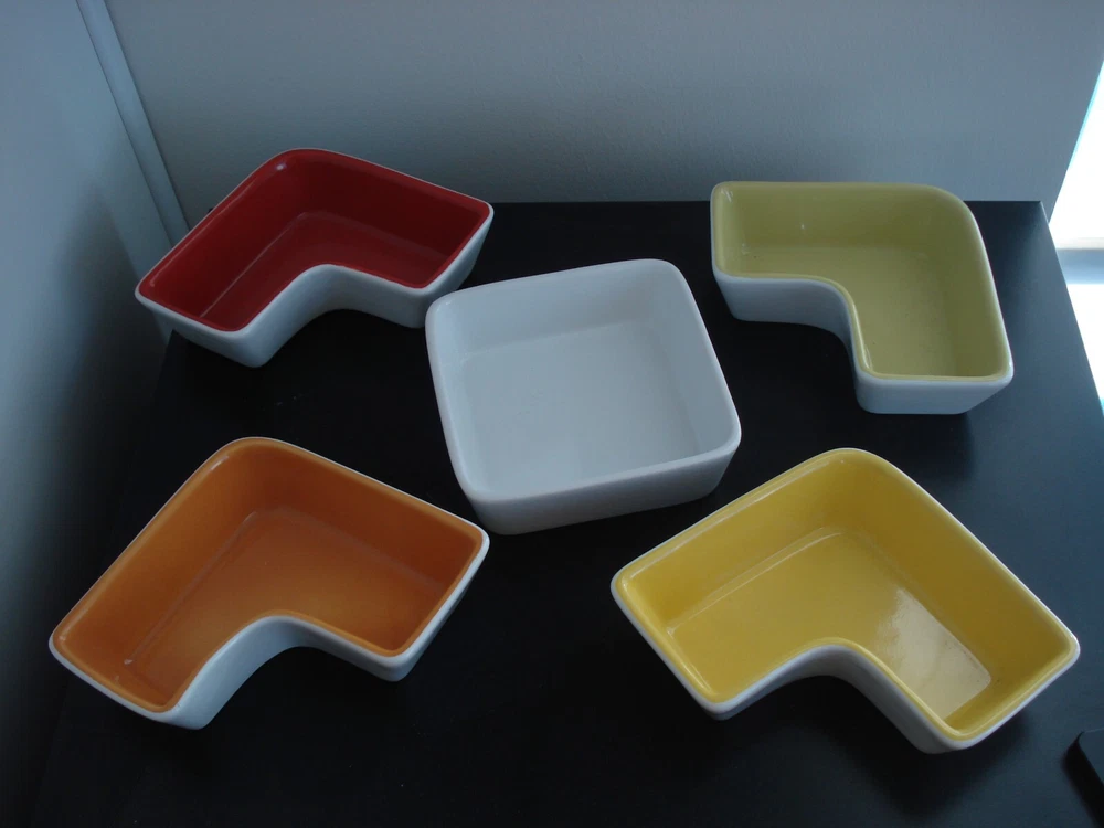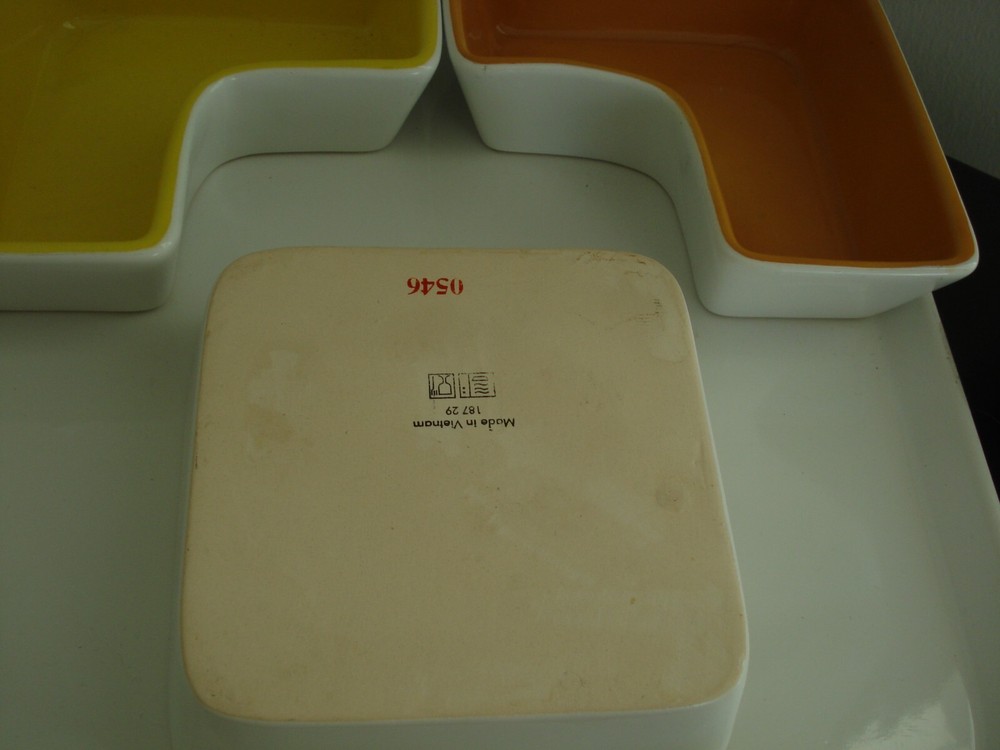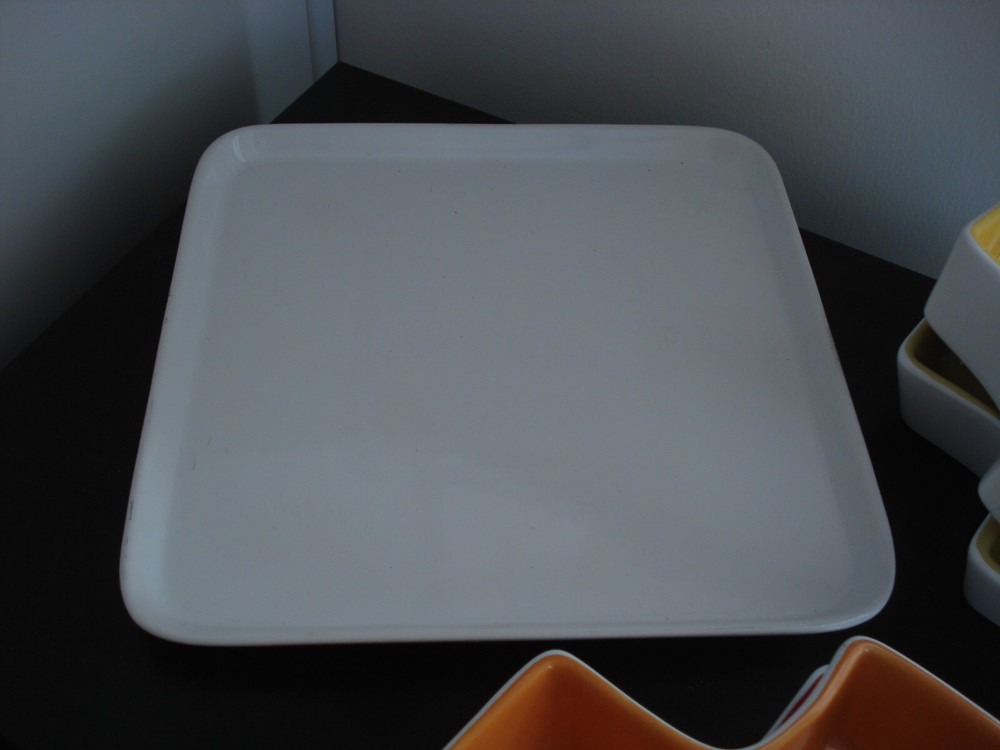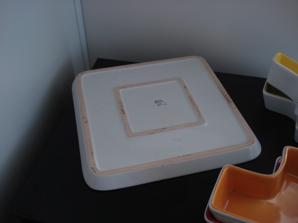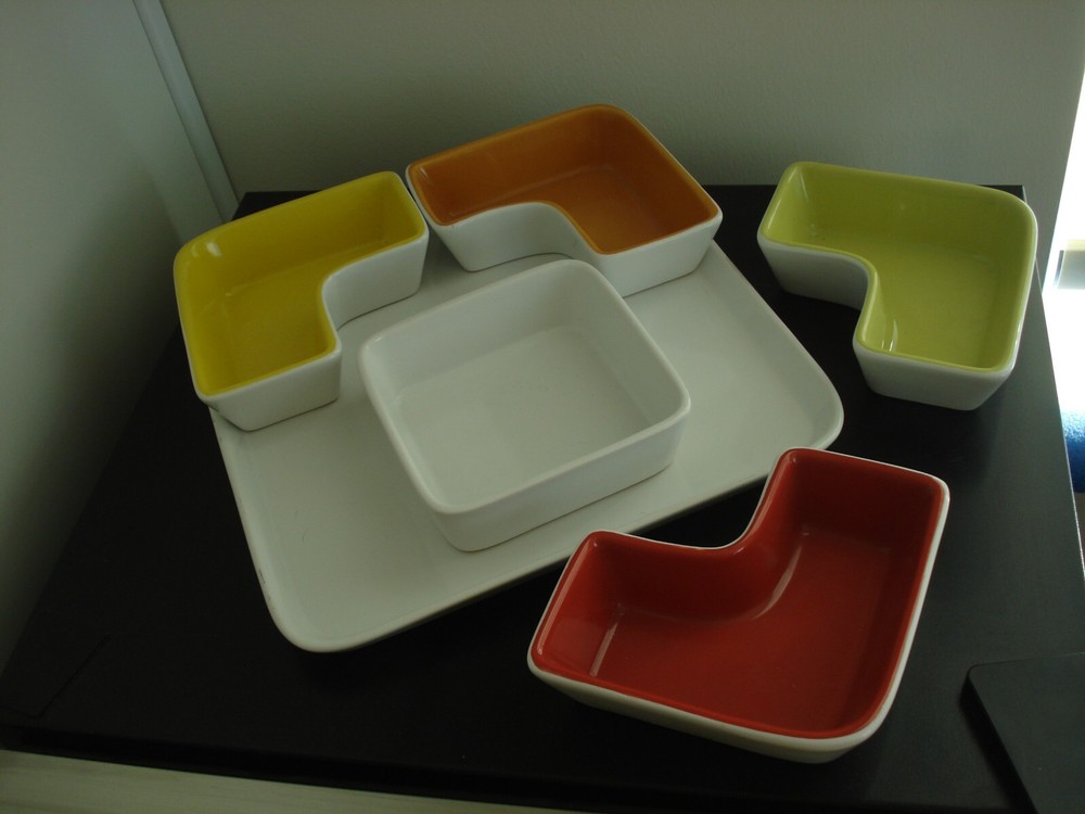 Ceramic Appetizer Serving Platter w/5 sauce/dip individual removable Bowls stricking coloring of white - main plate, green, orange, red, yellow removable bowls main serving plate measures: 11" x 11" x 1'H center, white square bowl measures: 5" x5" x1 1/2" each surround the center white dip bowl - is an L-shape very heavy serving piece no visible damage *** for breakables *** ship UPS *** to ensure your purchase arrives intact *** eco-friendly seller recycle/reuse shipping pkging smoke-free home