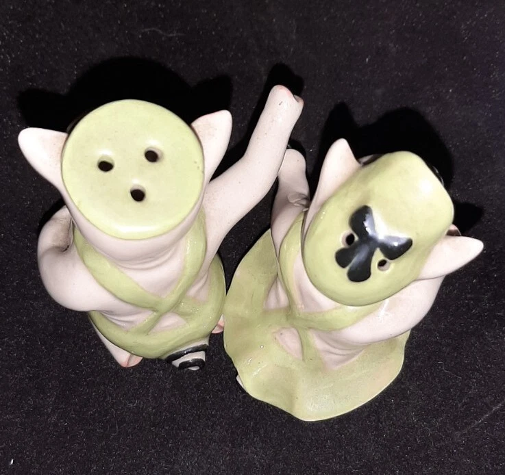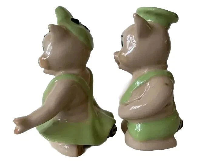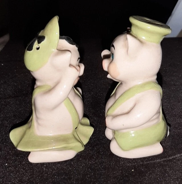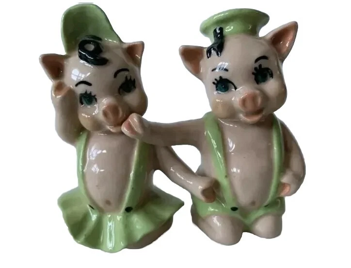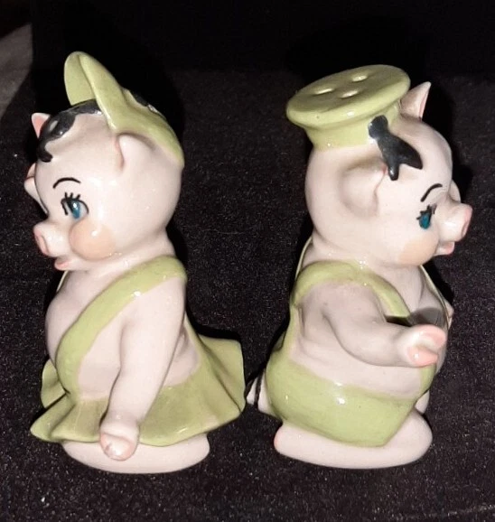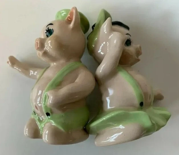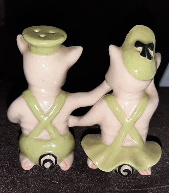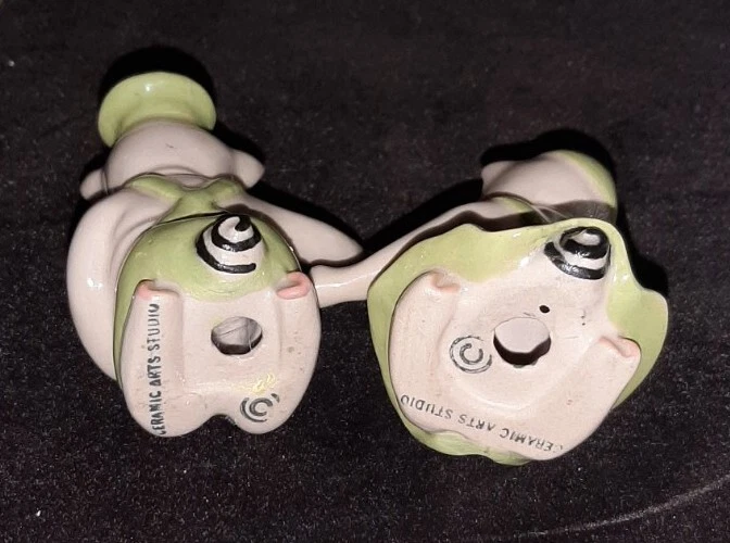 Created in the 1950s by the Ceramic Arts Studio of Trenton, NJ, these adorable pigs stand 3.25" tall by 2.5" wide. They were designed by artist Betty Harrington. These shakers are in excellent shape, no chips, crazing or fading.