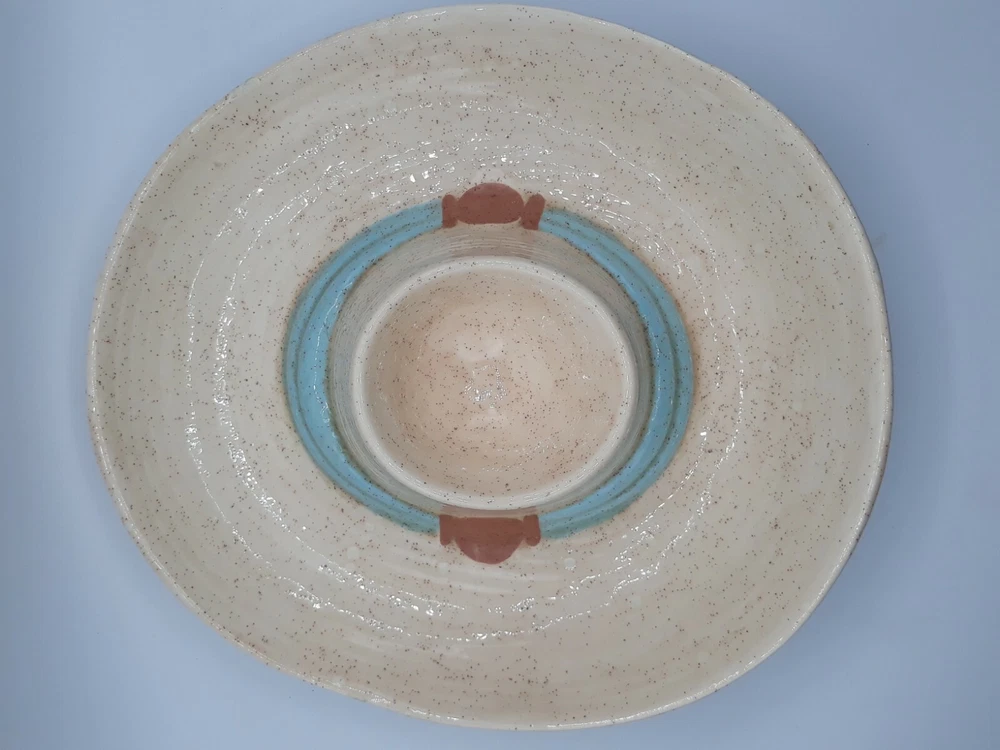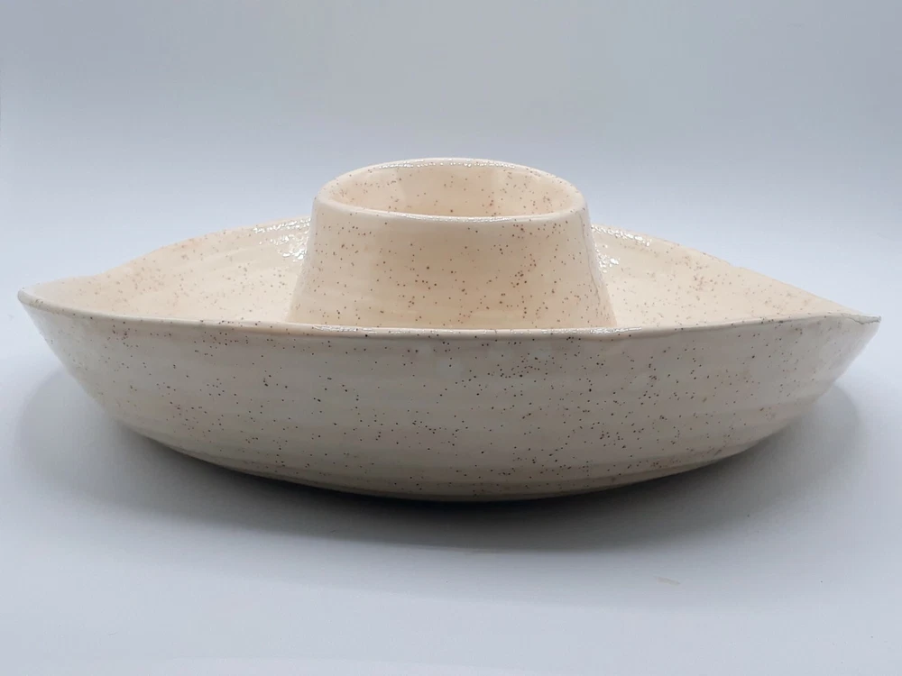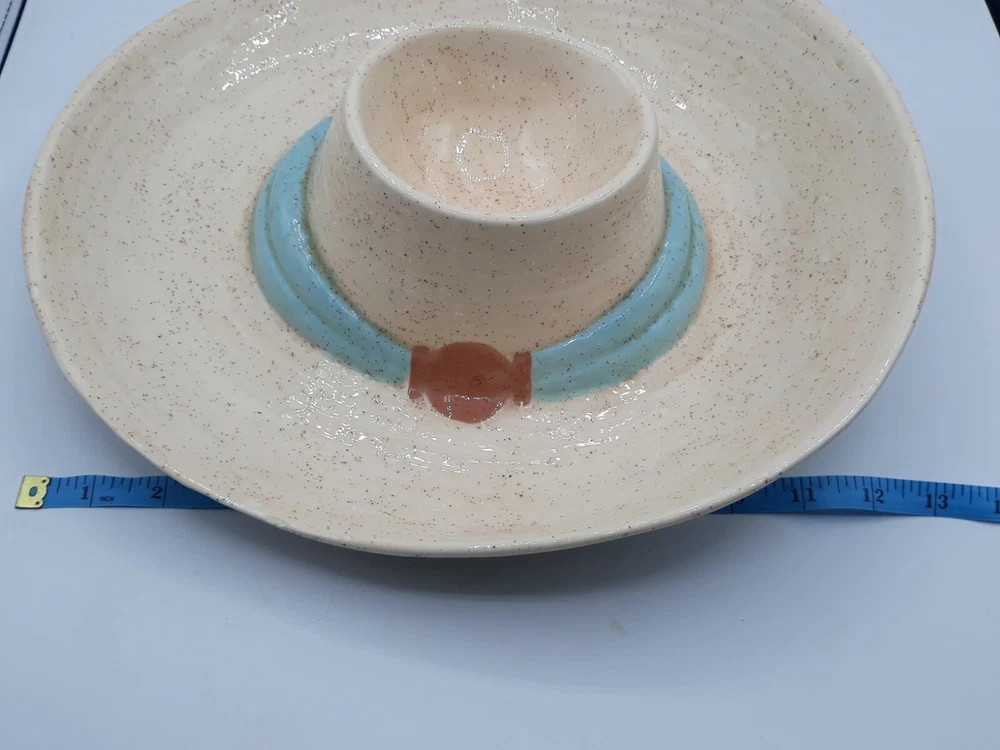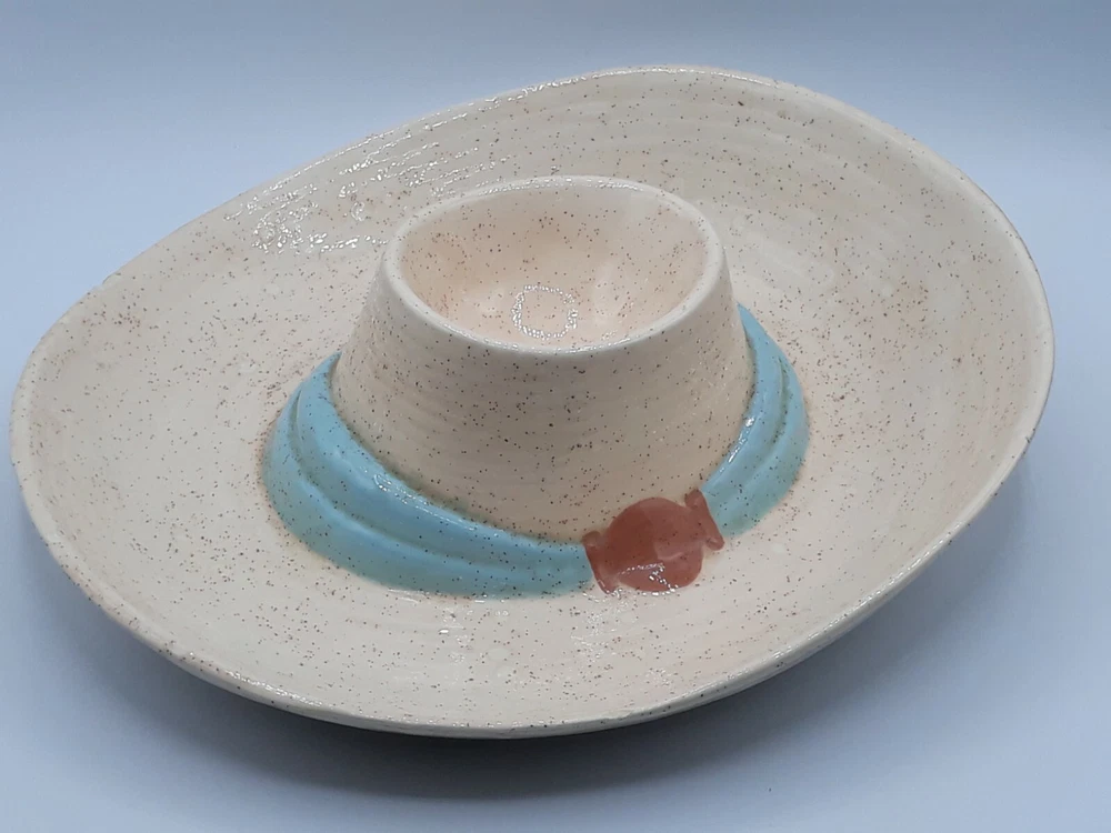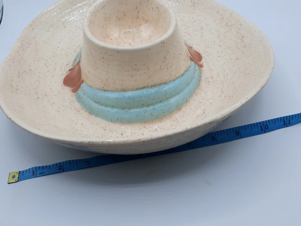 Ceramic Cowboy Hat Serving Platter Dip 13" Signed. Very unique serving platter for all occasions and types of parties and events. The party host(ess) would place chips or dry foods in the outer area of the cowboy hat and the inner compartment is perfect for dips or whatever you prefer! Handmade folkart is a conversation starter and one of a kind piece to add to your collection. Get togethers and family reunions are a hit with family heirlooms that everyone will remember. Capture your western spirit! This one of a kind piece will be wrapped carefully and thoughtfully. We have shipped many precious pieces and take pride in getting your valuable item to you safely. Please see photos for exact status of condition. Use the zoom feature to inspect even closer. The item you see is the same one you will receive. OOAK serving platter dish!