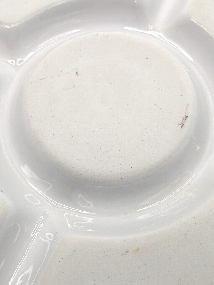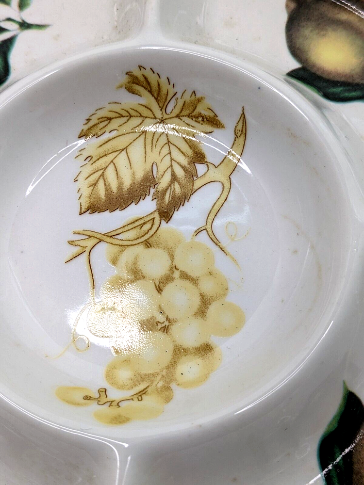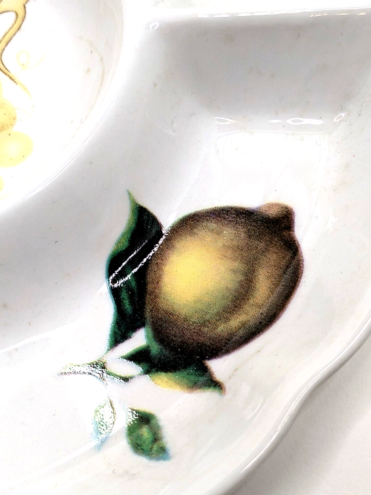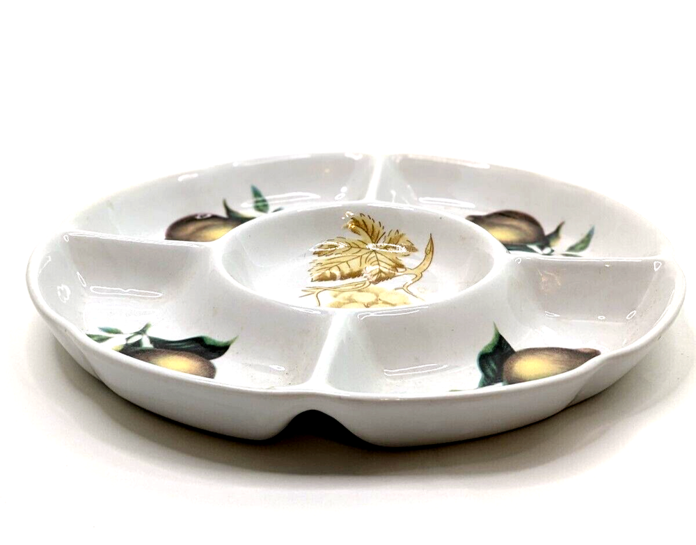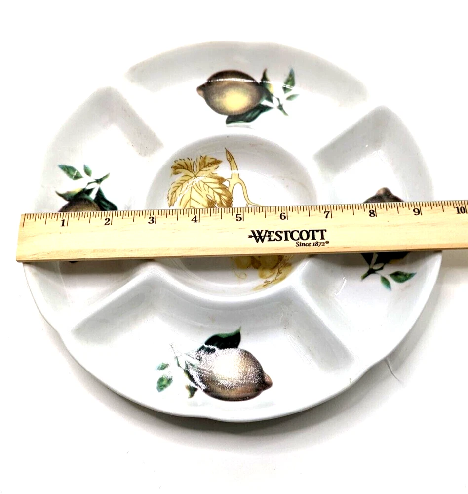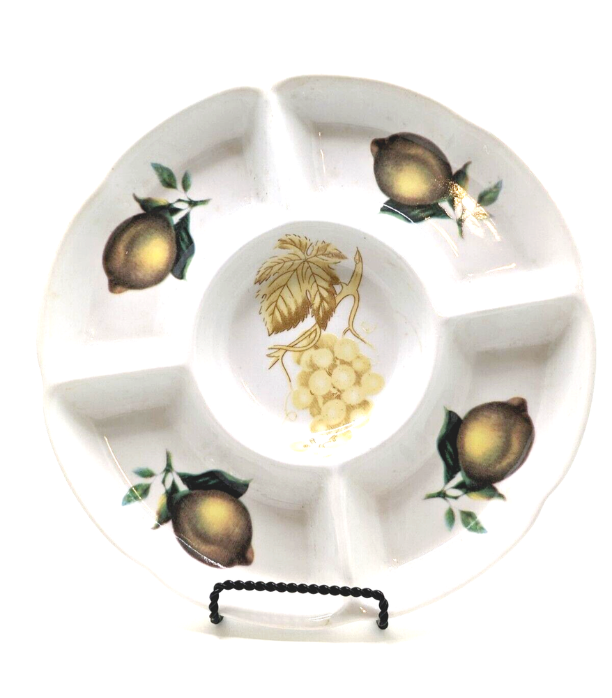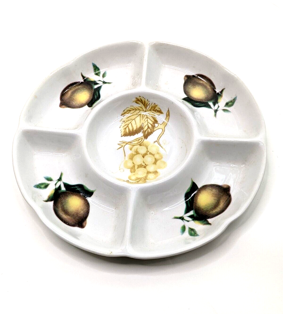 Ceramic Divided Crudité Chip Dip Appetizer Serving Dish - Lemons & Grapes Design. Unbranded; divided into 5 compartments. Excellent pre-owned condition; no chips, cracks or crazing noted. Please review all photos carefully. Measures 9.75" in diameter and 1" in depth. Will be packed carefully and shipped USPS.