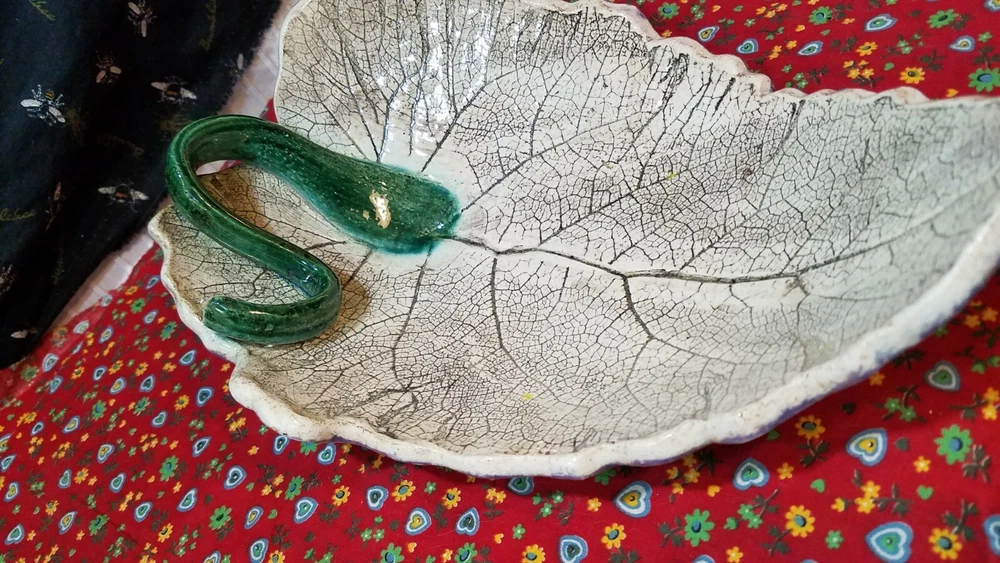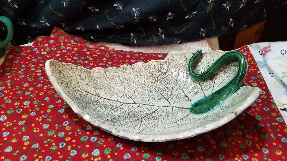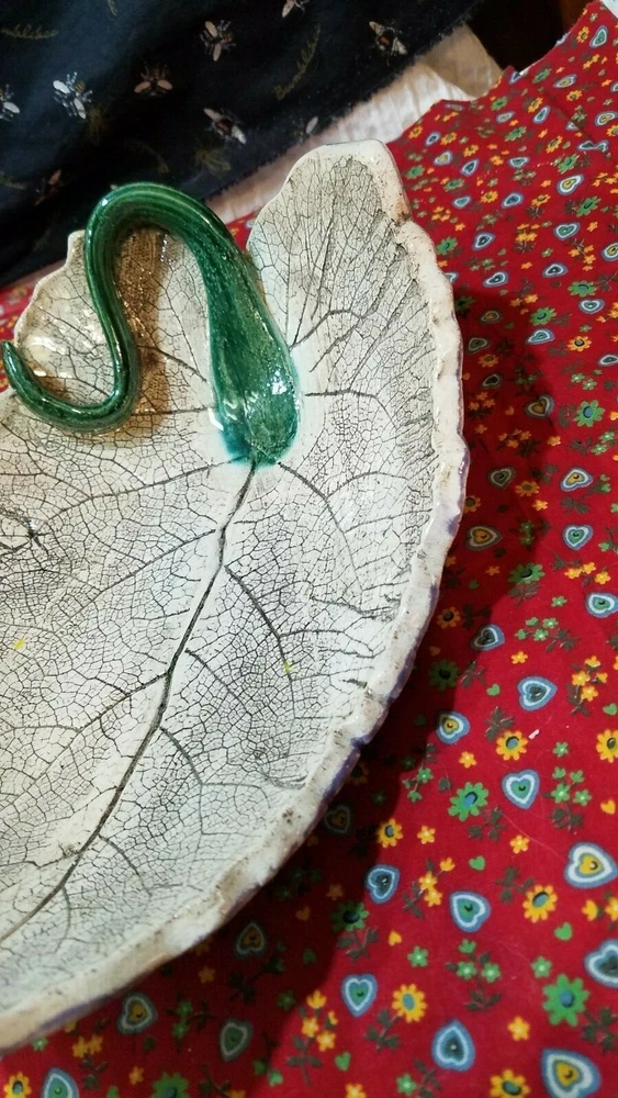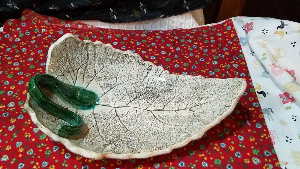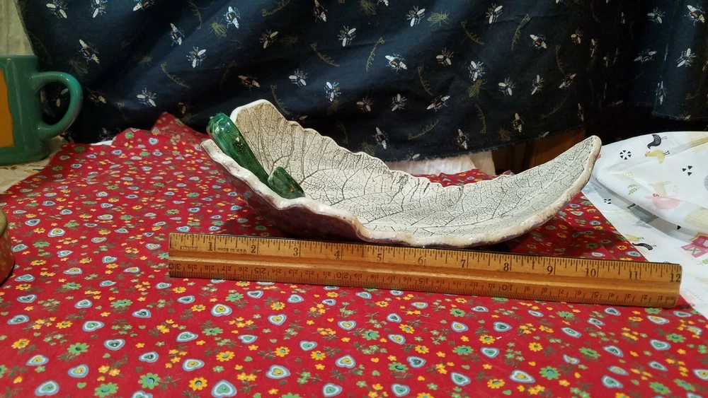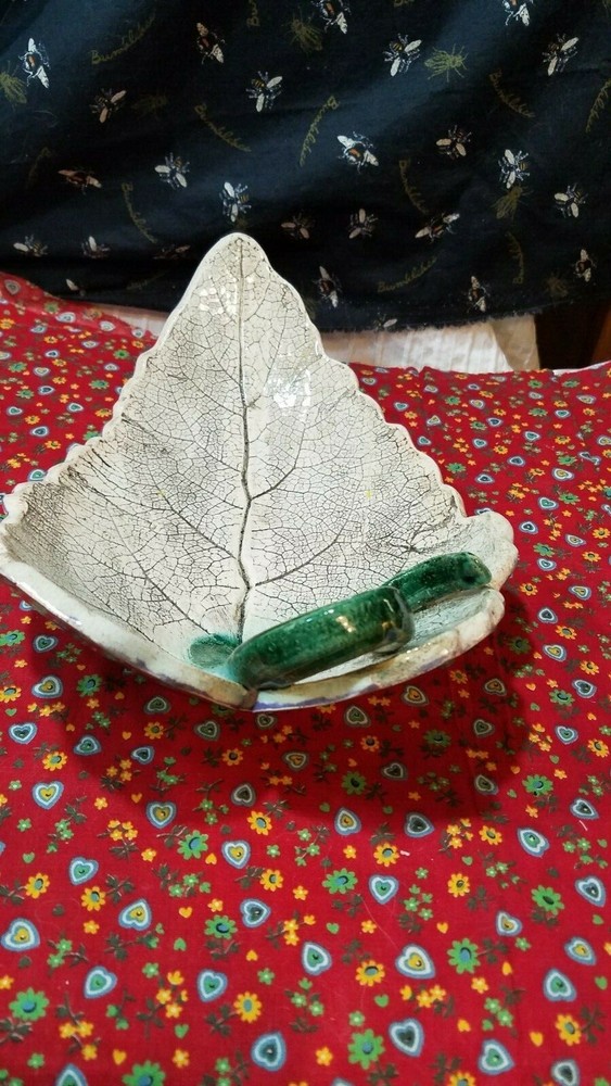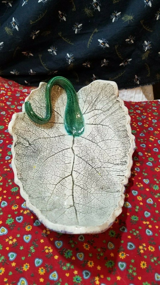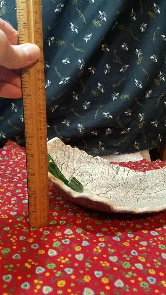 For sale is a very unique ceramic leaf shaped dish. Not sure if the is someone's studio art project or retail piece. Has great detail in the leaf structure and nice colors. Measures: 11" long and 3 1/4" tall at highest point The item is located in a smoke free, pet friendly home. Feel free to email me any questions. Thanks for stopping by and shopping.