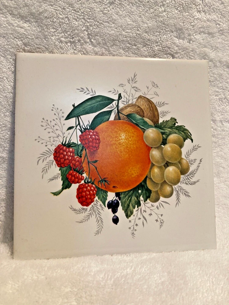Free Shipping. This is a Ceramo Studio trivet or wall decor with fruit, an orange, grapes, nuts, raspberry. It measures 6" by 6" and is in very good condition with no use wear....