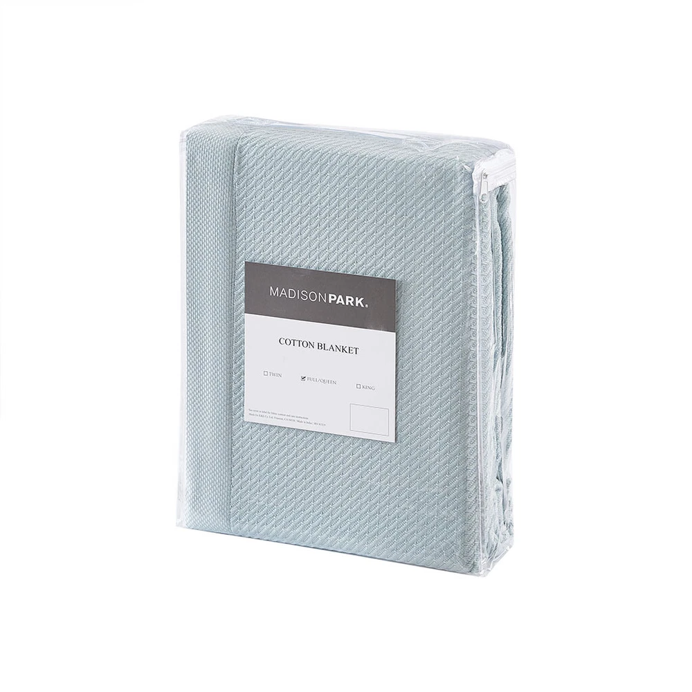 Specification Product Information Item Code:B03598563 UPC:086569182982 Product Type:Single Box Product Product Name:Blanket Place of Origin:India Main Color:Light Blue Main Material:Cotton Product Dimensions Assembled Length (in.):90.00 Assembled Width (in.):90.00 Assembled Height (in.):0.25 Product Weight (lbs.):4.23 Package Size Length (in.):15.75 Width (in.):12.60 Height (in.):3.15 Weight (lbs.):5.51 Product Features Certified Genuine Egyptian Cotton bedding blanket Soft, tightly woven blanket for reduced pilling and snagging Breathable weave for warm nights Machine washable for easy care Oeko-Tex Certified, includes no harmful substances or chemicals Description Description Wrap yourself up in the luxurious comfort of the Madison Park Egyptian Cotton Blanket. This ultra-soft Light Blue blanket in made from 100% certified Egyptian cotton that features reduced shrinkage, pilling, and snagging, for a durable and comfortable feel. The solid pattern of the blanket makes it easy to match with your existing casual decor. Machine washable this Egyptian cotton blanket is perfect for lying across your bed or sofa to keep warm and cozy all year round. Product Details Full/Queen 1 Blanket:90"W x 90"L Material 100% Certified Egyptian Cotton