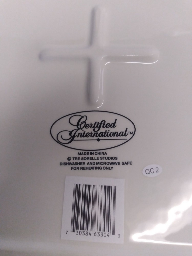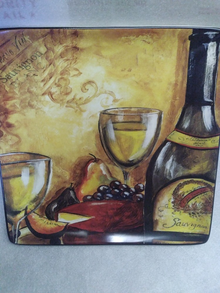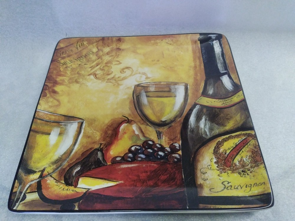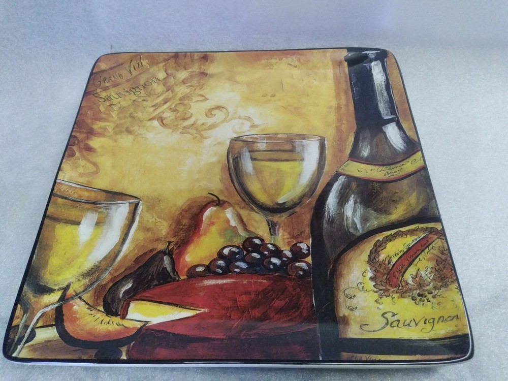 This is a vintage Certified International Tre Sorello Studios platter measuring 12".5 Its part of the "Wine Cellar" collection that has been discontinued, this platter is part of the "Winery Cellar"collection, each piece has its own special design and style with a rich colors and finish. This one is the Souvigan platter. Makes for a real nice setting with any combination of dining ware or use has a decorative piece.. Pictures may have some glare spots from the lighting.. Easel is not included