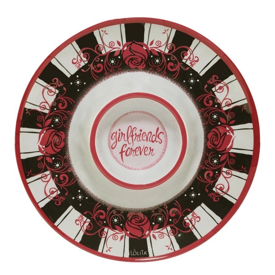 The Certified Lolita "Girlfriends Forever" 14-inch Melamine Chip & Dip Serveware Platter is a fun and stylish addition to your party table. Featuring vibrant, playful designs with the phrase "Girlfriends Forever," this durable melamine platter is perfect for serving chips, dips, or appetizers during gatherings with friends. Lightweight, shatterproof, and easy to clean, it’s ideal for both indoor and outdoor entertaining. Condition: New