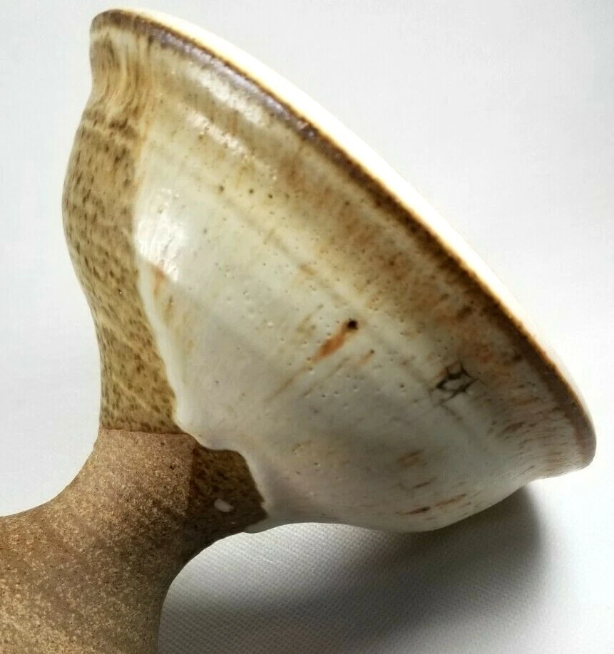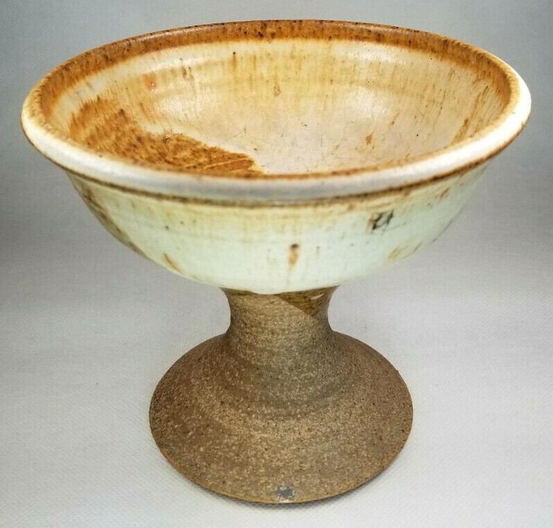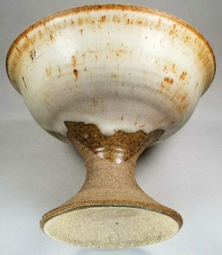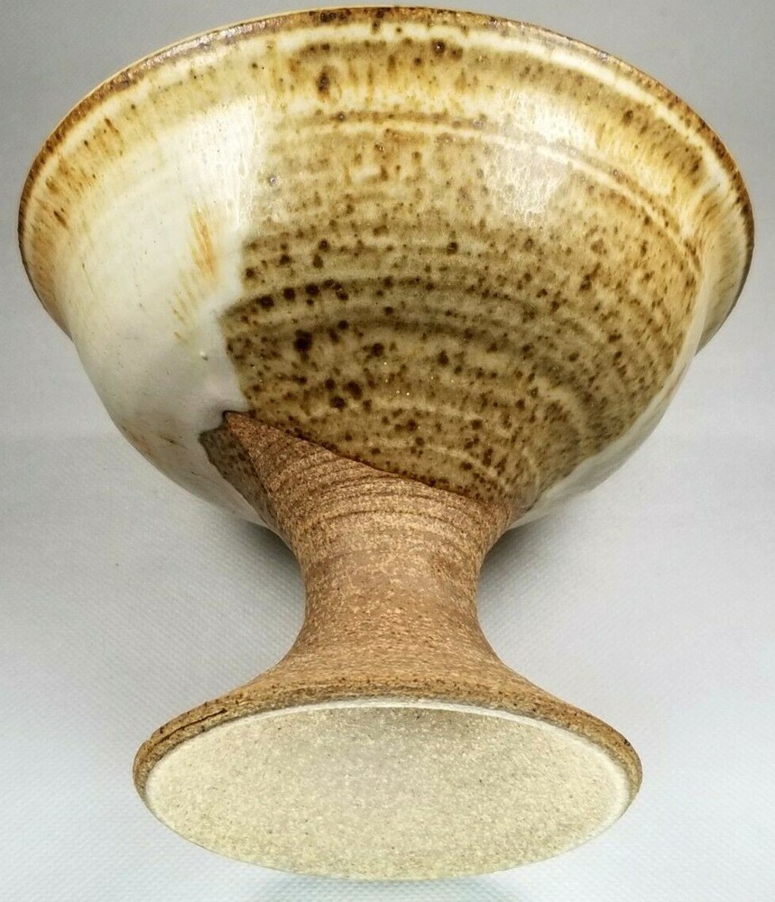 American Art Studio Pottery Chalice Shaped Pedestal Pottery bowl appears to be illegibly Monogrammed along base ca. 20th century. Measures 5" high diameters: top 6" and bottom 3.5" appears to be in good condition as seen in the images. #18977J-137