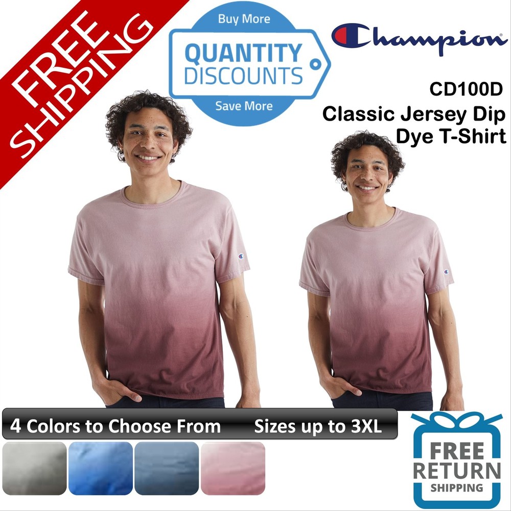 "We stand behind every deal, we have many successful transactions, all with positive reviews. We have been selling items on eBay for the last 23 years." - Easy Free Returns - Deep Volume Discounts - Factory Direct Pricing - All Items are Brand New π₯ Champion Men Classic Jersey Dip Dye T-Shirt Cotton Up To 3XL CD100D Material: 100% Cotton Model: CD100D Weight: 6 oz. Pocket: No Elevate your casual style with the Champion Men Classic Jersey Dip Dye T-Shirt. Made with 100% cotton jersey fabric and weighing just 6 oz., this tee provides ultimate comfort and breathability. Complete with the iconic Champion "C" logo on the left sleeve, this dip dye t-shirt is the perfect addition to any wardrobe. 6 oz., 100% cotton Garment-dyed process results in washed colors with extra depth Set-on, rib crewneck keeps its shape wash after wash Double-needle construction throughout Champion βCβ logo on left sleeve Woven Champion label βAβ List Status from CDP (Carbon Disclosure Project) Energy Star Partner of The Year (12 Consecutive Years) Every piece of Champion Apparel purchased qualifies for Hanes4Education S M L XL 2XL 3XL Body Length 28 29 30 31 33 34 Chest Width (Laid Flat) 18 20 22 24 26 28 Sleeve Length 16 3/4 18 19 1/4 20 1/2 22 1/4 23 3/4 Companion Styles Check out these other great deals on sale -Why does the price change on the listing ? The price for clothing can very largely with in the same product model, by color and size, ebay lists the lowest Options item, more often White, as the starting price. -My items don't have any retail hanging tags, are these 1st quality? We only stock 1st quality products. - No Seconds or Cut Tag flawed items.- the reason we can sell our items at low prices is these are not tagged for retail giants, there come in bulk cases of 72 ready for printing. -Do you have bulk discounts? we are ways working with the manufactures to set the lowest price possible, and we are constantly adjusting our prices to be the lowest they will allow, at this time this item is at the lowest price in the market. -What does x oz. mean on shirt weight? Weight is determined by fabric density, and so it is industry standard to measure 1 inch of cloth to determine its weight by multiplying 1 inch by the amount of square fabric used in the making of the full garment. example a 5 oz shirt is light weight,and 6.1 in heavyweight. -What are "Heather" colors? These are shirts, that to be made are a mix of cotton and polyester, the percentage will vary, these colors have a unique pattern with main color and light color speckles, these shirts are often Options less that the regular color shirts, Heather shirts are mostly named, Ash, Light steel, Birch, Oxford, and Heather something. -Why is White so much cheaper ? White T-shirts are Dyed. Just like every other shirt, but the White dye is the most abundant and cheapest available, because face it cotton is mostly white to start with, so is does not take much to change it. and we pass the saving on to you. -Why is 2XL and up so much more? Most manufactures do not have sales on the bigger sizes, I'm not sure why, We try to keep the bigger sizes at the lowest prices we can. Except where noted, most orders are shipped within 2-3 business days. -We do not ship on weekends, or any US Postal holidays. -We provide tracking to all customers. We will provide proper delivery tracking information to customer.If the delivery tracking states delivery to the shipping address provided by Customer, then Customer will accept this tracking as final proof of delivery, even in the event the customer did not sign for package. -If address provided is a PO Box We may also need a physical address for some shipping. -Shipping Issues Customer must notify us within 14 days of any shipping problems and we will work through how to correct it. We try to get your order to you as fast as possible, but please understand the post office sometimes takes longer that estimated times. We will continue to monitor the tracking of your package, and if it appears it is lost or will not arrive to your location, we will contact the post office and contact you Customer is responsible for providing correct shipping address information. If the package was shipped to an incorrect address provided by the customer, the customer takes full responsibility to retrieve package.