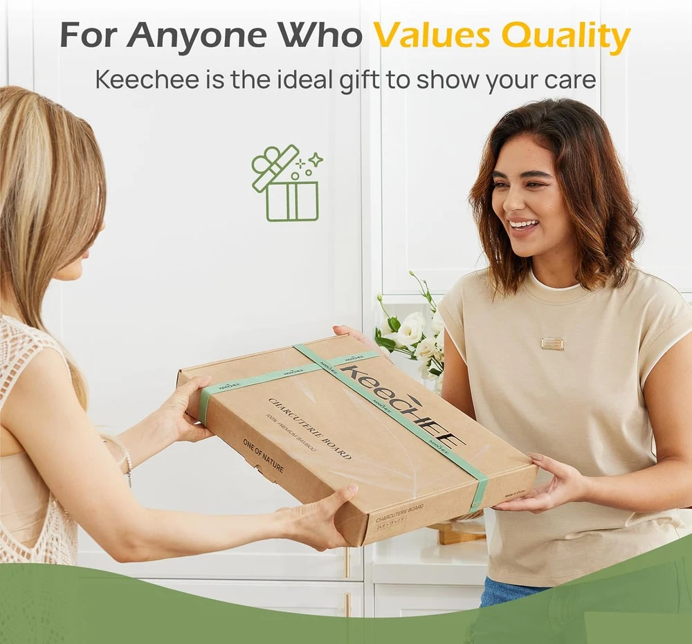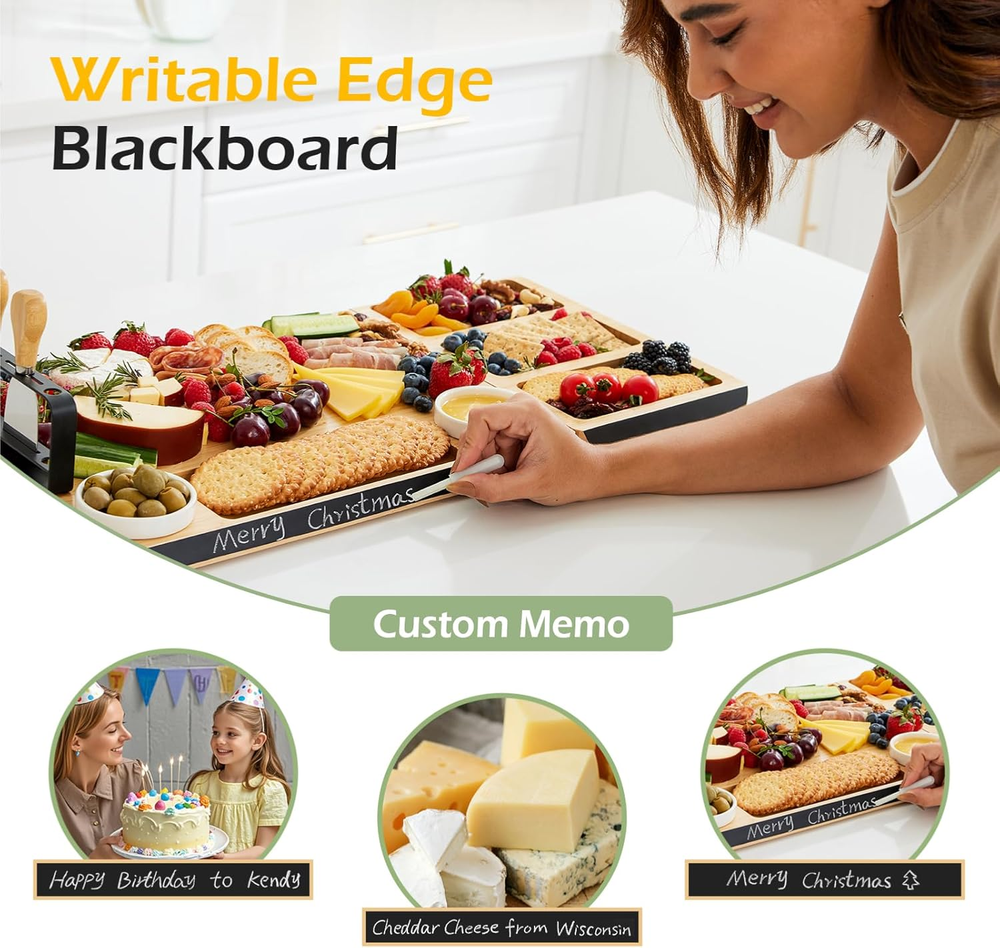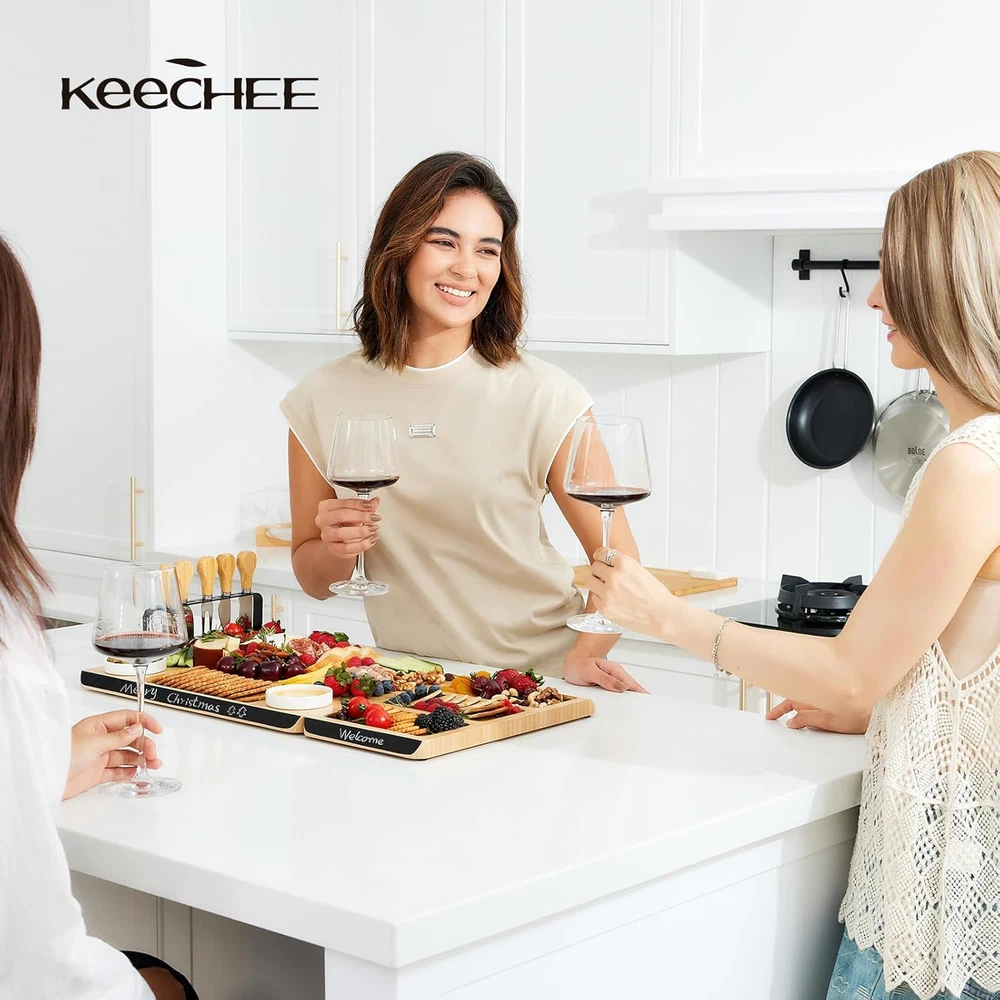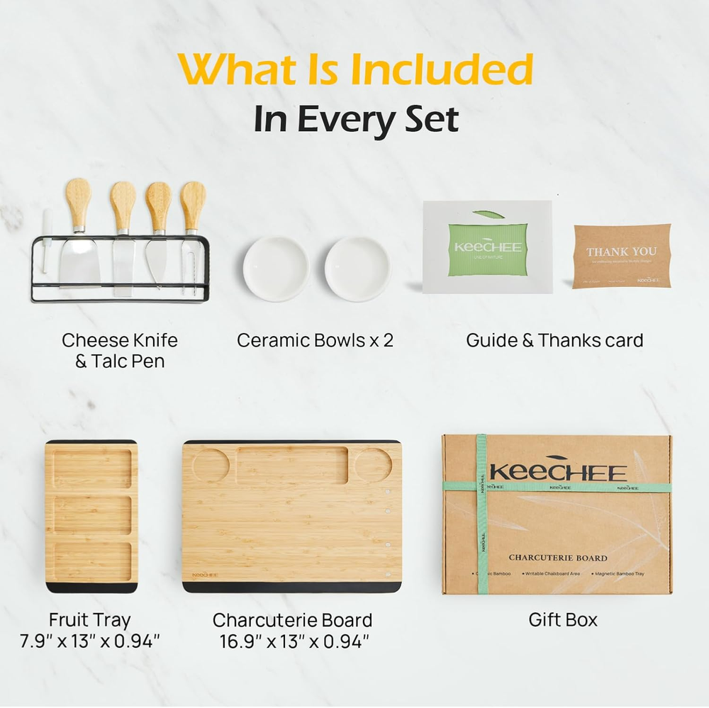 Store New Arrivals Add to Favorite View Feedback Contact Charcuterie Boards Gift Set: Large Bamboo Cheese Board Set with Chalkboard Edge & Forks Set - Ideal for Housewarming, Weddings, Bridal Showers, and Unique Gifts for Mom Description Item model number PD-CH001 Style Modern Pattern Solid Country of Origin China Embellishment Chalkboard Edge Theme Movie, Sport, Holiday, Love, Food, Fruits Is Microwaveable No Unit Count 1.0 Count Manufacture Year 2024 Material Bamboo Package Type Box Set Product Name Charcuterie Board with Knife Kit Seasons Winter, Summer, Fall, Spring, All Seasons Finish Type Polished Included Components Writing Pen, Bowl, Knife Set Reusability Reusable Is Dishwasher Safe No Item Weight 6.5 pounds Material Feature Compostable, Organic Occasion Mother's Day, Friendship Day, Wedding, Birthday, Women's Day Special Feature Dairy Use, Organic, BPA Free, Chalkboard Edge, Eco-Friendly Color Natural Shape Rectangular Recommended Uses For Product Pizza, Bread And Butter, Charcuterie, Fruit, Cake, Sushi, Cheese, Snack, Desserts, Chip And Dip Tray, Food Net Content Weight 6.5 Pounds Product Dimensions 24.8"L x 13"W x 0.94"Th Product Care Instructions Hand Wash Only Size X-Large 🖊 Charcuterie Board With Custom Labels : Elevate your entertaining game with our innovative chalkboard edge. Write personalized messages or label delicious sections, adding a unique touch to your gatherings. 🧲 Magnetic Boards for Easy Serving Boards : Enjoy the convenience of our dual magnetic boards that securely connect. Easily switch between the large 16.9"x13" charcuterie board and the smaller 7.9"x13" fruit platter for versatile serving options. 🎁 Perfect Gift for Housewarmings & Weddings : Delight friends and family with the Keechee charcuterie board set, beautifully packaged and ideal for housewarmings, weddings, birthdays, and holidays. It's a gift that combines elegance with functionality! 🍇 Cheese Board for Home : Impress your guests by arranging a stunning display of cured meats, artisanal cheeses, and fresh fruits. Our charcuterie board transforms any spread into a feast for the eyes, making every occasion memorable. 🛡 Non-Slip Feet: Say goodbye to spills and messes! Our charcuterie board features silicone non-slip feet, keeping everything firmly in place during your gatherings. No more worrying about accidental slips! ✨ Smooth Edges for Safe Handling : Safety and comfort come first! With meticulously crafted smooth edges, our cheese board prevents splinters and ensures safe handling, allowing you to enjoy your food without any worries. 🌍 Sustainable Bamboo Construction : Made from sustainable bamboo, the Keechee charcuterie board is not only stylish but also environmentally conscious. Enjoy peace of mind knowing you're choosing a product that's kind to our planet! 🧼 Easy to Clean Charcuterie : Our non-porous and stain-resistant surface makes cleanup a breeze. Spend less time scrubbing and more time enjoying your delicious creations with friends and family. 🥳 Versatile Use : Whether it's a cozy family dinner or a lively outdoor picnic, our charcuterie board is perfect for all occasions. Create unforgettable moments with ease, wherever you go! 📞 Unmatched Customer Support : We stand behind our product quality! Our responsive customer support team is always ready to assist you, ensuring your experience with Keechee is nothing short of exceptional. Product Description The video showcases the product in use. The video guides you through product setup. The video compares multiple products. The video shows the product being unpacked. Snack & Share: A Keechee Charcuterie Celebration 1 Absolutely Creative 2 Write Your Idea 3 Simple 4 Convenient 5 Inside Box Cheese Boards Charcuterie Boards Gift Set Family night means great food and even better memories. Create an inviting snack platter with Keechee’s board and get everyone gathered around. Cheese lovers, unite! The Keechee board gives you all the space you need to show off your favorite cheeses and pairings. Brie or Gouda? Looking for a gift that’s as beautiful as it is practical? The Keechee Charcuterie Board Set is the ultimate present for foodies, hosts, and anyone who loves a little extra style in the kitchen. Gourmet Showcase for Memorable Gatherings Elevate your culinary presentation with Keechee's beautiful serving board set. Whether you're serving up air-dried meats, artisanal cheeses, fresh fruit or savory crackers, it turns every platter into a feast for the eyes. Whether it's a dinner party or a cozy family gathering, this board invites everyone to savor flavors and textures, creating moments of pure delight. Keechee Charcuterie Board: The Perfect Gift For Memorable Gatherings ABOUT US Welcome to ChuggaBizz, your global one-stop shop for quality products! We offer a wide variety of items from electronics to fashion, home decor to outdoor gear, and more. Our mission is to provide a seamless shopping experience, competitive prices, and excellent customer service. We ship worldwide, ensuring hassle-free shopping for our international customers. Customer satisfaction is our top priority, and our dedicated team is here to assist you. Thank you for choosing ChuggaBizz, and happy shopping! SHIPPING It's Important to start by clarifying that your order processing times are separate from the shipping times they see at checkout. About handling and transit time After you confirm the order, we will process your order within 1–3 days (Monday-Sunday). So please allow us to send your order within 7-9 business days after placing the order. The order cut-off time The order cut-off time will be 12:00 AM Pacific Standard Time (Los Angeles) every day. About Shipping fee Free Shipping On All Orders. Parcels Damaged In Transit If you find a parcel is damaged in transit, if possible, please reject the parcel from the courier and get in touch with our customer service for a replacement or re-delivery. If the parcel has been delive