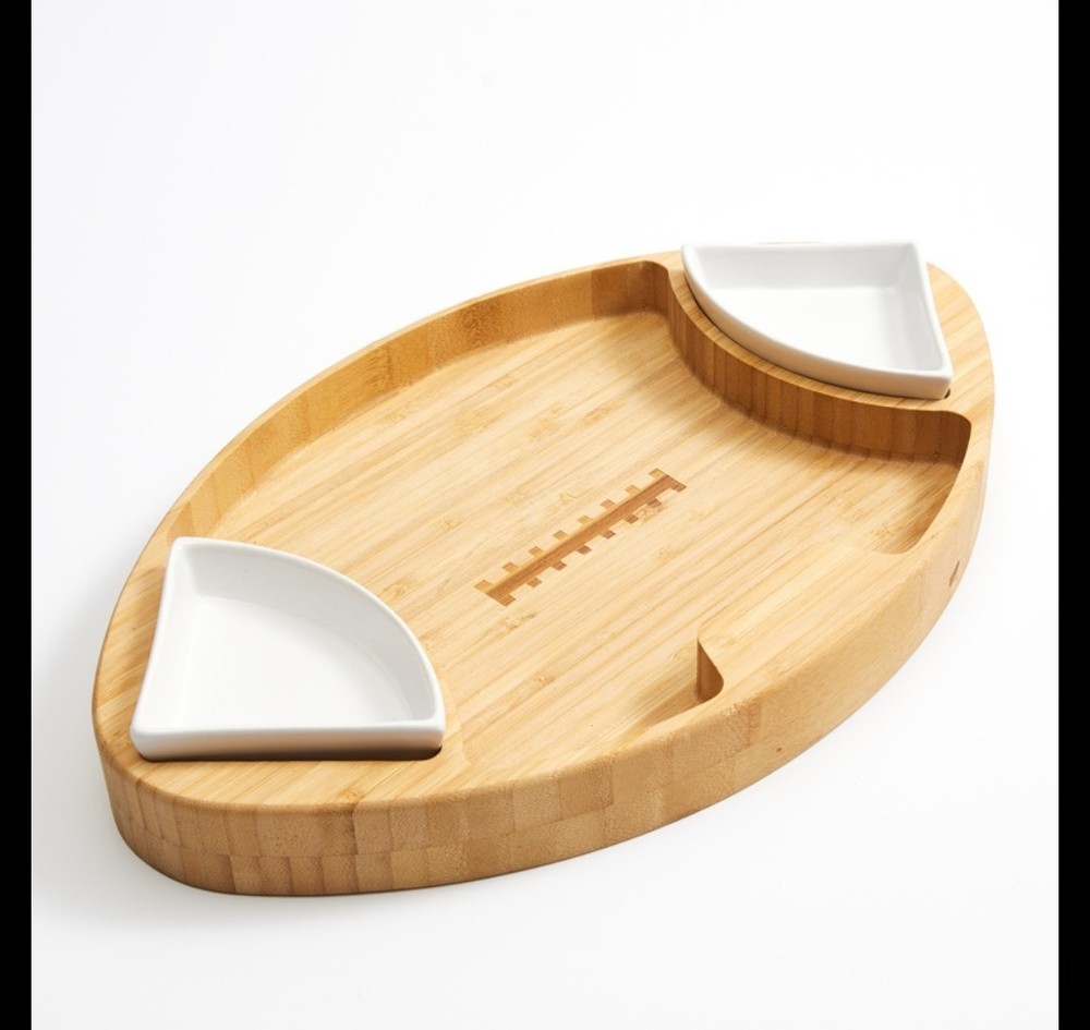 First picture shown is a stock photo* Showcase your love for the game with the Chef's Counter Bamboo Football Serving Tray, an ideal choice for any sports enthusiast. This large, oval tray is crafted from a blend of bamboo and ceramic, presenting a rustic yet durable surface that's perfect for serving appetizers, entrees, or desserts. The unique football theme, with ceramic bowls on each end, adds a playful touch to your hosting. Whether you're throwing a family gathering or a festive party, this tray suits any occasion. Its brown color complements a variety of decors, while the tray's intricate design ensures your culinary creations are the star of the show. Made in China, this set of three includes the serving tray and two ceramic bowls, ready to make your serving process both stylish and simple.