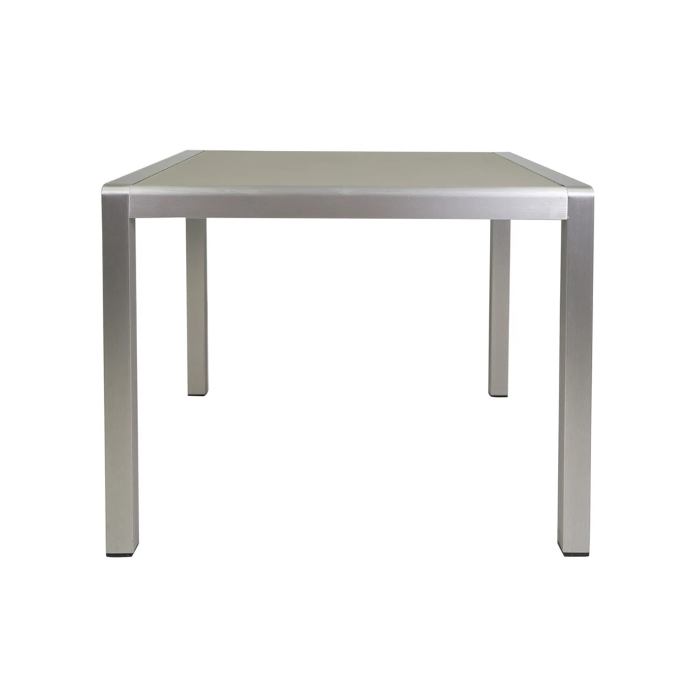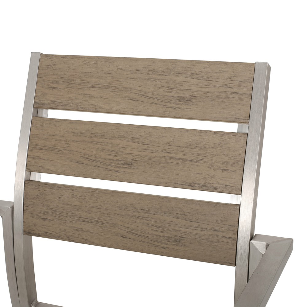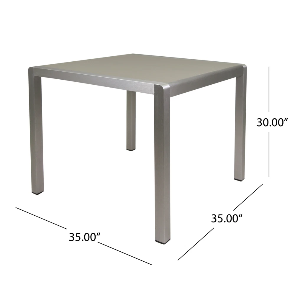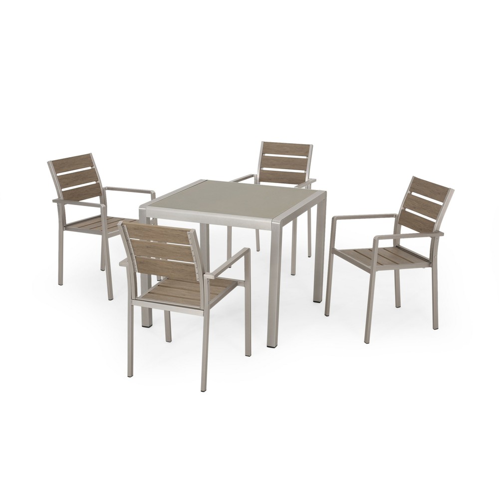 Candlelit dinners under a starry night sky can be achieved with our charming dining set. Made with aluminum, our durable, high-quality dining set features beautiful slatted seating and a tempered glass tabletop to bring a sleek touch and delightful convenience to your backyard or patio space. Perfect for smaller spaces, this set will match any outdoor furniture while also providing incredible durability and unparalleled style. Showcasing a classic open slat design and edgy modern frame, our set is the perfect addition to any sophisticated outdoor decor. MODERN DESIGN: With clean, precise lines, our dining set is the ideal modern accessory for your outdoor space. Finished with an exquisite tempered glass tabletop and smooth aluminum frames, this set not only offers a chic, minimalistic look but also provides incredible structure. ALUMINUM FRAME: This set is built with aluminum, creating a lightweight and stable frame. This material is rust-resistant which will further extend the life of your product. FAUX WOOD: This wood alternative is a blend of plastics and wood that is not only eco-friendly but is also low-maintenance. Our chairs use this material to give the appearance of a beautiful wood look without the high upkeep. TEMPERED GLASS: The tabletop features a tempered glass top that offers a gorgeous opaque look. This glass is made to be stronger and safer than regular glass, making this more resistant to breakage and shattering. ASSEMBLY REQUIRED: Some assembly is required for this dining set. All of the instructions and tools needed for assembly are included. This set includes one dining table and four chairs. Includes: One (1) Dining Table and Four (4) Dining Chairs Material: Aluminum Table Top Material: Tempered Glass Seat Material: Faux Wood Finish: Silver Seat Finish: Natural Hand-Crafted Details Assembly Required Table Dimensions: 35.00 inches deep x 35.00 inches wide x 30.00 inches high Chair Dimensions: 21.25 inches deep x 22.75 inches wide x 34.75 inches high Seat Dimensions: 17.50 inches deep x 19.00 inches wide x 17.75 inches high Arm Height: 25.75 inches