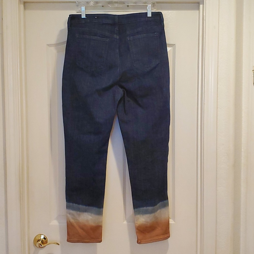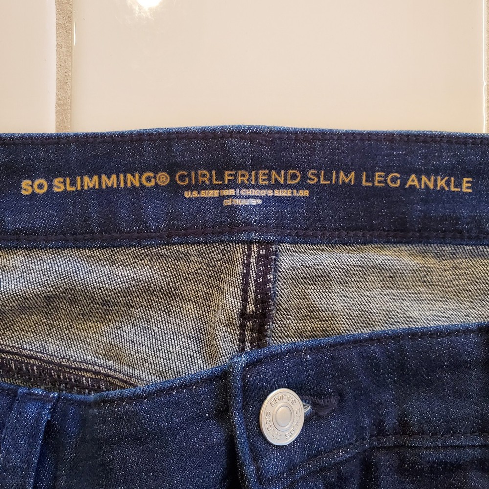 These Chico's So Slimming Girlfriend slim leg ankle jeans are available in a size 1.5R (compares to 10R). The slimming design, featuring a high rise and 5-pocket design, is perfect for any modern woman while the ombre dip dye adds a touch of the 60s and 70s. Made from a blend of polyester, spandex, and cotton for easy care and stretch. These jeans are perfect for any season. The zip and button closure ensures a secure fit, while the 28.5 inch inseam, 34 inch waist and 39.75 inch length provide a comfortable and flattering fit. Excellent Used Condition. They do not look as though they have ever been worn, so they might be new without tags but we can't confirm. Shipped with USPS Ground Advantage or eBay's International Shipping Program depending on your location.